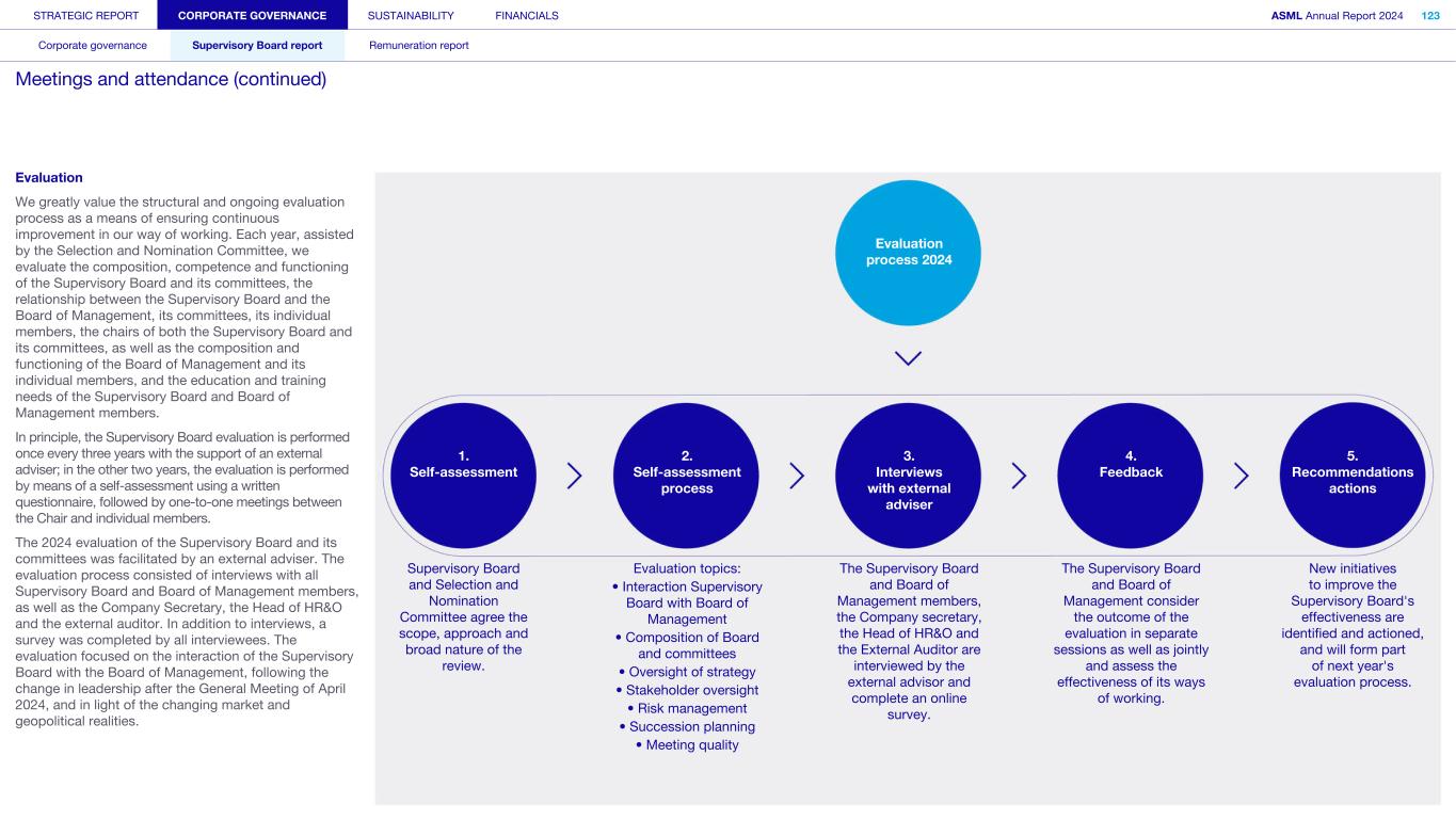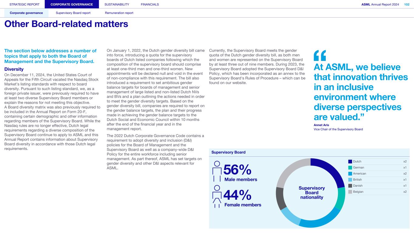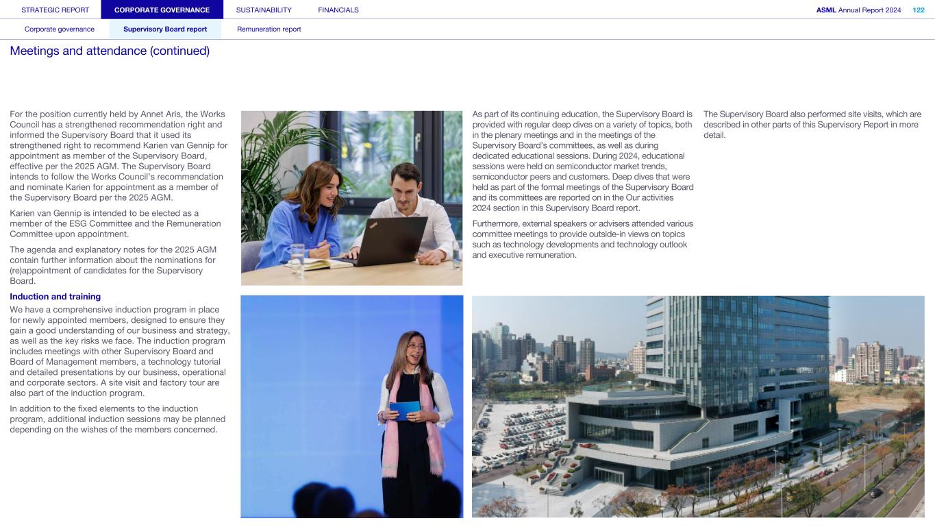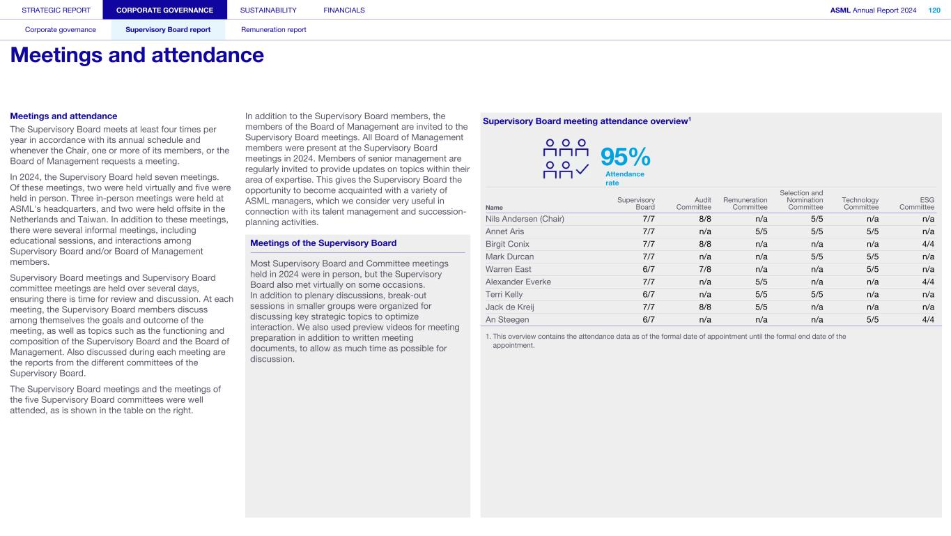 Our Supervisory Board supervises the Board of Management and the general course of affairs of ASML and our subsidiaries. The Supervisory Board also supports the Board of Management with advice. In fulfilling its role and responsibilities, the Supervisory Board takes into consideration the interests of ASML and our business, as well as the relevant interests of our stakeholders. In our two-tier structure, the Supervisory Board is a separate and independent body from the Board of Management and from ASML. No member of the Supervisory Board personally maintains a business relationship with ASML, other than as a member of the Supervisory Board. The Supervisory Board currently consists of nine members, with the minimum being three. In performing its tasks, the Supervisory Board focuses on matters including our corporate strategy, aimed at sustainable long-term value creation and its execution; the staffing of and succession planning for the Board of Management; the management of risks inherent to our business activities; the financial reporting process; compliance with applicable legislation and regulations; our culture and the activities of the Board of Management in that regard; the relationship with shareholders and other stakeholders; and environmental, social and governance (ESG) aspects important for ASML. Important management decisions – such as setting the operational and financial objectives, the strategy designed to achieve these objectives, major investments, budget, and the issue, repurchase and cancellation of shares – require the Supervisory Board’s approval. The Supervisory Board is governed by its Rules of Procedure. Items covered in these rules include the responsibilities of the Supervisory Board and its committees, the composition of the Supervisory Board and its committees, logistics surrounding the meetings, the meeting attendance of members of the Supervisory Board, the rotation schedule for these members and the committee charters. The Supervisory Board’s Rules of Procedure and the committee charters are regularly reviewed and, if needed, amended. The Audit Committee charter is reviewed annually to confirm that it still complies with applicable rules and regulations, including those relating to the Sarbanes-Oxley Act. Read more information on the meetings and activities of the Supervisory Board in 2024 in Supervisory Board report – Meetings and attendance Appointments Members of the Supervisory Board are appointed by the General Meeting based on binding nominations proposed by the Supervisory Board. When nominating persons for (re)appointment, the Supervisory Board checks whether the candidates fit the Supervisory Board’s profile, which is available in the Governance section of our website. The General Meeting may reject binding nominations by way of a resolution adopted with an absolute majority of the votes cast, representing at least one-third of our outstanding share capital. If the votes cast in favor of such a resolution do not represent at least one-third of the total outstanding capital, a new shareholders’ meeting can be convened – at which the nomination can be overruled by an absolute majority. The Supervisory Board generally informs the General Meeting and the Works Council about upcoming end of appointment terms at the AGM in the year preceding the actual end of the appointment term(s). This ensures the Works Council and the General Meeting have sufficient opportunity to recommend candidates for the upcoming vacancies. The Supervisory Board has the right to reject proposed recommendations. Furthermore, the Works Council has an enhanced right to make recommendations for one-third of the members of the Supervisory Board. This enhanced recommendation right implies that the Supervisory Board may only reject the Works Council’s recommendations in limited circumstances: (i) if the relevant person is unsuitable or (ii) if the Supervisory Board would not be duly composed if the recommended person were appointed. Members of the Supervisory Board serve for a maximum term of four years or a shorter period as per the Supervisory Board’s rotation schedule. Supervisory Board appointment process Stage 1 Stage 2 Stage 3 Stage 4 Stage 5 Recommendation right of GM and Works Council Announcement of nomination for appointment by SB Works Council has the right to determine its position Formal nomination for appointment by SB Appointment of SB member by GM Supervisory Board members are eligible for reappointment for another maximum term of four years, after which members may be reappointed again for a maximum period of two years. This appointment may be extended for a final term of no more than two years. The rotation schedule is available in the Governance section of our website. If the General Meeting loses confidence in the Supervisory Board, it may, by an absolute majority of the votes representing at least one-third of the total outstanding capital, withdraw its confidence in the Supervisory Board – resulting in the immediate dismissal of the entire Supervisory Board. In such a case, the Enterprise Chamber of the Amsterdam Court of Appeal shall appoint one or more members to the Supervisory Board at the request of the Board of Management. Further information about changes to the Supervisory Board‘s composition in 2024 and 2025 can be found in the Supervisory Board report Supervisory Board committees The Supervisory Board, while retaining overall responsibility, has assigned some of its tasks and responsibilities to five committees: the Audit Committee, the ESG Committee, the Remuneration Committee, the Selection and Nomination Committee, and the Technology Committee. Further information on the Supervisory Board committees can be found in the Supervisory Board report and in the charters of the committees as posted on our website STRATEGIC REPORT CORPORATE GOVERNANCE SUSTAINABILITY FINANCIALS ASML Annual Report 2024 99 Corporate governance Supervisory 