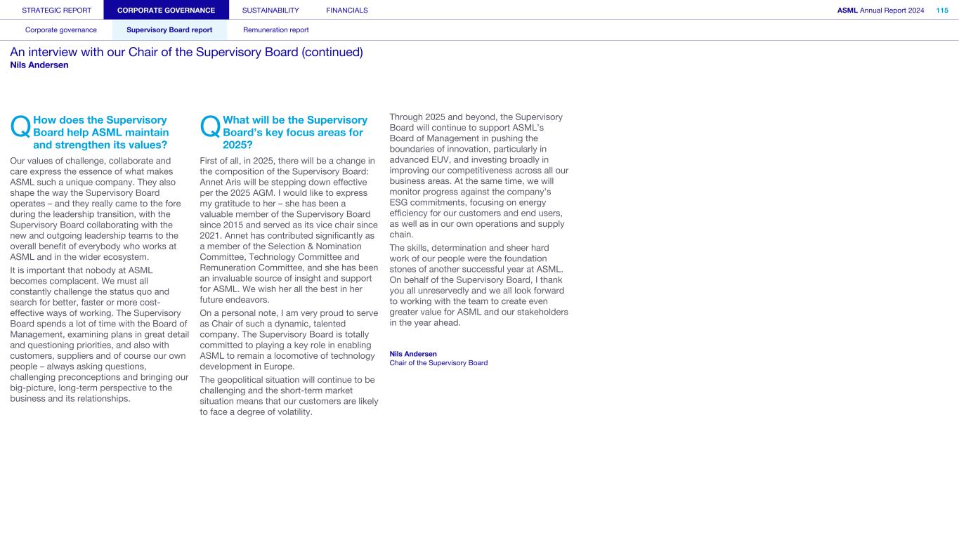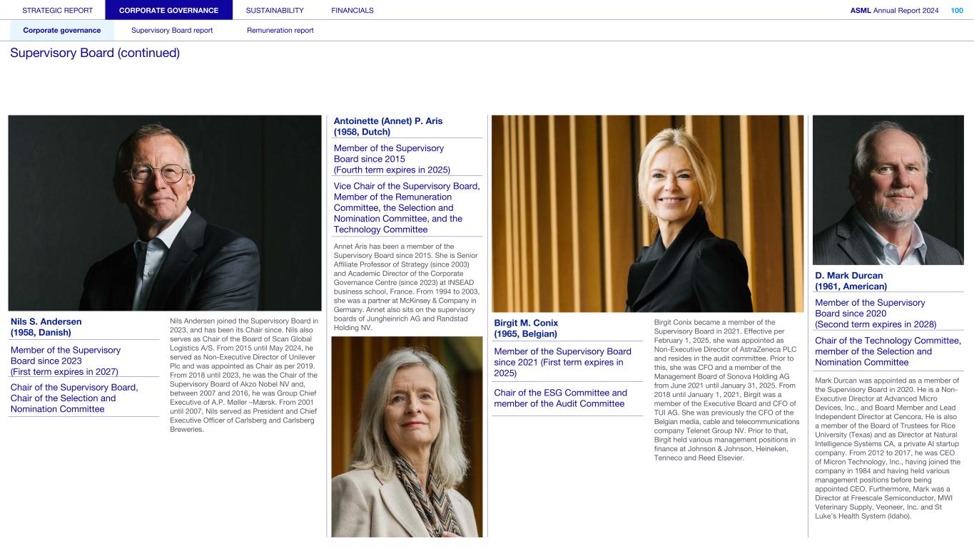 STRATEGIC REPORT CORPORATE GOVERNANCE SUSTAINABILITY FINANCIALS ASML Annual Report 2024 100 Corporate governance Supervisory Board report Remuneration report Supervisory Board (continued) Nils S. Andersen (1958, Danish) Nils Andersen joined the Supervisory Board in 2023, and has been its Chair since. Nils also serves as Chair of the Board of Scan Global Logistics A/S. From 2015 until May 2024, he served as Non-Executive Director of Unilever Plc and was appointed as Chair as per 2019. From 2018 until 2023, he was the Chair of the Supervisory Board of Akzo Nobel NV and, between 2007 and 2016, he was Group Chief Executive of A.P. Møller –Mærsk. From 2001 until 2007, Nils served as President and Chief Executive Officer of Carlsberg and Carlsberg Breweries. Member of the Supervisory Board since 2023 (First term expires in 2027) Chair of the Supervisory Board, Chair of the Selection and Nomination Committee Antoinette (Annet) P. Aris (1958, Dutch) Member of the Supervisory Board since 2015 (Fourth term expires in 2025) Vice Chair of the Supervisory Board, Member of the Remuneration Committee, the Selection and Nomination Committee, and the Technology Committee Annet Aris has been a member of the Supervisory Board since 2015. She is Senior Affiliate Professor of Strategy (since 2003) and Academic Director of the Corporate Governance Centre (since 2023) at INSEAD business school, France. From 1994 to 2003, she was a partner at McKinsey & Company in Germany. Annet also sits on the supervisory boards of Jungheinrich AG and Randstad Holding NV. Birgit M. Conix (1965, Belgian) Birgit Conix became a member of the Supervisory Board in 2021. Effective per February 1, 2025, she was appointed as Non-Executive Director of AstraZeneca PLC and resides in the audit committee. Prior to this, she was CFO and a member of the Management Board of Sonova Holding AG from June 2021 until January 31, 2025. From 2018 until January 1, 2021, Birgit was a member of the Executive Board and CFO of TUI AG. She was previously the CFO of the Belgian media, cable and telecommunications company Telenet Group NV. Prior to that, Birgit held various management positions in finance at Johnson & Johnson, Heineken, Tenneco and Reed Elsevier. Member of the Supervisory Board since 2021 (First term expires in 2025) Chair of the ESG Committee and member of the Audit Committee D. Mark Durcan (1961, American) Member of the Supervisory Board since 2020 (Second term expires in 2028) Chair of the Technology Committee, member of the Selection and Nomination Committee Mark Durcan was appointed as a member of the Supervisory Board in 2020. He is a Non- Executive Director at Advanced Micro Devices, Inc., and Board Member and Lead Independent Director at Cencora. He is also a member of the Board of Trustees for Rice University (Texas) and as Director at Natural Intelligence Systems CA, a private AI startup company. From 2012 to 2017, he was CEO of Micron Technology, Inc., having joined the company in 1984 and having held various management positions before being appointed CEO. Furthermore, Mark was a Director at Freescale Semiconductor, MWI Veterinary Supply, Veoneer, Inc. and St Luke’s Health System (Idaho).