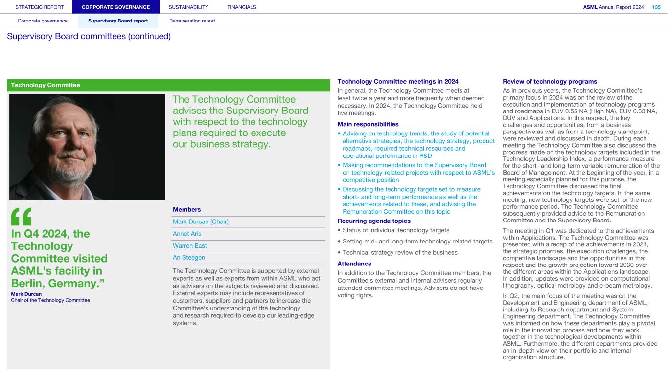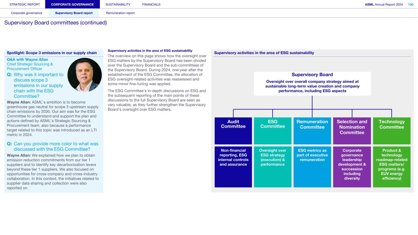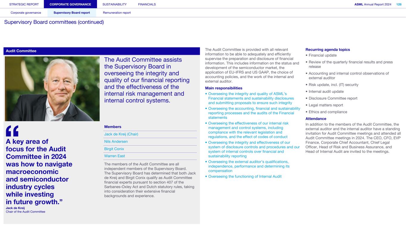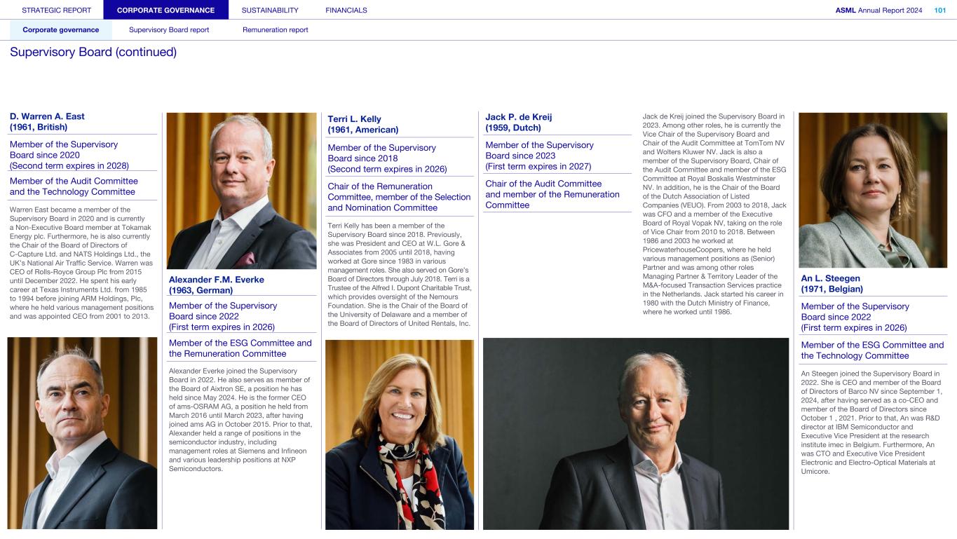 STRATEGIC REPORT CORPORATE GOVERNANCE SUSTAINABILITY FINANCIALS ASML Annual Report 2024 101 Corporate governance Supervisory Board report Remuneration report Supervisory Board (continued) D. Warren A. East (1961, British) Member of the Supervisory Board since 2020 (Second term expires in 2028) Member of the Audit Committee and the Technology Committee Warren East became a member of the Supervisory Board in 2020 and is currently a Non-Executive Board member at Tokamak Energy plc. Furthermore, he is also currently the Chair of the Board of Directors of C-Capture Ltd. and NATS Holdings Ltd., the UK’s National Air Traffic Service. Warren was CEO of Rolls-Royce Group Plc from 2015 until December 2022. He spent his early career at Texas Instruments Ltd. from 1985 to 1994 before joining ARM Holdings, Plc, where he held various management positions and was appointed CEO from 2001 to 2013. Alexander F.M. Everke (1963, German) Member of the Supervisory Board since 2022 (First term expires in 2026) Member of the ESG Committee and the Remuneration Committee Alexander Everke joined the Supervisory Board in 2022. He also serves as member of the Board of Aixtron SE, a position he has held since May 2024. He is the former CEO of ams-OSRAM AG, a position he held from March 2016 until March 2023, after having joined ams AG in October 2015. Prior to that, Alexander held a range of positions in the semiconductor industry, including management roles at Siemens and Infineon and various leadership positions at NXP Semiconductors. Terri L. Kelly (1961, American) Member of the Supervisory Board since 2018 (Second term expires in 2026) Chair of the Remuneration Committee, member of the Selection and Nomination Committee Terri Kelly has been a member of the Supervisory Board since 2018. Previously, she was President and CEO at W.L. Gore & Associates from 2005 until 2018, having worked at Gore since 1983 in various management roles. She also served on Gore’s Board of Directors through July 2018. Terri is a Trustee of the Alfred I. Dupont Charitable Trust, which provides oversight of the Nemours Foundation. She is the Chair of the Board of the University of Delaware and a member of the Board of Directors of United Rentals, Inc. Jack P. de Kreij (1959, Dutch) Jack de Kreij joined the Supervisory Board in 2023. Among other roles, he is currently the Vice Chair of the Supervisory Board and Chair of the Audit Committee at TomTom NV and Wolters Kluwer NV. Jack is also a member of the Supervisory Board, Chair of the Audit Committee and member of the ESG Committee at Royal Boskalis Westminster NV. In addition, he is the Chair of the Board of the Dutch Association of Listed Companies (VEUO). From 2003 to 2018, Jack was CFO and a member of the Executive Board of Royal Vopak NV, taking on the role of Vice Chair from 2010 to 2018. Between 1986 and 2003 he worked at PricewaterhouseCoopers, where he held various management positions as (Senior) Partner and was among other roles Managing Partner & Territory Leader of the M&A-focused Transaction Services practice in the Netherlands. Jack started his career in 1980 with the Dutch Ministry of Finance, where he worked until 1986. Member of the Supervisory Board since 2023 (First term expires in 2027) Chair of the Audit Committee and member of the Remuneration Committee An L. Steegen (1971, Belgian) Member of the Supervisory Board since 2022 (First term expires in 2026) Member of the ESG Committee and the Technology Committee An Steegen joined the Supervisory Board in 2022. She is CEO and member of the Board of Directors of Barco NV since September 1, 2024, after having served as a co-CEO and member of the Board of Directors since October 1 , 2021. Prior to that, An was R&D director at IBM Semiconductor and Executive Vice President at the research institute imec in Belgium. Furthermore, An was CTO and Executive Vice President Electronic and Electro-Optical Materials at Umicore.