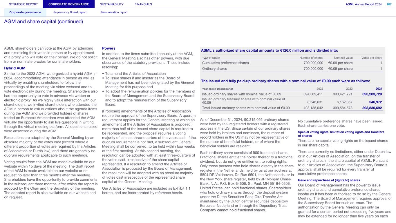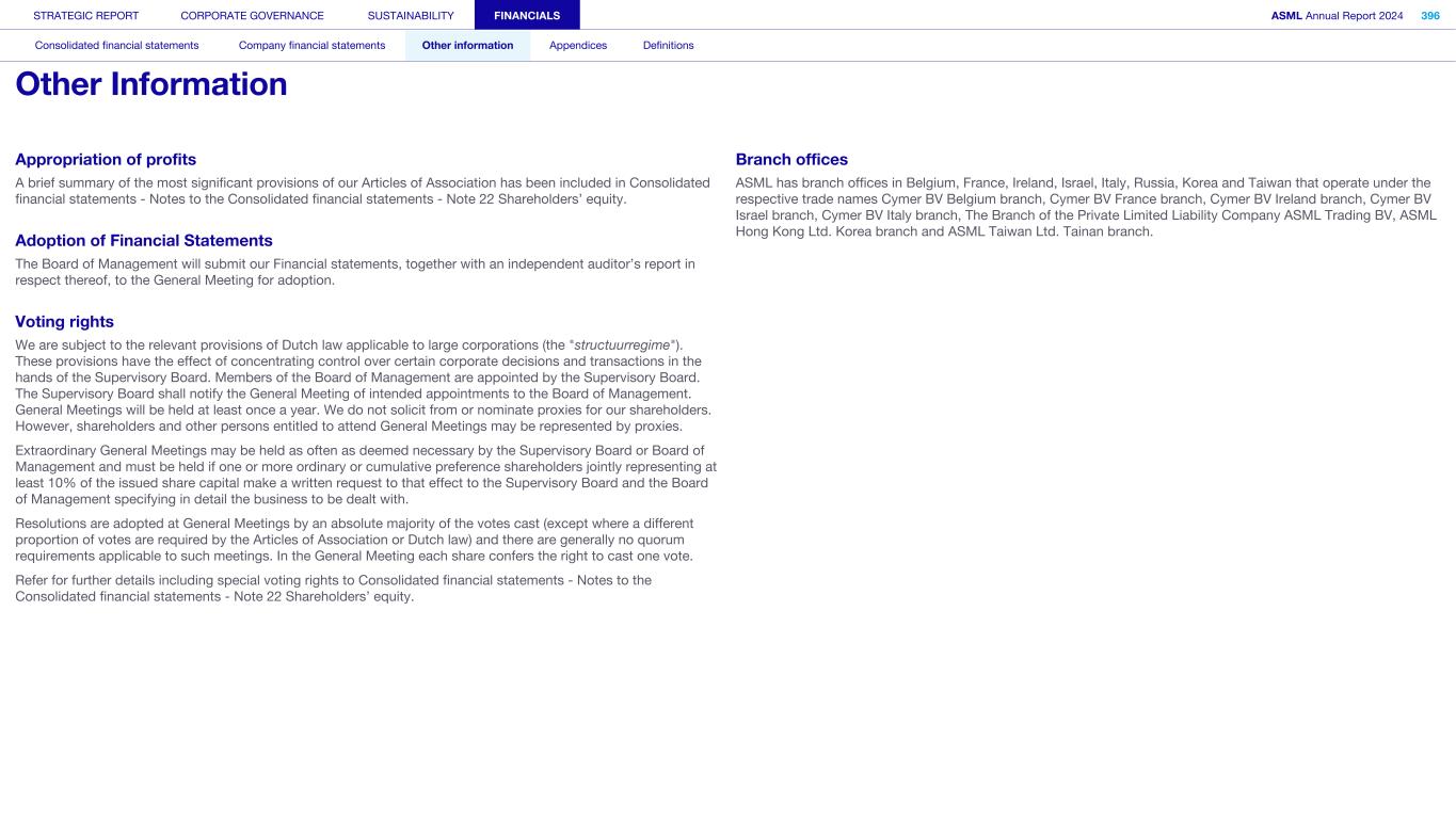 Appropriation of profits A brief summary of the most significant provisions of our Articles of Association has been included in Consolidated financial statements - Notes to the Consolidated financial statements - Note 22 Shareholders’ equity. Adoption of Financial Statements The Board of Management will submit our Financial statements, together with an independent auditor’s report in respect thereof, to the General Meeting for adoption. Voting rights We are subject to the relevant provisions of Dutch law applicable to large corporations (the "structuurregime"). These provisions have the effect of concentrating control over certain corporate decisions and transactions in the hands of the Supervisory Board. Members of the Board of Management are appointed by the Supervisory Board. The Supervisory Board shall notify the General Meeting of intended appointments to the Board of Management. General Meetings will be held at least once a year. We do not solicit from or nominate proxies for our shareholders. However, shareholders and other persons entitled to attend General Meetings may be represented by proxies. Extraordinary General Meetings may be held as often as deemed necessary by the Supervisory Board or Board of Management and must be held if one or more ordinary or cumulative preference shareholders jointly representing at least 10% of the issued share capital make a written request to that effect to the Supervisory Board and the Board of Management specifying in detail the business to be dealt with. Resolutions are adopted at General Meetings by an absolute majority of the votes cast (except where a different proportion of votes are required by the Articles of Association or Dutch law) and there are generally no quorum requirements applicable to such meetings. In the General Meeting each share confers the right to cast one vote. Refer for further details including special voting rights to Consolidated financial statements - Notes to the Consolidated financial statements - Note 22 Shareholders’ equity. Branch offices ASML has branch offices in Belgium, France, Ireland, Israel, Italy, Russia, Korea and Taiwan that operate under the respective trade names Cymer BV Belgium branch, Cymer BV France branch, Cymer BV Ireland branch, Cymer BV Israel branch, Cymer BV Italy branch, The Branch of the Private Limited Liability Company ASML Trading BV, ASML Hong Kong Ltd. Korea branch and ASML Taiwan Ltd. Tainan branch. STRATEGIC REPORT CORPORATE GOVERNANCE SUSTAINABILITY FINANCIALS ASML Annual Report 2024 396 Consolidated financial statements Company financial statements Other information Appendices Definitions Other Information