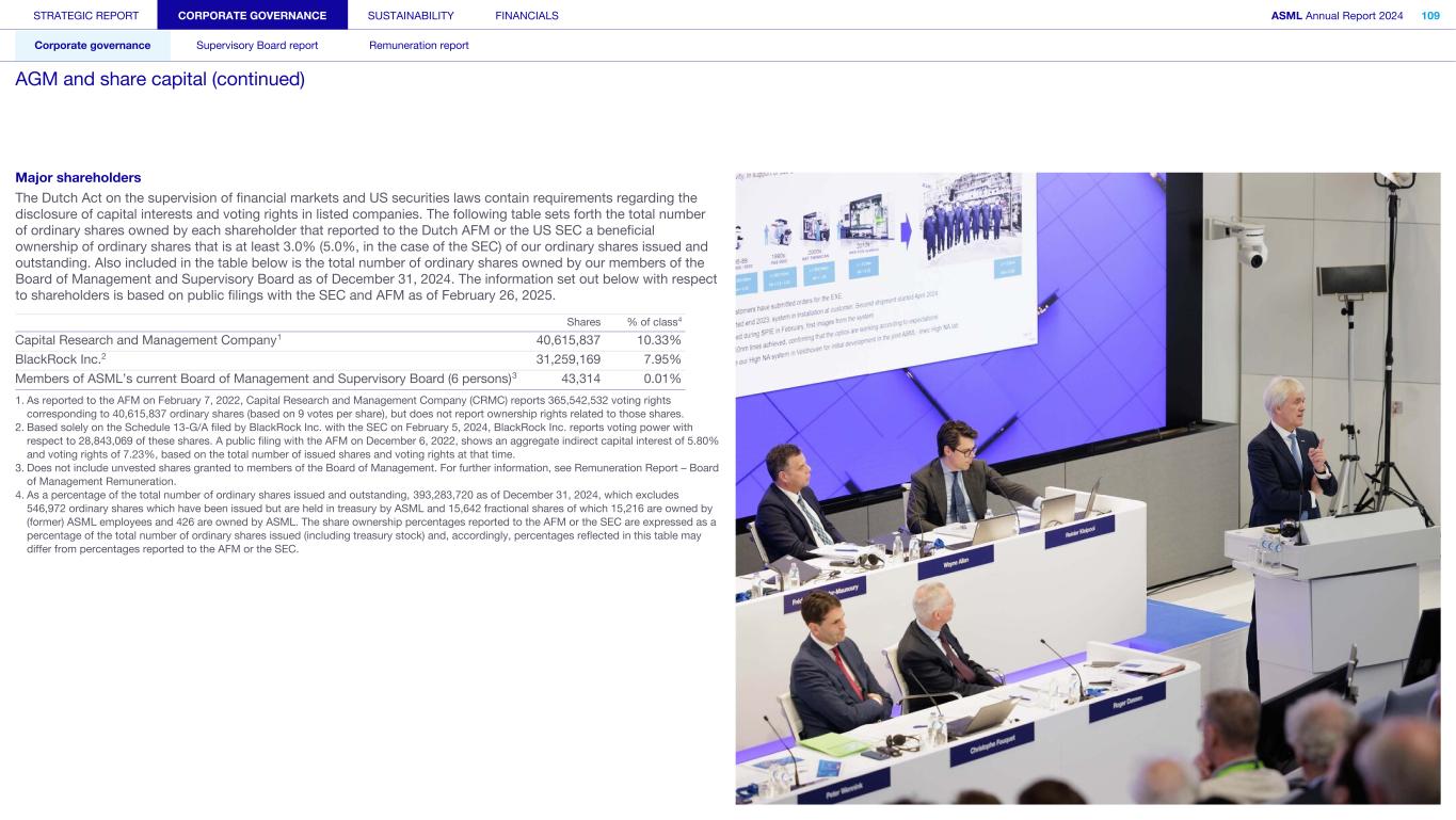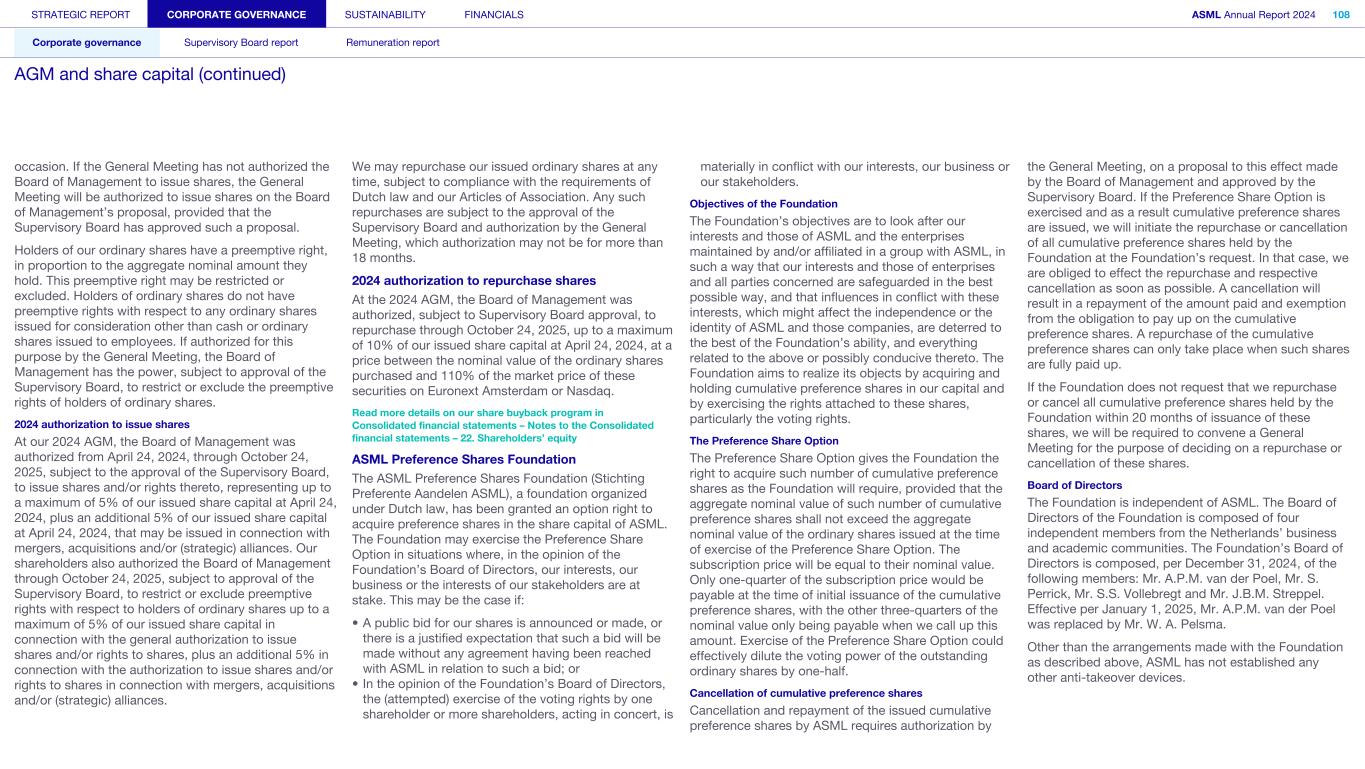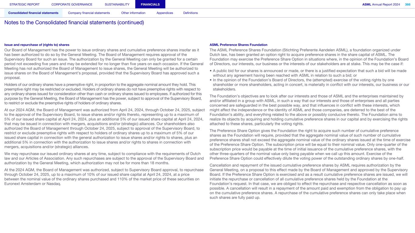 Issue and repurchase of (rights to) shares Our Board of Management has the power to issue ordinary shares and cumulative preference shares insofar as it has been authorized to do so by the General Meeting. The Board of Management requires approval of the Supervisory Board for such an issue. The authorization by the General Meeting can only be granted for a certain period not exceeding five years and may be extended for no longer than five years on each occasion. If the General Meeting has not authorized the Board of Management to issue shares, the General Meeting will be authorized to issue shares on the Board of Management’s proposal, provided that the Supervisory Board has approved such a proposal. Holders of our ordinary shares have a preemptive right, in proportion to the aggregate nominal amount they hold. This preemptive right may be restricted or excluded. Holders of ordinary shares do not have preemptive rights with respect to any ordinary shares issued for consideration other than cash or ordinary shares issued to employees. If authorized for this purpose by the General Meeting, the Board of Management has the power, subject to approval of the Supervisory Board, to restrict or exclude the preemptive rights of holders of ordinary shares. At our 2024 AGM, the Board of Management was authorized from April 24, 2024, through October 24, 2025, subject to the approval of the Supervisory Board, to issue shares and/or rights thereto, representing up to a maximum of 5% of our issued share capital at April 24, 2024, plus an additional 5% of our issued share capital at April 24, 2024, that may be issued in connection with mergers, acquisitions and/or (strategic) alliances. Our shareholders also authorized the Board of Management through October 24, 2025, subject to approval of the Supervisory Board, to restrict or exclude preemptive rights with respect to holders of ordinary shares up to a maximum of 5% of our issued share capital in connection with the general authorization to issue shares and/or rights to shares, plus an additional 5% in connection with the authorization to issue shares and/or rights to shares in connection with mergers, acquisitions and/or (strategic) alliances. We may repurchase our issued ordinary shares at any time, subject to compliance with the requirements of Dutch law and our Articles of Association. Any such repurchases are subject to the approval of the Supervisory Board and authorization by the General Meeting, which authorization may not be for more than 18 months. At the 2024 AGM, the Board of Management was authorized, subject to Supervisory Board approval, to repurchase through October 24, 2025, up to a maximum of 10% of our issued share capital at April 24, 2024, at a price between the nominal value of the ordinary shares purchased and 110% of the market price of these securities on Euronext Amsterdam or Nasdaq. ASML Preference Shares Foundation The ASML Preference Shares Foundation (Stichting Preferente Aandelen ASML), a foundation organized under Dutch law, has been granted an option right to acquire preference shares in the share capital of ASML. The Foundation may exercise the Preference Share Option in situations where, in the opinion of the Foundation’s Board of Directors, our interests, our business or the interests of our stakeholders are at stake. This may be the case if: • A public bid for our shares is announced or made, or there is a justified expectation that such a bid will be made without any agreement having been reached with ASML in relation to such a bid; or • In the opinion of the Foundation’s Board of Directors, the (attempted) exercise of the voting rights by one shareholder or more shareholders, acting in concert, is materially in conflict with our interests, our business or our stakeholders. The Foundation’s objectives are to look after our interests and those of ASML and the enterprises maintained by and/or affiliated in a group with ASML, in such a way that our interests and those of enterprises and all parties concerned are safeguarded in the best possible way, and that influences in conflict with these interests, which might affect the independence or the identity of ASML and those companies, are deterred to the best of the Foundation’s ability, and everything related to the above or possibly conducive thereto. The Foundation aims to realize its objects by acquiring and holding cumulative preference shares in our capital and by exercising the rights attached to these shares, particularly the voting rights. The Preference Share Option gives the Foundation the right to acquire such number of cumulative preference shares as the Foundation will require, provided that the aggregate nominal value of such number of cumulative preference shares shall not exceed the aggregate nominal value of the ordinary shares issued at the time of exercise of the Preference Share Option. The subscription price will be equal to their nominal value. Only one-quarter of the subscription price would be payable at the time of initial issuance of the cumulative preference shares, with the other three-quarters of the nominal value only being payable when we call up this amount. Exercise of the Preference Share Option could effectively dilute the voting power of the outstanding ordinary shares by one-half. Cancellation and repayment of the issued cumulative preference shares by ASML requires authorization by the General Meeting, on a proposal to this effect made by the Board of Management and approved by the Supervisory Board. If the Preference Share Option is exercised and as a result cumulative preference shares are issued, we will initiate the repurchase or cancellation of all cumulative preference shares held by the Foundation at the Foundation’s request. In that case, we are obliged to effect the repurchase and respective cancellation as soon as possible. A cancellation will result in a repayment of the amount paid and exemption from the o