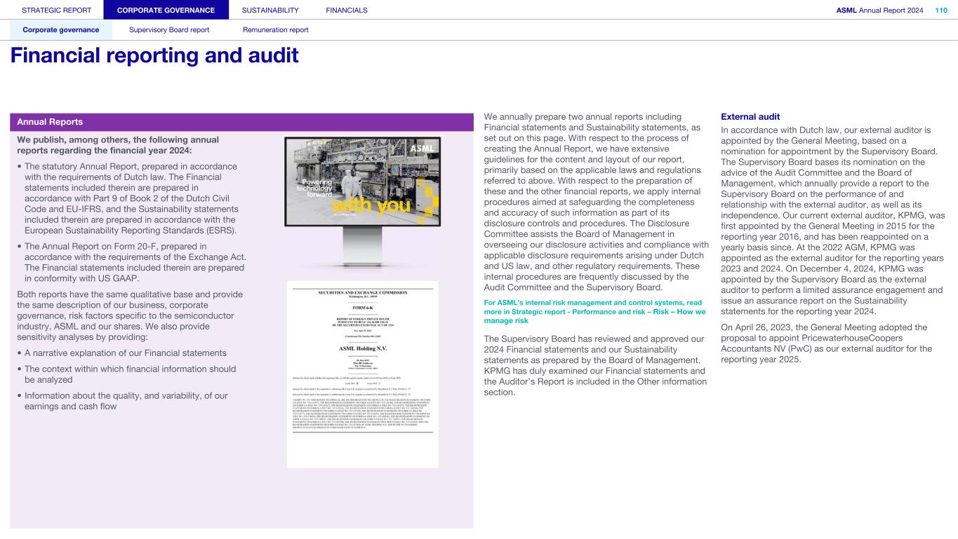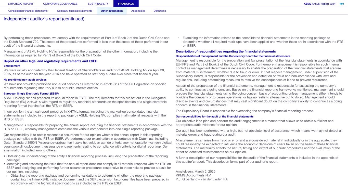 By performing these procedures, we comply with the requirements of Part 9 of Book 2 of the Dutch Civil Code and the Dutch Standard 720. The scope of the procedures performed is less than the scope of those performed in our audit of the financial statements. Management of ASML Holding NV is responsible for the preparation of the other information, including the information as required by Part 9 of Book 2 of the Dutch Civil Code. Report on other legal and regulatory requirements and ESEF Engagement We were initially appointed by the General Meeting of Shareholders as auditor of ASML Holding NV on April 30, 2015, as of the audit for the year 2016 and have operated as statutory auditor ever since that financial year. No prohibited non-audit services We have not provided prohibited non-audit services as referred to in Article 5(1) of the EU Regulation on specific requirements regarding statutory audits of public-interest entities. European Single Electronic Format (ESEF) ASML Holding NV has prepared its annual report in ESEF. The requirements for this are set out in the Delegated Regulation (EU) 2019/815 with regard to regulatory technical standards on the specification of a single electronic reporting format (hereinafter: the RTS on ESEF). In our opinion the annual report prepared in XHTML format, including the marked-up consolidated financial statements as included in the reporting package by ASML Holding NV, complies in all material respects with the RTS on ESEF. Management is responsible for preparing the annual report including the financial statements in accordance with the RTS on ESEF, whereby management combines the various components into one single reporting package. Our responsibility is to obtain reasonable assurance for our opinion whether the annual report in this reporting package complies with the RTS on ESEF. We performed our examination in accordance with Dutch law, including Dutch Standard 3950N ’Assurance-opdrachten inzake het voldoen aan de criteria voor het opstellen van een digitaal verantwoordingsdocument’ (assurance engagements relating to compliance with criteria for digital reporting). Our examination included among others: • Obtaining an understanding of the entity's financial reporting process, including the preparation of the reporting package; • Identifying and assessing the risks that the annual report does not comply in all material respects with the RTS on ESEF and designing and performing further assurance procedures responsive to those risks to provide a basis for our opinion, including: ◦ Obtaining the reporting package and performing validations to determine whether the reporting package containing the Inline XBRL instance document and the XBRL extension taxonomy files have been prepared in accordance with the technical specifications as included in the RTS on ESEF; ◦ Examining the information related to the consolidated financial statements in the reporting package to determine whether all required mark-ups have been applied and whether these are in accordance with the RTS on ESEF. Description of responsibilities regarding the financial statements Responsibilities of management and the Supervisory Board for the financial statements Management is responsible for the preparation and fair presentation of the financial statements in accordance with EU-IFRS and Part 9 of Book 2 of the Dutch Civil Code. Furthermore, management is responsible for such internal control as management determines is necessary to enable the preparation of the financial statements that are free from material misstatement, whether due to fraud or error. In that respect management, under supervision of the Supervisory Board, is responsible for the prevention and detection of fraud and non-compliance with laws and regulations, including determining measures to resolve the consequences of it and to prevent recurrence. As part of the preparation of the financial statements, management is responsible for assessing the company’s ability to continue as a going concern. Based on the financial reporting frameworks mentioned, management should prepare the financial statements using the going concern basis of accounting unless management either intends to liquidate the company or to cease operations, or has no realistic alternative but to do so. Management should disclose events and circumstances that may cast significant doubt on the company’s ability to continue as a going concern in the financial statements. The Supervisory Board is responsible for overseeing the company’s financial reporting process. Our responsibilities for the audit of the financial statements Our objective is to plan and perform the audit engagement in a manner that allows us to obtain sufficient and appropriate audit evidence for our opinion. Our audit has been performed with a high, but not absolute, level of assurance, which means we may not detect all material errors and fraud during our audit. Misstatements can arise from fraud or error and are considered material if, individually or in the aggregate, they could reasonably be expected to influence the economic decisions of users taken on the basis of these financial statements. The materiality affects the nature, timing and extent of our audit procedures and the evaluation of the effect of identified misstatements on our opinion. A further description of our responsibilities for the audit of the financial statements is included in the appendix of this auditor’s report. This description forms part of our auditor’s report. Amstelveen, March 5, 2025 KPMG Accountants N.V. P.J. Groenland – van der Linden RA STRATEGIC REPORT CORPORATE GOVERNANCE SUSTAINABILITY FINANCIALS ASML Annual Report 2024 401 Consolidated financial statements Company financial statements Other information Appendices Definitions Independent auditor's report (continued)