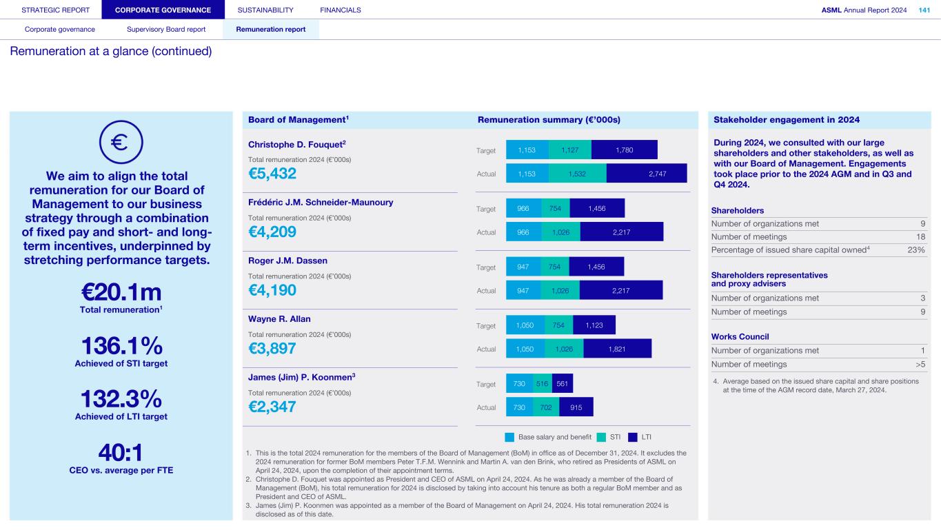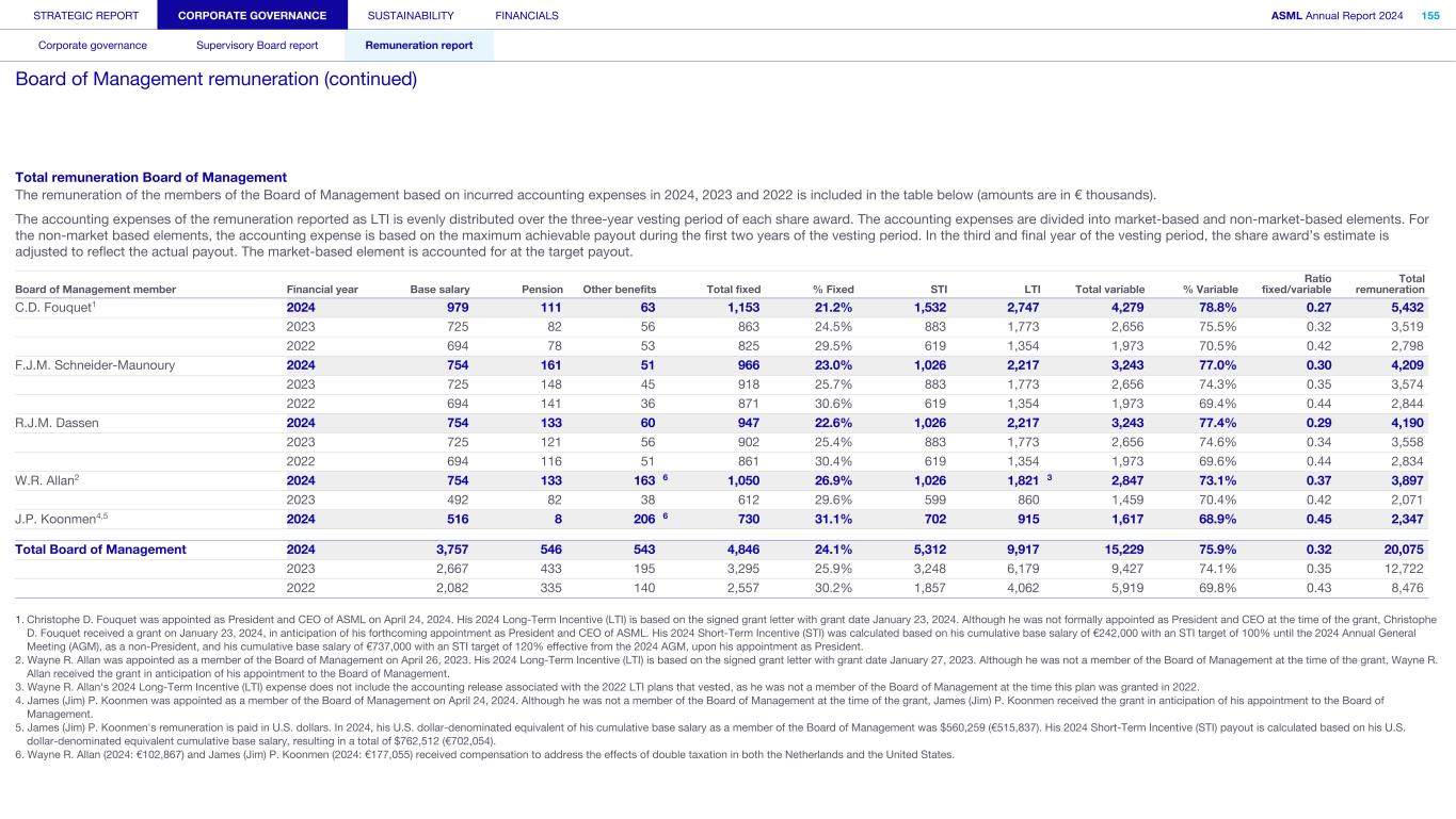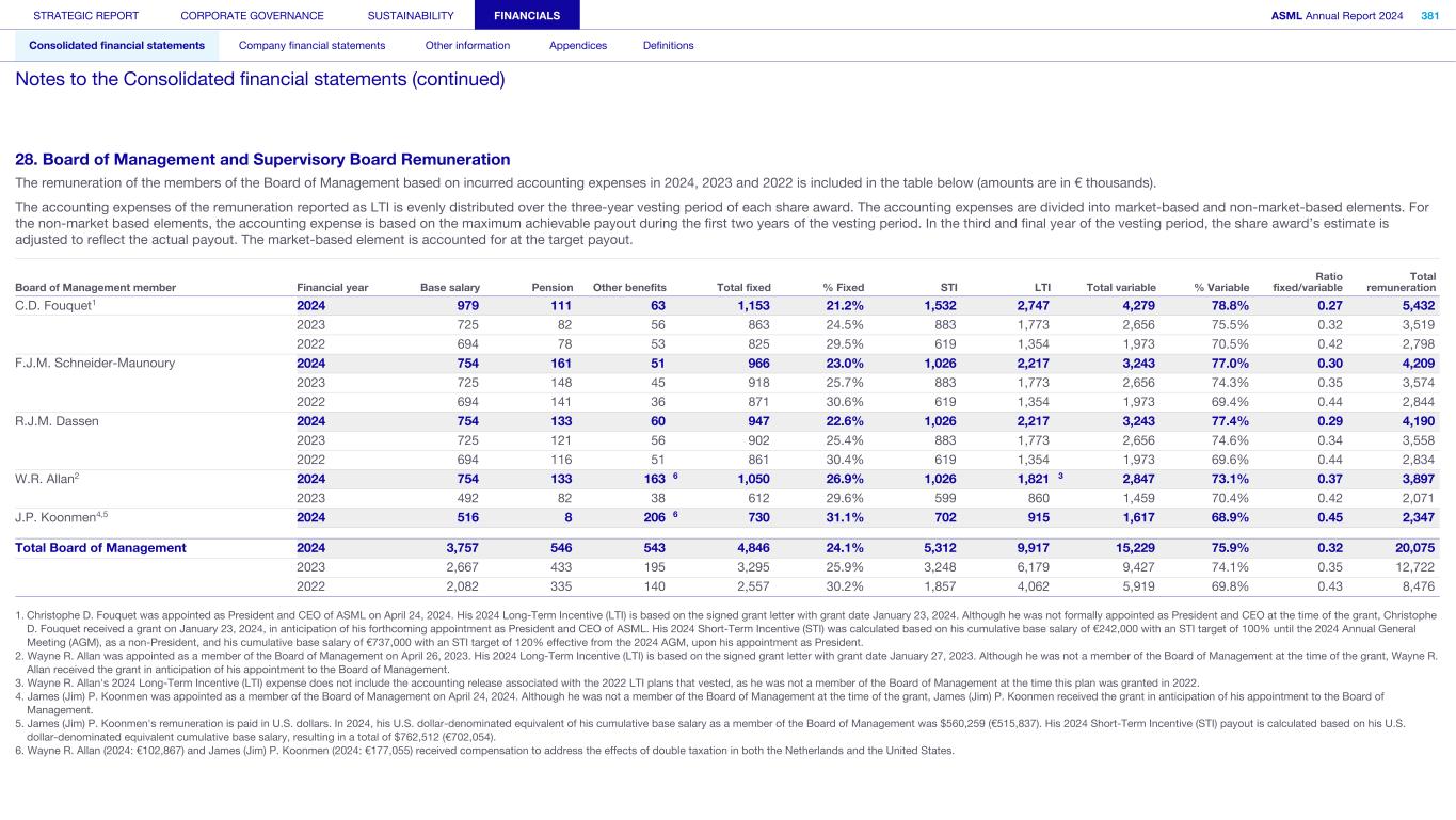 28. Board of Management and Supervisory Board Remuneration The remuneration of the members of the Board of Management based on incurred accounting expenses in 2024, 2023 and 2022 is included in the table below (amounts are in € thousands). The accounting expenses of the remuneration reported as LTI is evenly distributed over the three-year vesting period of each share award. The accounting expenses are divided into market-based and non-market-based elements. For the non-market based elements, the accounting expense is based on the maximum achievable payout during the first two years of the vesting period. In the third and final year of the vesting period, the share award’s estimate is adjusted to reflect the actual payout. The market-based element is accounted for at the target payout. Board of Management member Financial year Base salary Pension Other benefits Total fixed % Fixed STI LTI Total variable % Variable Ratio fixed/variable Total remuneration C.D. Fouquet1 2024 979 111 63 1,153 21.2% 1,532 2,747 4,279 78.8% 0.27 5,432 2023 725 82 56 863 24.5% 883 1,773 2,656 75.5% 0.32 3,519 2022 694 78 53 825 29.5% 619 1,354 1,973 70.5% 0.42 2,798 F.J.M. Schneider-Maunoury 2024 754 161 51 966 23.0% 1,026 2,217 3,243 77.0% 0.30 4,209 2023 725 148 45 918 25.7% 883 1,773 2,656 74.3% 0.35 3,574 2022 694 141 36 871 30.6% 619 1,354 1,973 69.4% 0.44 2,844 R.J.M. Dassen 2024 754 133 60 947 22.6% 1,026 2,217 3,243 77.4% 0.29 4,190 2023 725 121 56 902 25.4% 883 1,773 2,656 74.6% 0.34 3,558 2022 694 116 51 861 30.4% 619 1,354 1,973 69.6% 0.44 2,834 W.R. Allan2 2024 754 133 163 6 1,050 26.9% 1,026 1,821 3 2,847 73.1% 0.37 3,897 2023 492 82 38 612 29.6% 599 860 1,459 70.4% 0.42 2,071 J.P. Koonmen4,5 2024 516 8 206 6 730 31.1% 702 915 1,617 68.9% 0.45 2,347 Total Board of Management 2024 3,757 546 543 4,846 24.1% 5,312 9,917 15,229 75.9% 0.32 20,075 2023 2,667 433 195 3,295 25.9% 3,248 6,179 9,427 74.1% 0.35 12,722 2022 2,082 335 140 2,557 30.2% 1,857 4,062 5,919 69.8% 0.43 8,476 1. Christophe D. Fouquet was appointed as President and CEO of ASML on April 24, 2024. His 2024 Long-Term Incentive (LTI) is based on the signed grant letter with grant date January 23, 2024. Although he was not formally appointed as President and CEO at the time of the grant, Christophe D. Fouquet received a grant on January 23, 2024, in anticipation of his forthcoming appointment as President and CEO of ASML. His 2024 Short-Term Incentive (STI) was calculated based on his cumulative base salary of €242,000 with an STI target of 100% until the 2024 Annual General Meeting (AGM), as a non-President, and his cumulative base salary of €737,000 with an STI target of 120% effective from the 2024 AGM, upon his appointment as President. 2. Wayne R. Allan was appointed as a member of the Board of Management on April 26, 2023. His 2024 Long-Term Incentive (LTI) is based on the signed grant letter with grant date January 27, 2023. Although he was not a member of the Board of Management at the time of the grant, Wayne R. Allan received the grant in anticipation of his appointment to the Board of Management. 3. Wayne R. Allan's 2024 Long-Term Incentive (LTI) expense does not include the accounting release associated with the 2022 LTI plans that vested, as he was not a member of the Board of Management at the time this plan was granted in 2022. 4. James (Jim) P. Koonmen was appointed as a member of the Board of Management on April 24, 2024. Although he was not a member of the Board of Management at the time of the grant, James (Jim) P. Koonmen received the grant in anticipation of his appointment to the Board of Management. 5. James (Jim) P. Koonmen's remuneration is paid in U.S. dollars. In 2024, his U.S. dollar-denominated equivalent of his cumulative base salary as a member of the Board of Management was $560,259 (€515,837). His 2024 Short-Term Incentive (STI) payout is calculated based on his U.S. dollar-denominated equivalent cumulative base salary, resulting in a total of $762,512 (€702,054). 6. Wayne R. Allan (2024: €102,867) and James (Jim) P. Koonmen (2024: €177,055) received compensation to address the effects of double taxation in both the Netherlands and the United States. STRATEGIC REPORT CORPORATE GOVERNANCE SUSTAINABILITY FINANCIALS ASML Annual Report 2024 381 Consolidated financial statements Company financial statements Other information Appendices Definitions Notes to the Consolidated financial statements (continued)