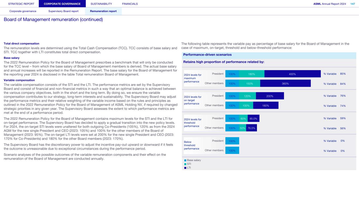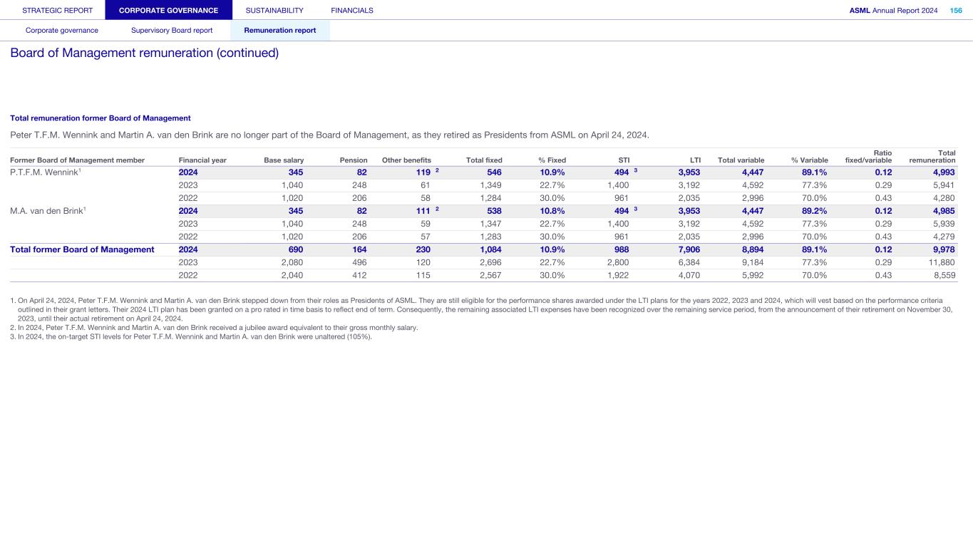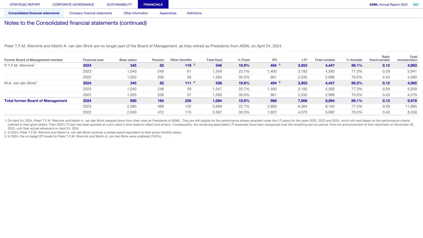 Peter T.F.M. Wennink and Martin A. van den Brink are no longer part of the Board of Management, as they retired as Presidents from ASML on April 24, 2024. Former Board of Management member Financial year Base salary Pension Other benefits Total fixed % Fixed STI LTI1 Total variable % Variable Ratio fixed/variable Total remuneration P.T.F.M. Wennink1 2024 345 82 119 2 546 10.9% 494 3 3,953 4,447 89.1% 0.12 4,993 2023 1,040 248 61 1,349 22.7% 1,400 3,192 4,592 77.3% 0.29 5,941 2022 1,020 206 58 1,284 30.0% 961 2,035 2,996 70.0% 0.43 4,280 M.A. van den Brink1 2024 345 82 111 2 538 10.8% 494 3 3,953 4,447 89.2% 0.12 4,985 2023 1,040 248 59 1,347 22.7% 1,400 3,192 4,592 77.3% 0.29 5,939 2022 1,020 206 57 1,283 30.0% 961 2,035 2,996 70.0% 0.43 4,279 Total former Board of Management 2024 690 164 230 1,084 10.9% 988 7,906 8,894 89.1% 0.12 9,978 2023 2,080 496 120 2,696 22.7% 2,800 6,384 9,184 77.3% 0.29 11,880 2022 2,040 412 115 2,567 30.0% 1,922 4,070 5,992 70.0% 0.43 8,559 1. On April 24, 2024, Peter T.F.M. Wennink and Martin A. van den Brink stepped down from their roles as Presidents of ASML. They are still eligible for the performance shares awarded under the LTI plans for the years 2022, 2023 and 2024, which will vest based on the performance criteria outlined in their grant letters. Their 2024 LTI plan has been granted on a pro rated in time basis to reflect end of term. Consequently, the remaining associated LTI expenses have been recognized over the remaining service period, from the announcement of their retirement on November 30, 2023, until their actual retirement on April 24, 2024. 2. In 2024, Peter T.F.M. Wennink and Martin A. van den Brink received a jubilee award equivalent to their gross monthly salary. 3. In 2024, the on-target STI levels for Peter T.F.M. Wennink and Martin A. van den Brink were unaltered (105%). STRATEGIC REPORT CORPORATE GOVERNANCE SUSTAINABILITY FINANCIALS ASML Annual Report 2024 382 Consolidated financial statements Company financial statements Other information Appendices Definitions Notes to the Consolidated financial statements (continued)