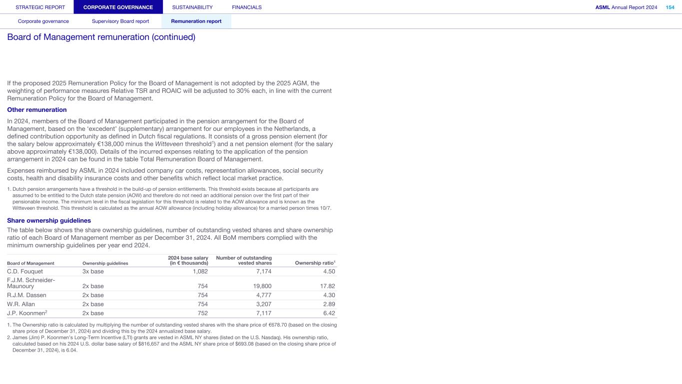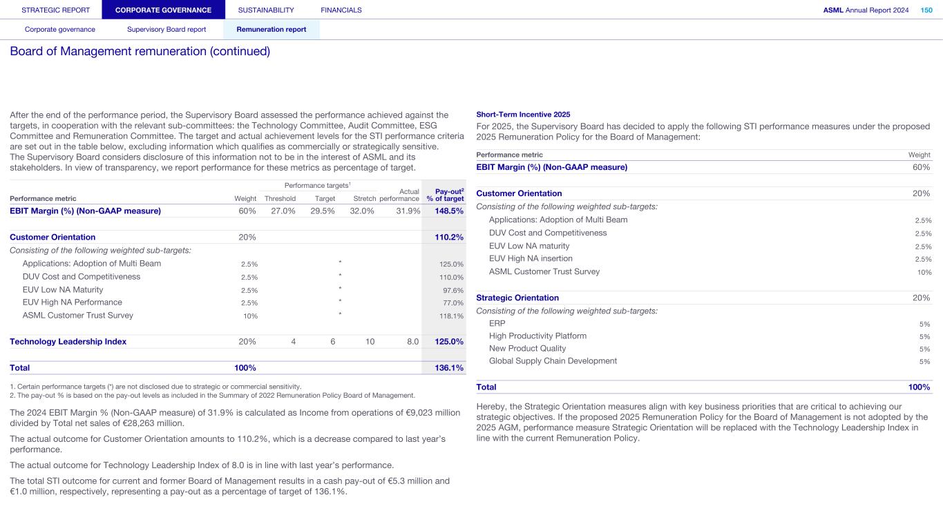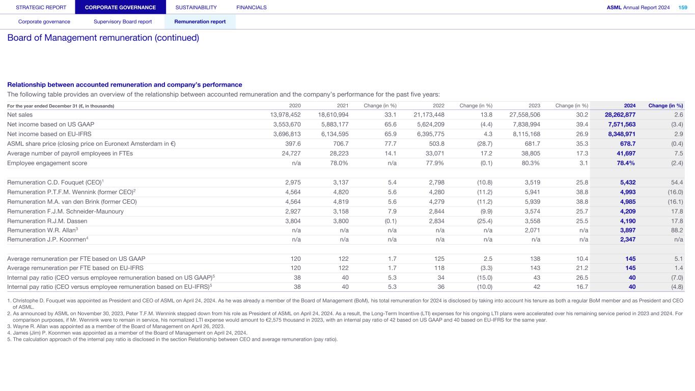 Peter T.F.M. Wennink and Martin A. van den Brink are no longer part of the Board of Management, as they retired as Presidents from ASML on April 24, 2024. Former Board of Management member Financial year Base salary Pension Other benefits Total fixed % Fixed STI LTI1 Total variable % Variable Ratio fixed/variable Total remuneration P.T.F.M. Wennink1 2024 345 82 119 2 546 10.9% 494 3 3,953 4,447 89.1% 0.12 4,993 2023 1,040 248 61 1,349 22.7% 1,400 3,192 4,592 77.3% 0.29 5,941 2022 1,020 206 58 1,284 30.0% 961 2,035 2,996 70.0% 0.43 4,280 M.A. van den Brink1 2024 345 82 111 2 538 10.8% 494 3 3,953 4,447 89.2% 0.12 4,985 2023 1,040 248 59 1,347 22.7% 1,400 3,192 4,592 77.3% 0.29 5,939 2022 1,020 206 57 1,283 30.0% 961 2,035 2,996 70.0% 0.43 4,279 Total former Board of Management 2024 690 164 230 1,084 10.9% 988 7,906 8,894 89.1% 0.12 9,978 2023 2,080 496 120 2,696 22.7% 2,800 6,384 9,184 77.3% 0.29 11,880 2022 2,040 412 115 2,567 30.0% 1,922 4,070 5,992 70.0% 0.43 8,559 1. On April 24, 2024, Peter T.F.M. Wennink and Martin A. van den Brink stepped down from their roles as Presidents of ASML. They are still eligible for the performance shares awarded under the LTI plans for the years 2022, 2023 and 2024, which will vest based on the performance criteria outlined in their grant letters. Their 2024 LTI plan has been granted on a pro rated in time basis to reflect end of term. Consequently, the remaining associated LTI expenses have been recognized over the remaining service period, from the announcement of their retirement on November 30, 2023, until their actual retirement on April 24, 2024. 2. In 2024, Peter T.F.M. Wennink and Martin A. van den Brink received a jubilee award equivalent to their gross monthly salary. 3. In 2024, the on-target STI levels for Peter T.F.M. Wennink and Martin A. van den Brink were unaltered (105%). STRATEGIC REPORT CORPORATE GOVERNANCE SUSTAINABILITY FINANCIALS ASML Annual Report 2024 382 Consolidated financial statements Company financial statements Other information Appendices Definitions Notes to the Consolidated financial statements (continued)