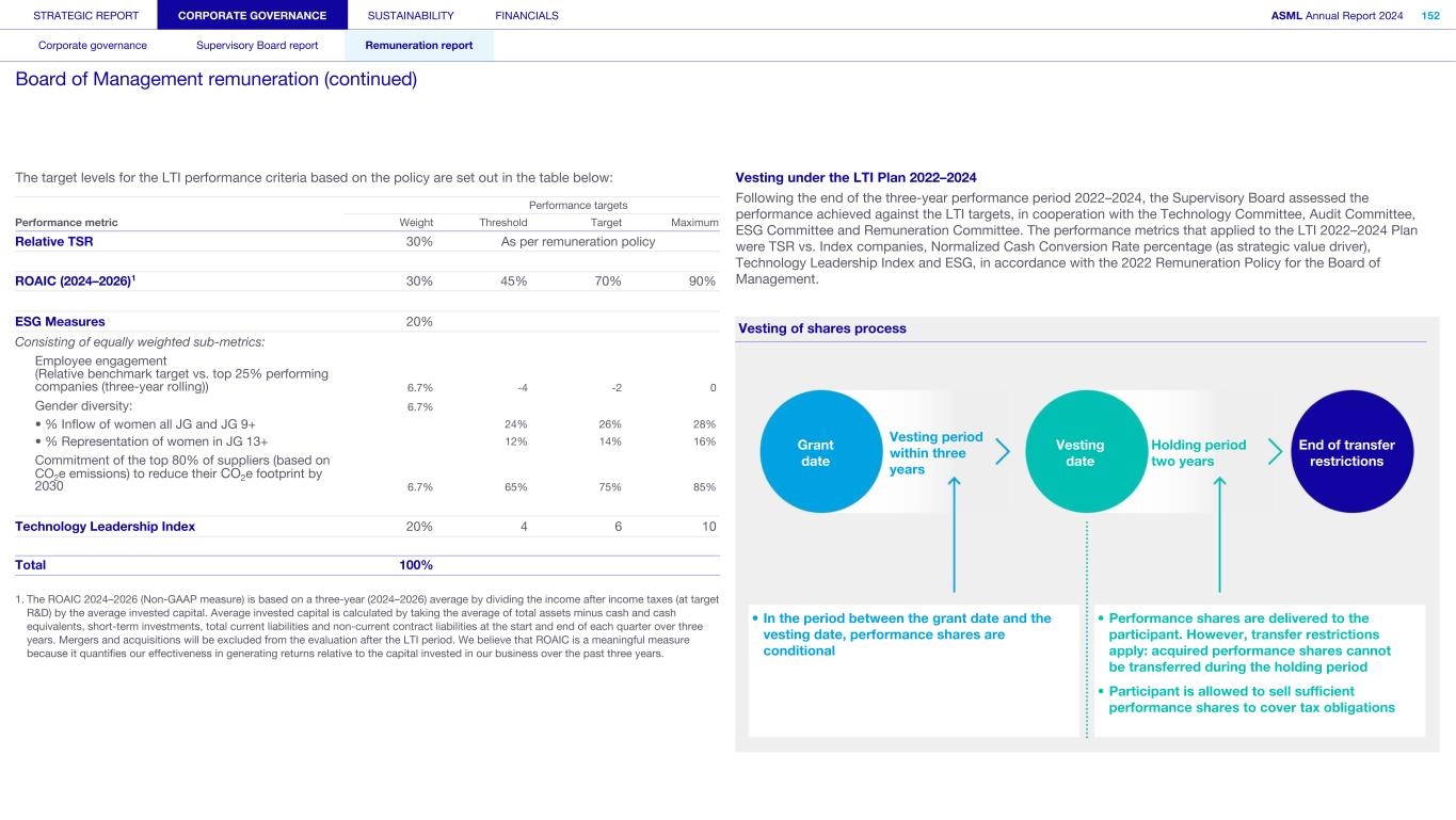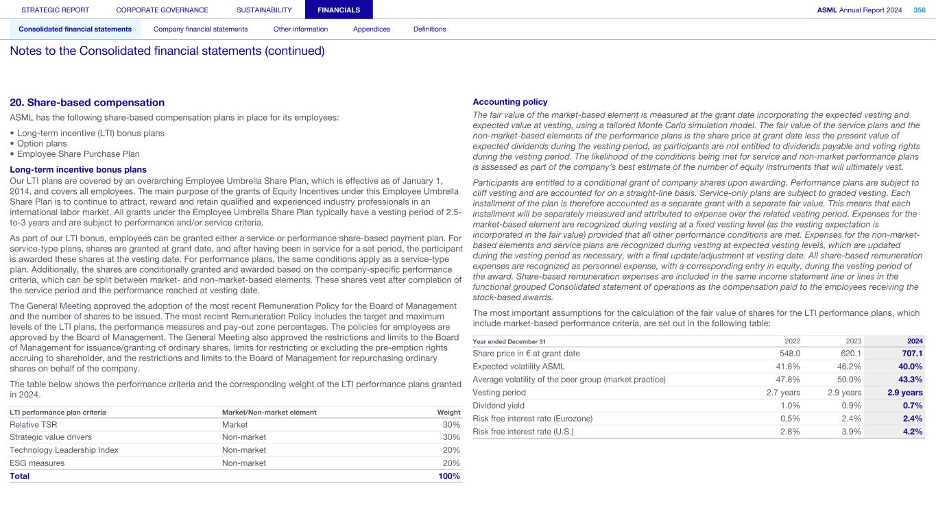 20. Share-based compensation ASML has the following share-based compensation plans in place for its employees: • Long-term incentive (LTI) bonus plans • Option plans • Employee Share Purchase Plan Long-term incentive bonus plans Our LTI plans are covered by an overarching Employee Umbrella Share Plan, which is effective as of January 1, 2014, and covers all employees. The main purpose of the grants of Equity Incentives under this Employee Umbrella Share Plan is to continue to attract, reward and retain qualified and experienced industry professionals in an international labor market. All grants under the Employee Umbrella Share Plan typically have a vesting period of 2.5- to-3 years and are subject to performance and/or service criteria. As part of our LTI bonus, employees can be granted either a service or performance share-based payment plan. For service-type plans, shares are granted at grant date, and after having been in service for a set period, the participant is awarded these shares at the vesting date. For performance plans, the same conditions apply as a service-type plan. Additionally, the shares are conditionally granted and awarded based on the company-specific performance criteria, which can be split between market- and non-market-based elements. These shares vest after completion of the service period and the performance reached at vesting date. The General Meeting approved the adoption of the most recent Remuneration Policy for the Board of Management and the number of shares to be issued. The most recent Remuneration Policy includes the target and maximum levels of the LTI plans, the performance measures and pay-out zone percentages. The policies for employees are approved by the Board of Management. The General Meeting also approved the restrictions and limits to the Board of Management for issuance/granting of ordinary shares, limits for restricting or excluding the pre-emption rights accruing to shareholder, and the restrictions and limits to the Board of Management for repurchasing ordinary shares on behalf of the company. The table below shows the performance criteria and the corresponding weight of the LTI performance plans granted in 2024. LTI performance plan criteria Market/Non-market element Weight Relative TSR Market 30% Strategic value drivers Non-market 30% Technology Leadership Index Non-market 20% ESG measures Non-market 20% Total 100% Accounting policy The fair value of the market-based element is measured at the grant date incorporating the expected vesting and expected value at vesting, using a tailored Monte Carlo simulation model. The fair value of the service plans and the non-market-based elements of the performance plans is the share price at grant date less the present value of expected dividends during the vesting period, as participants are not entitled to dividends payable and voting rights during the vesting period. The likelihood of the conditions being met for service and non-market performance plans is assessed as part of the company’s best estimate of the number of equity instruments that will ultimately vest. Participants are entitled to a conditional grant of company shares upon awarding. Performance plans are subject to cliff vesting and are accounted for on a straight-line basis. Service-only plans are subject to graded vesting. Each installment of the plan is therefore accounted as a separate grant with a separate fair value. This means that each installment will be separately measured and attributed to expense over the related vesting period. Expenses for the market-based element are recognized during vesting at a fixed vesting level (as the vesting expectation is incorporated in the fair value) provided that all other performance conditions are met. Expenses for the non-market- based elements and service plans are recognized during vesting at expected vesting levels, which are updated during the vesting period as necessary, with a final update/adjustment at vesting date. All share-based remuneration expenses are recognized as personnel expense, with a corresponding entry in equity, during the vesting period of the award. Share-based remuneration expenses are included in the same income statement line or lines in the functional grouped Consolidated statement of operations as the compensation paid to the employees receiving the stock-based awards. The most important assumptions for the calculation of the fair value of shares for the LTI performance plans, which include market-based performance criteria, are set out in the following table: Year ended December 31 2022 2023 2024 Share price in € at grant date 548.0 620.1 707.1 Expected volatility ASML 41.8% 46.2% 40.0% Average volatility of the peer group (market practice) 47.8% 50.0% 43.3% Vesting period 2.7 years 2.9 years 2.9 years Dividend yield 1.0% 0.9% 0.7% Risk free interest rate (Eurozone) 0.5% 2.4% 2.4% Risk free interest rate (U.S.) 2.8% 3.9% 4.2% STRATEGIC REPORT CORPORATE GOVERNANCE SUSTAINABILITY FINANCIALS ASML Annual Report 2024 356 Consolidated financial statements Company financial statements Other information Appendices Definitions Notes to the Consolidated financial statements (continued)