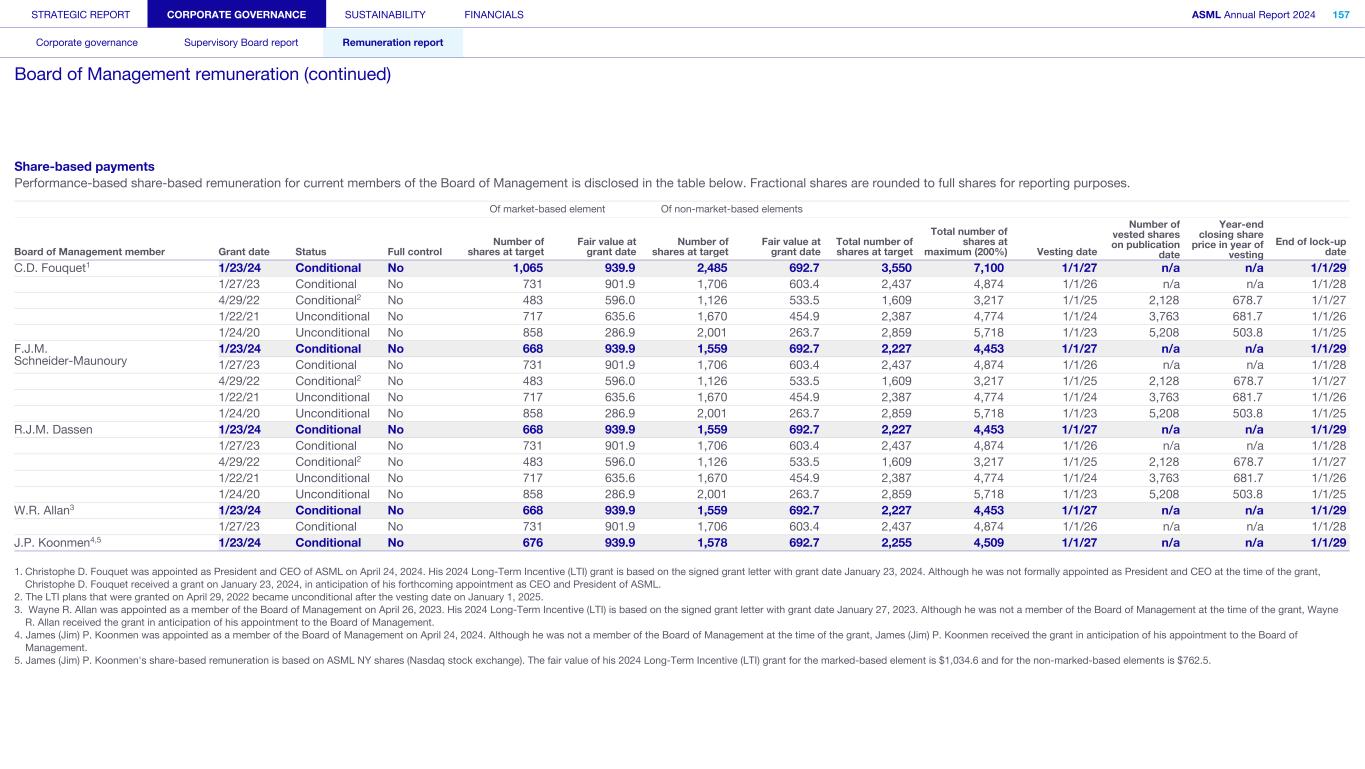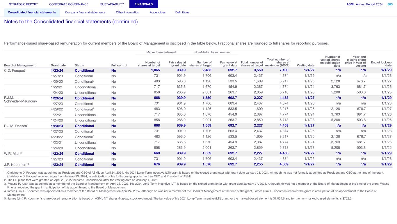 Performance-based share-based remuneration for current members of the Board of Management is disclosed in the table below. Fractional shares are rounded to full shares for reporting purposes. Market based element Non-Market based element Board of Management Grant date Status Full control Number of shares at target Fair value at grant date Number of shares at target Fair value at grant date Total number of shares at target Total number of shares at maximum (200%) Vesting date Number of vested shares on publication date Year-end closing share price in year of vesting End of lock-up date C.D. Fouquet1 1/23/24 Conditional No 1,065 939.9 2,485 692.7 3,550 7,100 1/1/27 n/a n/a 1/1/29 1/27/23 Conditional No 731 901.9 1,706 603.4 2,437 4,874 1/1/26 n/a n/a 1/1/28 4/29/22 Conditional2 No 483 596.0 1,126 533.5 1,609 3,217 1/1/25 2,128 678.7 1/1/27 1/22/21 Unconditional No 717 635.6 1,670 454.9 2,387 4,774 1/1/24 3,763 681.7 1/1/26 1/24/20 Unconditional No 858 286.9 2,001 263.7 2,859 5,718 1/1/23 5,208 503.8 1/1/25 F.J.M. Schneider-Maunoury 1/23/24 Conditional No 668 939.9 1,559 692.7 2,227 4,453 1/1/27 n/a n/a 1/1/29 1/27/23 Conditional No 731 901.9 1,706 603.4 2,437 4,874 1/1/26 n/a n/a 1/1/28 4/29/22 Conditional2 No 483 596.0 1,126 533.5 1,609 3,217 1/1/25 2,128 678.7 1/1/27 1/22/21 Unconditional No 717 635.6 1,670 454.9 2,387 4,774 1/1/24 3,763 681.7 1/1/26 1/24/20 Unconditional No 858 286.9 2,001 263.7 2,859 5,718 1/1/23 5,208 503.8 1/1/25 R.J.M. Dassen 1/23/24 Conditional No 668 939.9 1,559 692.7 2,227 4,453 1/1/27 n/a n/a 1/1/29 1/27/23 Conditional No 731 901.9 1,706 603.4 2,437 4,874 1/1/26 n/a n/a 1/1/28 4/29/22 Conditional2 No 483 596.0 1,126 533.5 1,609 3,217 1/1/25 2,128 678.7 1/1/27 1/22/21 Unconditional No 717 635.6 1,670 454.9 2,387 4,774 1/1/24 3,763 681.7 1/1/26 1/24/20 Unconditional No 858 286.9 2,001 263.7 2,859 5,718 1/1/23 5,208 503.8 1/1/25 W.R. Allan3 1/23/24 Conditional No 668 939.9 1,559 692.7 2,227 4,453 1/1/27 n/a n/a 1/1/29 1/27/23 Conditional No 731 901.9 1,706 603.4 2,437 4,874 1/1/26 n/a n/a 1/1/28 J.P. Koonmen4,5 1/23/24 Conditional No 676 939.9 1,578 692.7 2,255 4,509 1/1/27 n/a n/a 1/1/29 1. Christophe D. Fouquet was appointed as President and CEO of ASML on April 24, 2024. His 2024 Long-Term Incentive (LTI) grant is based on the signed grant letter with grant date January 23, 2024. Although he was not formally appointed as President and CEO at the time of the grant, Christophe D. Fouquet received a grant on January 23, 2024, in anticipation of his forthcoming appointment as CEO and President of ASML. 2. The LTI plans that were granted on April 29, 2022 became unconditional after the vesting date on January 1, 2025. 3. Wayne R. Allan was appointed as a member of the Board of Management on April 26, 2023. His 2024 Long-Term Incentive (LTI) is based on the signed grant letter with grant date January 27, 2023. Although he was not a member of the Board of Management at the time of the grant, Wayne R. Allan received the grant in anticipation of his appointment to the Board of Management. 4.James (Jim) P. Koonmen was appointed as a member of the Board of Management on April 24, 2024. Although he was not a member of the Board of Management at the time of the grant, James (Jim) P. Koonmen received the grant in anticipation of his appointment to the Board of Management. 5. James (Jim) P. Koonmen's share-based remuneration is based on ASML NY shares (Nasdaq stock exchange). The fair value of his 2024 Long-Term Incentive (LTI) grant for the marked-based element is $1,034.6 and for the non-marked-based elements is $762.5. STRATEGIC REPORT CORPORATE GOVERNANCE SUSTAINABILITY FINANCIALS ASML Annual Report 2024 383 Consolidated financial statements Company financial statements Other information Appendices Definitions Notes to the Consolidated financial statements (continued)