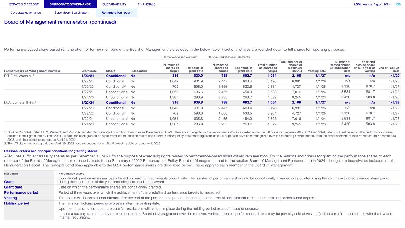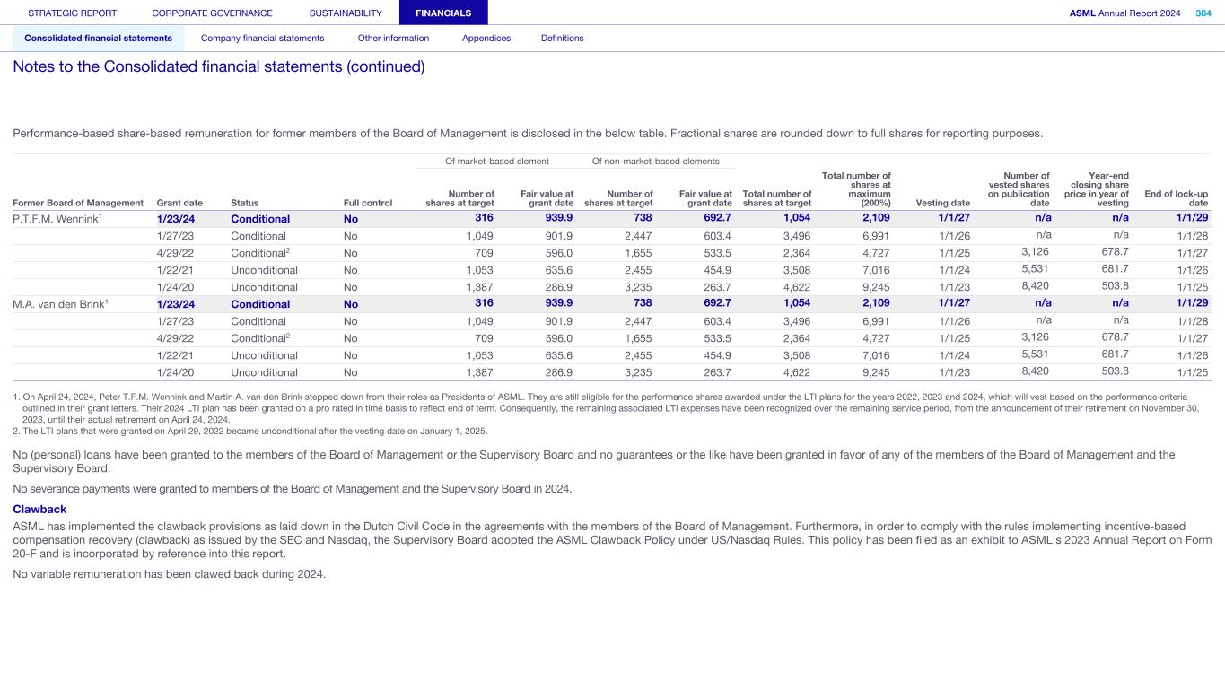 Performance-based share-based remuneration for former members of the Board of Management is disclosed in the below table. Fractional shares are rounded down to full shares for reporting purposes. Of market-based element Of non-market-based elements Former Board of Management Grant date Status Full control Number of shares at target Fair value at grant date Number of shares at target Fair value at grant date Total number of shares at target Total number of shares at maximum (200%) Vesting date Number of vested shares on publication date Year-end closing share price in year of vesting End of lock-up date P.T.F.M. Wennink1 1/23/24 Conditional No 316 939.9 738 692.7 1,054 2,109 1/1/27 n/a n/a 1/1/29 1/27/23 Conditional No 1,049 901.9 2,447 603.4 3,496 6,991 1/1/26 n/a n/a 1/1/28 4/29/22 Conditional2 No 709 596.0 1,655 533.5 2,364 4,727 1/1/25 3,126 678.7 1/1/27 1/22/21 Unconditional No 1,053 635.6 2,455 454.9 3,508 7,016 1/1/24 5,531 681.7 1/1/26 1/24/20 Unconditional No 1,387 286.9 3,235 263.7 4,622 9,245 1/1/23 8,420 503.8 1/1/25 M.A. van den Brink1 1/23/24 Conditional No 316 939.9 738 692.7 1,054 2,109 1/1/27 n/a n/a 1/1/29 1/27/23 Conditional No 1,049 901.9 2,447 603.4 3,496 6,991 1/1/26 n/a n/a 1/1/28 4/29/22 Conditional2 No 709 596.0 1,655 533.5 2,364 4,727 1/1/25 3,126 678.7 1/1/27 1/22/21 Unconditional No 1,053 635.6 2,455 454.9 3,508 7,016 1/1/24 5,531 681.7 1/1/26 1/24/20 Unconditional No 1,387 286.9 3,235 263.7 4,622 9,245 1/1/23 8,420 503.8 1/1/25 1. On April 24, 2024, Peter T.F.M. Wennink and Martin A. van den Brink stepped down from their roles as Presidents of ASML. They are still eligible for the performance shares awarded under the LTI plans for the years 2022, 2023 and 2024, which will vest based on the performance criteria outlined in their grant letters. Their 2024 LTI plan has been granted on a pro rated in time basis to reflect end of term. Consequently, the remaining associated LTI expenses have been recognized over the remaining service period, from the announcement of their retirement on November 30, 2023, until their actual retirement on April 24, 2024. 2. The LTI plans that were granted on April 29, 2022 became unconditional after the vesting date on January 1, 2025. No (personal) loans have been granted to the members of the Board of Management or the Supervisory Board and no guarantees or the like have been granted in favor of any of the members of the Board of Management and the Supervisory Board. No severance payments were granted to members of the Board of Management and the Supervisory Board in 2024. Clawback ASML has implemented the clawback provisions as laid down in the Dutch Civil Code in the agreements with the members of the Board of Management. Furthermore, in order to comply with the rules implementing incentive-based compensation recovery (clawback) as issued by the SEC and Nasdaq, the Supervisory Board adopted the ASML Clawback Policy under US/Nasdaq Rules. This policy has been filed as an exhibit to ASML's 2023 Annual Report on Form 20-F and is incorporated by reference into this report. No variable remuneration has been clawed back during 2024. STRATEGIC REPORT CORPORATE GOVERNANCE SUSTAINABILITY FINANCIALS ASML Annual Report 2024 384 Consolidated financial statements Company financial statements Other information Appendices Definitions Notes to the Consolidated financial statements (continued)