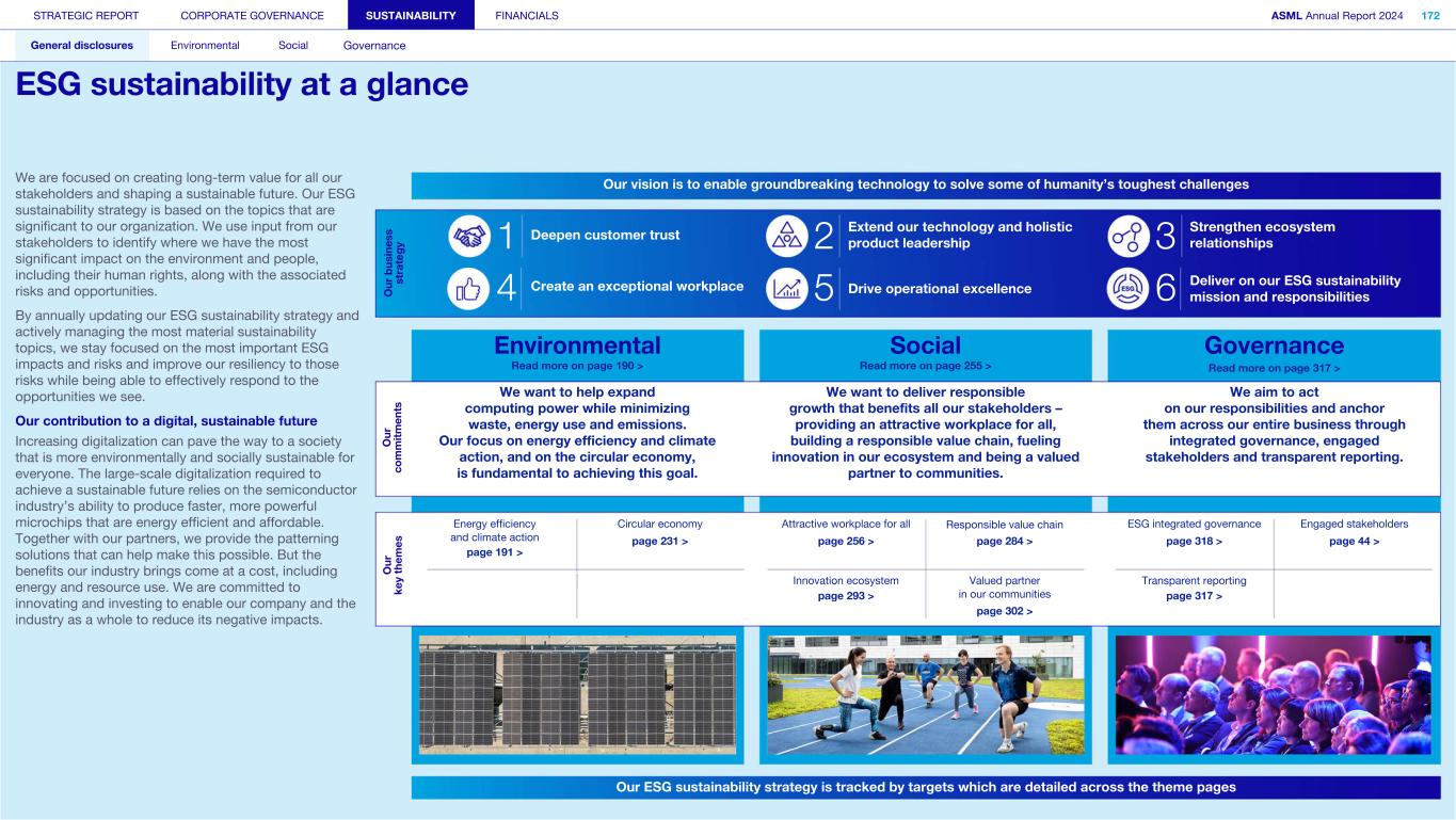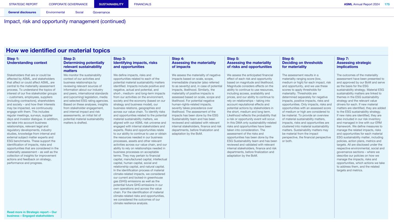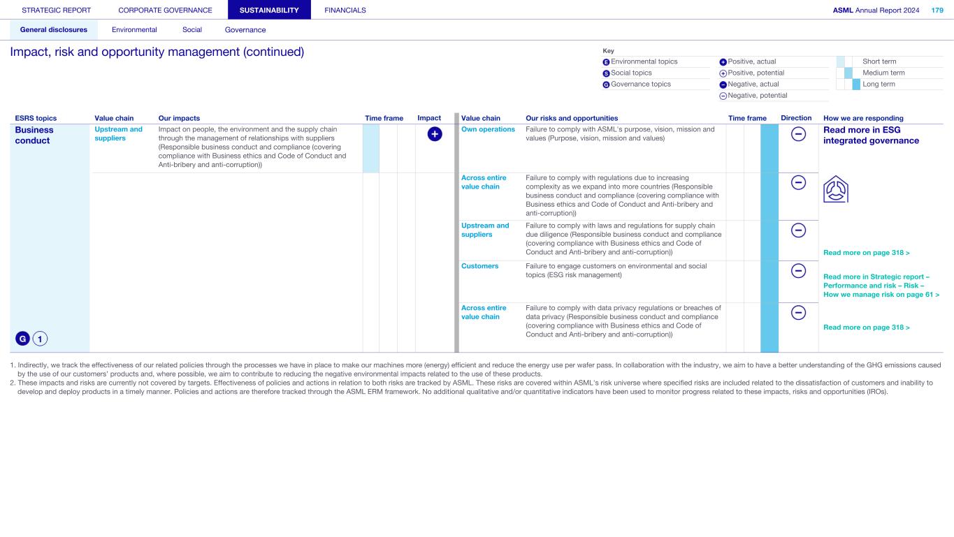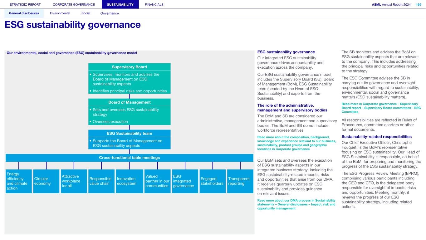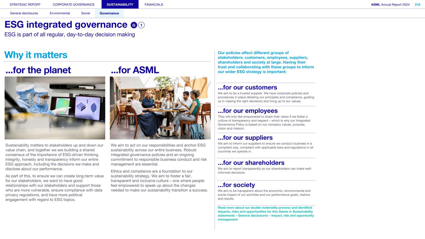 STRATEGIC REPORT CORPORATE GOVERNANCE SUSTAINABILITY FINANCIALS ASML Annual Report 2024 318 General disclosures Environmental Social Governance ESG integrated governance ESG is part of all regular, day-to-day decision making Why it matters ...for the planet ...for ASML Sustainability matters to stakeholders up and down our value chain, and together we are building a shared consensus of the importance of ESG-driven thinking. Integrity, honesty and transparency inform our entire ESG approach, including the decisions we make and disclose about our performance. As part of this, to ensure we can create long-term value for our stakeholders, we want to have good relationships with our stakeholders and support those who are more vulnerable, ensure compliance with data privacy regulations, and have more political engagement with regard to ESG topics. We aim to act on our responsibilities and anchor ESG sustainability across our entire business. Robust integrated governance policies and an ongoing commitment to responsible business conduct and risk management are essential. Ethics and compliance are a foundation to our sustainability strategy. We aim to foster a fair, transparent and inclusive culture – one where people feel empowered to speak up about the changes needed to make our sustainability transition a success. Our policies affect different groups of stakeholders: customers, employees, suppliers, shareholders and society at large. Having their trust and collaborating with these groups to inform our wider ESG strategy is important: ...for our customers We aim to be a trusted supplier. We have corporate policies and procedures in place detailing our principles and compliance, guiding us in making the right decisions and living up to our values. ...for our employees They will only feel empowered to share their views if we foster a culture of transparency and respect – which is why our Integrated Governance Policy is based on our company values, purpose, vision and mission. ...for our suppliers We aim to inform our suppliers to ensure we conduct business in a compliant way, compliant with applicable laws and regulations in all countries we operate in. ...for our shareholders We aim to report transparently so our shareholders can make well- informed decisions. ...for society We aim to be transparent about the economic, environmental and social impact of our activities and our performance goals, metrics and results. Read more about our double materiality process and identified impacts, risks and opportunities for this theme in Sustainability statements – General disclosures – Impact, risk and opportunity management