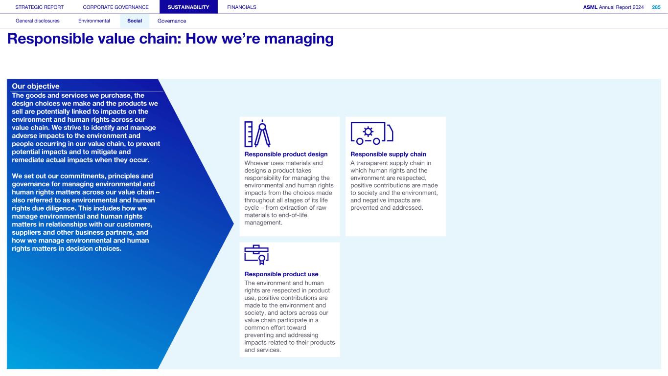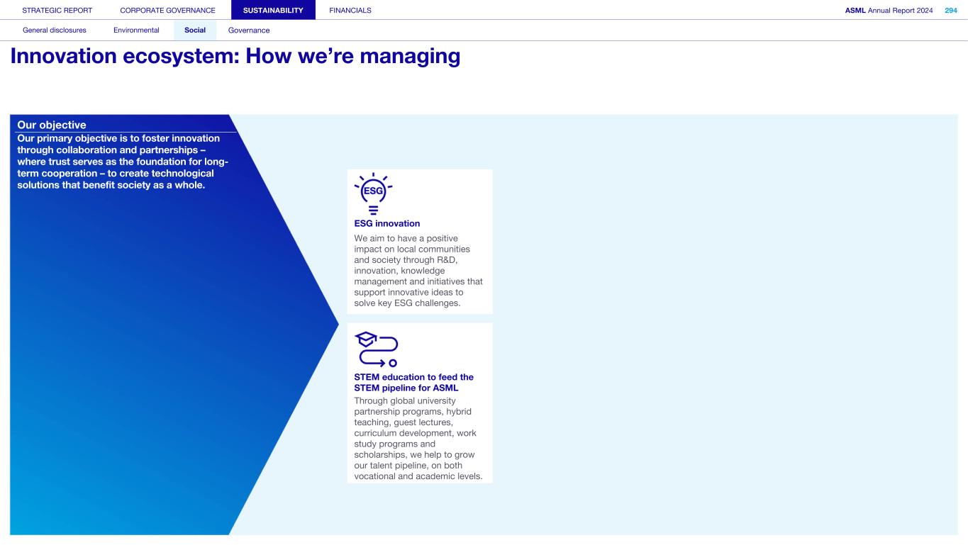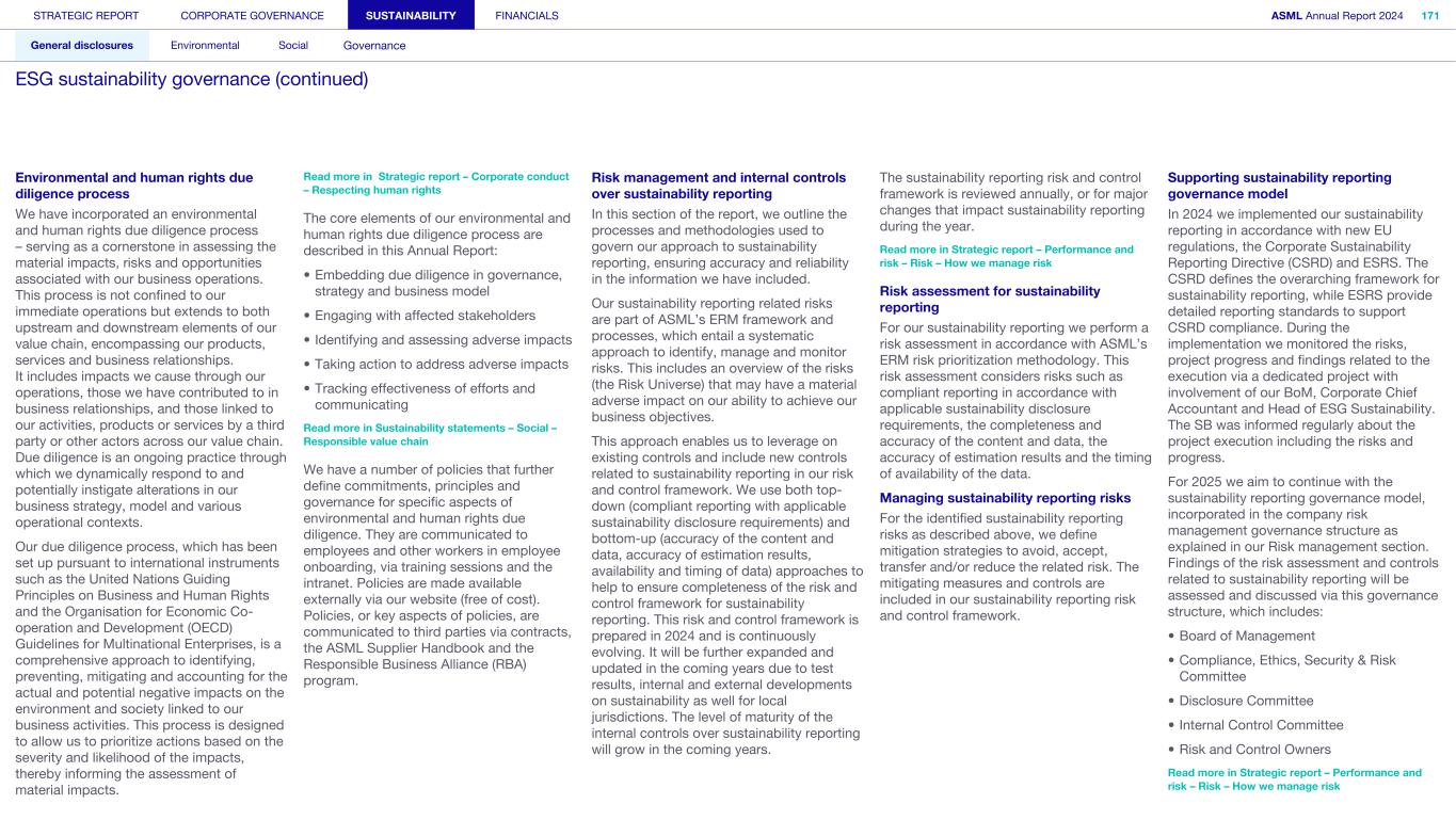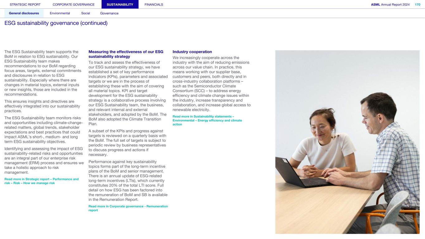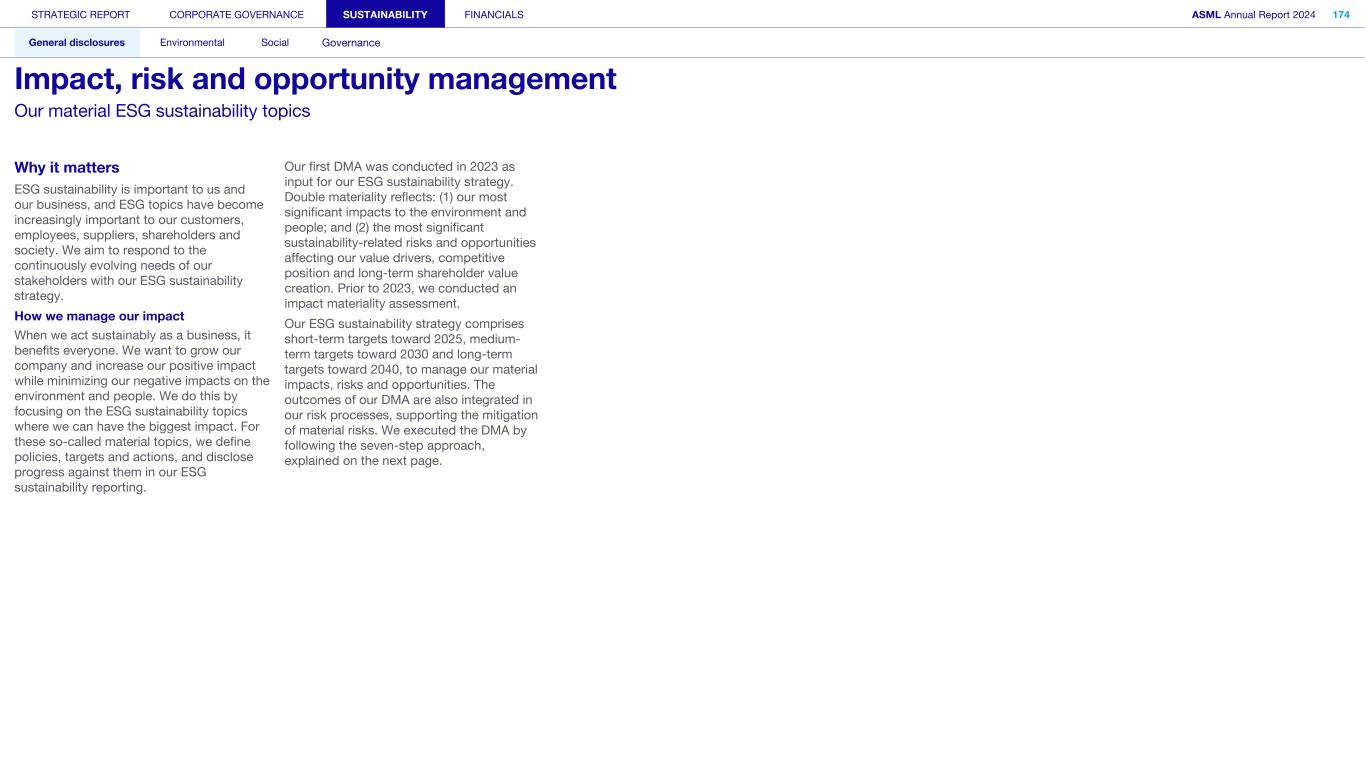 STRATEGIC REPORT CORPORATE GOVERNANCE SUSTAINABILITY FINANCIALS ASML Annual Report 2024 318 General disclosures Environmental Social Governance ESG integrated governance ESG is part of all regular, day-to-day decision making Why it matters ...for the planet ...for ASML Sustainability matters to stakeholders up and down our value chain, and together we are building a shared consensus of the importance of ESG-driven thinking. Integrity, honesty and transparency inform our entire ESG approach, including the decisions we make and disclose about our performance. As part of this, to ensure we can create long-term value for our stakeholders, we want to have good relationships with our stakeholders and support those who are more vulnerable, ensure compliance with data privacy regulations, and have more political engagement with regard to ESG topics. We aim to act on our responsibilities and anchor ESG sustainability across our entire business. Robust integrated governance policies and an ongoing commitment to responsible business conduct and risk management are essential. Ethics and compliance are a foundation to our sustainability strategy. We aim to foster a fair, transparent and inclusive culture – one where people feel empowered to speak up about the changes needed to make our sustainability transition a success. Our policies affect different groups of stakeholders: customers, employees, suppliers, shareholders and society at large. Having their trust and collaborating with these groups to inform our wider ESG strategy is important: ...for our customers We aim to be a trusted supplier. We have corporate policies and procedures in place detailing our principles and compliance, guiding us in making the right decisions and living up to our values. ...for our employees They will only feel empowered to share their views if we foster a culture of transparency and respect – which is why our Integrated Governance Policy is based on our company values, purpose, vision and mission. ...for our suppliers We aim to inform our suppliers to ensure we conduct business in a compliant way, compliant with applicable laws and regulations in all countries we operate in. ...for our shareholders We aim to report transparently so our shareholders can make well- informed decisions. ...for society We aim to be transparent about the economic, environmental and social impact of our activities and our performance goals, metrics and results. Read more about our double materiality process and identified impacts, risks and opportunities for this theme in Sustainability statements – General disclosures – Impact, risk and opportunity management