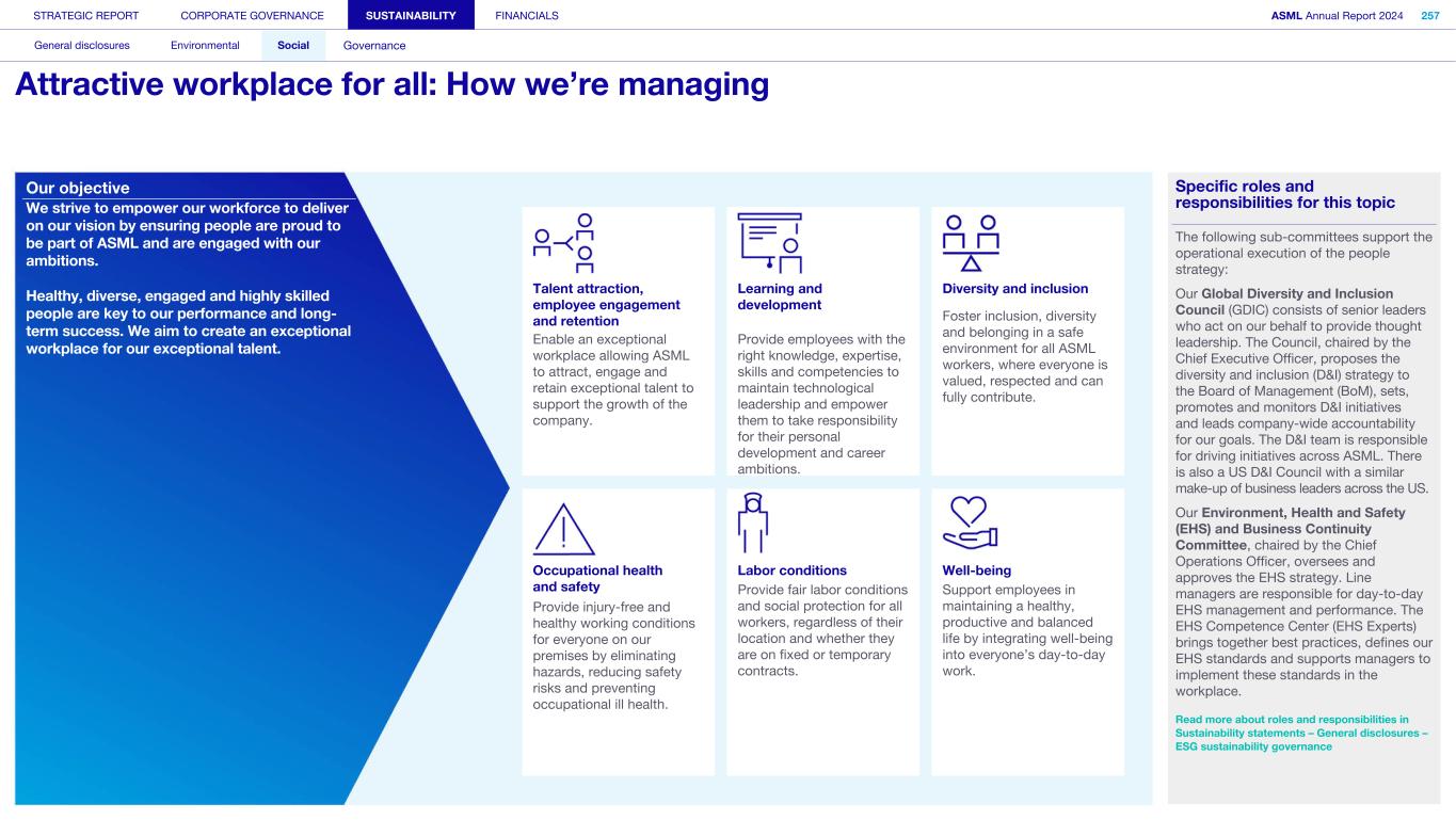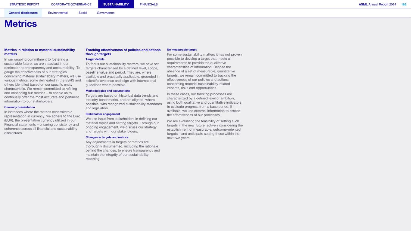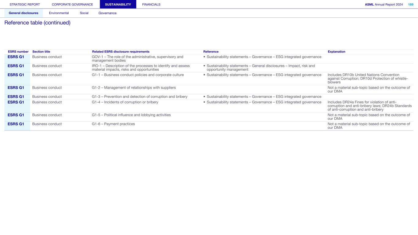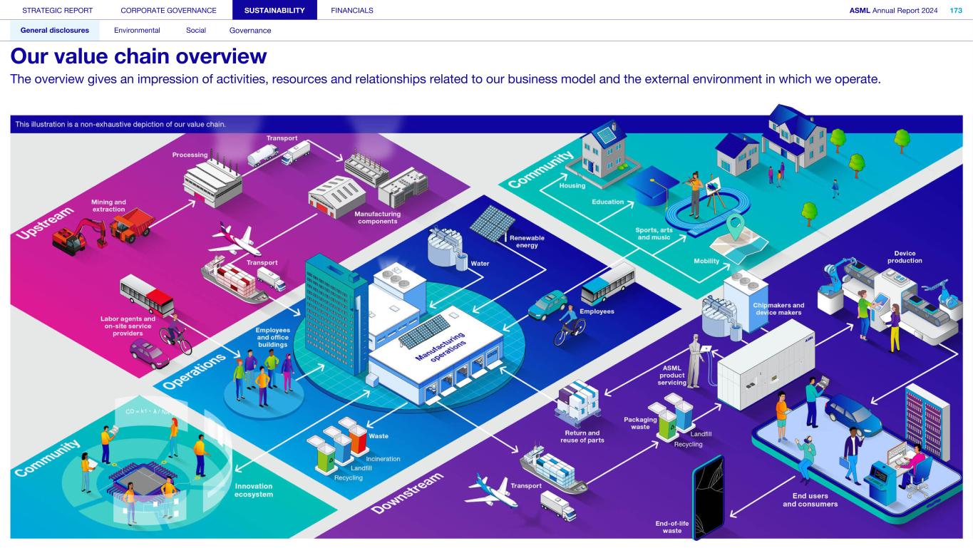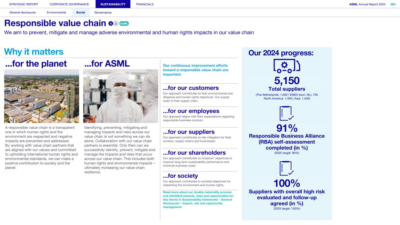 STRATEGIC REPORT CORPORATE GOVERNANCE SUSTAINABILITY FINANCIALS ASML Annual Report 2024 318 General disclosures Environmental Social Governance ESG integrated governance ESG is part of all regular, day-to-day decision making Why it matters ...for the planet ...for ASML Sustainability matters to stakeholders up and down our value chain, and together we are building a shared consensus of the importance of ESG-driven thinking. Integrity, honesty and transparency inform our entire ESG approach, including the decisions we make and disclose about our performance. As part of this, to ensure we can create long-term value for our stakeholders, we want to have good relationships with our stakeholders and support those who are more vulnerable, ensure compliance with data privacy regulations, and have more political engagement with regard to ESG topics. We aim to act on our responsibilities and anchor ESG sustainability across our entire business. Robust integrated governance policies and an ongoing commitment to responsible business conduct and risk management are essential. Ethics and compliance are a foundation to our sustainability strategy. We aim to foster a fair, transparent and inclusive culture – one where people feel empowered to speak up about the changes needed to make our sustainability transition a success. Our policies affect different groups of stakeholders: customers, employees, suppliers, shareholders and society at large. Having their trust and collaborating with these groups to inform our wider ESG strategy is important: ...for our customers We aim to be a trusted supplier. We have corporate policies and procedures in place detailing our principles and compliance, guiding us in making the right decisions and living up to our values. ...for our employees They will only feel empowered to share their views if we foster a culture of transparency and respect – which is why our Integrated Governance Policy is based on our company values, purpose, vision and mission. ...for our suppliers We aim to inform our suppliers to ensure we conduct business in a compliant way, compliant with applicable laws and regulations in all countries we operate in. ...for our shareholders We aim to report transparently so our shareholders can make well- informed decisions. ...for society We aim to be transparent about the economic, environmental and social impact of our activities and our performance goals, metrics and results. Read more about our double materiality process and identified impacts, risks and opportunities for this theme in Sustainability statements – General disclosures – Impact, risk and opportunity management