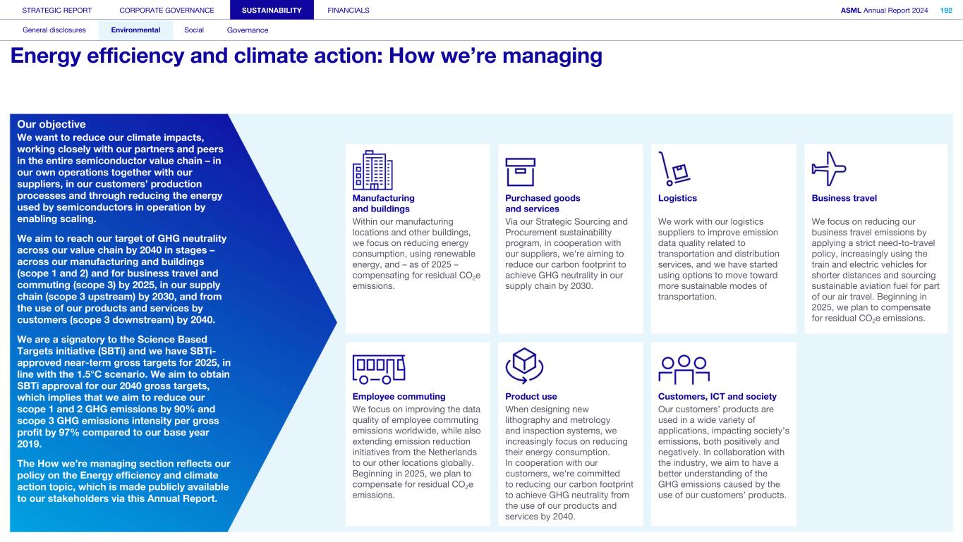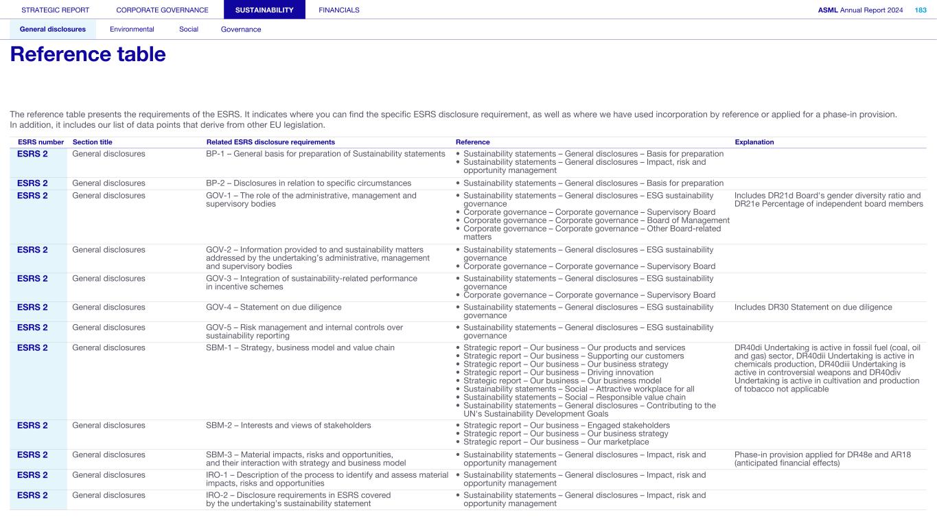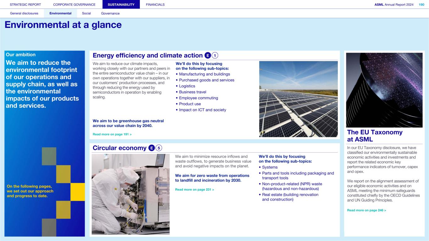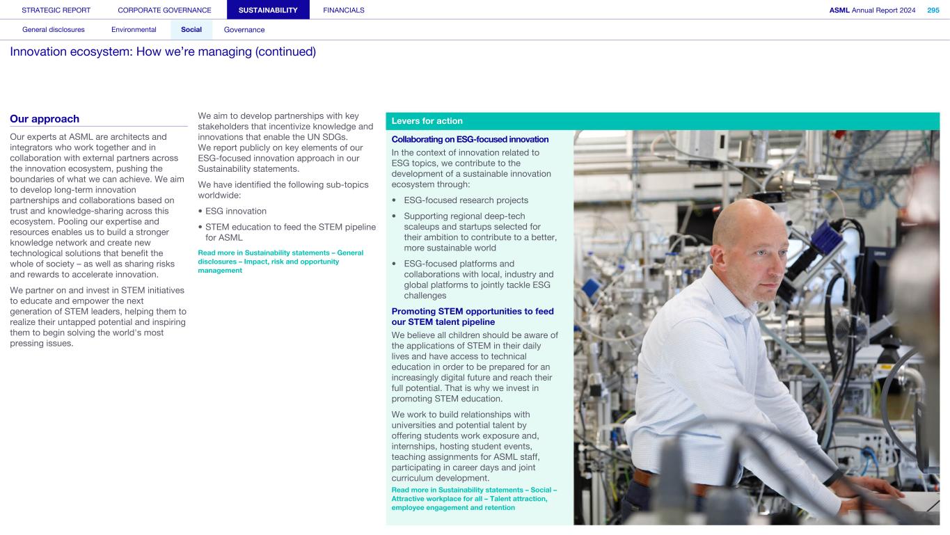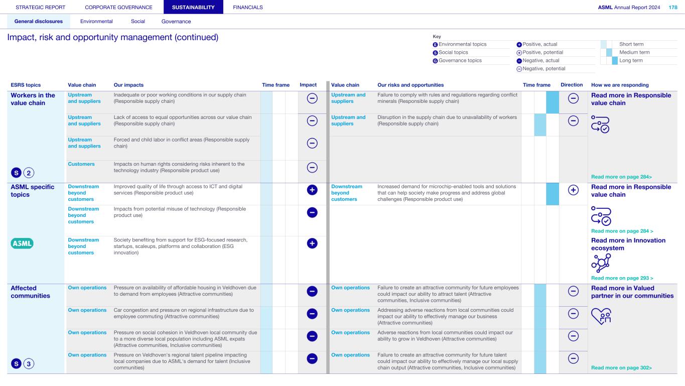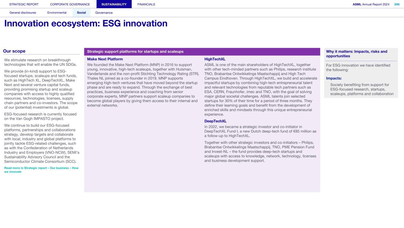 STRATEGIC REPORT CORPORATE GOVERNANCE SUSTAINABILITY FINANCIALS ASML Annual Report 2024 318 General disclosures Environmental Social Governance ESG integrated governance ESG is part of all regular, day-to-day decision making Why it matters ...for the planet ...for ASML Sustainability matters to stakeholders up and down our value chain, and together we are building a shared consensus of the importance of ESG-driven thinking. Integrity, honesty and transparency inform our entire ESG approach, including the decisions we make and disclose about our performance. As part of this, to ensure we can create long-term value for our stakeholders, we want to have good relationships with our stakeholders and support those who are more vulnerable, ensure compliance with data privacy regulations, and have more political engagement with regard to ESG topics. We aim to act on our responsibilities and anchor ESG sustainability across our entire business. Robust integrated governance policies and an ongoing commitment to responsible business conduct and risk management are essential. Ethics and compliance are a foundation to our sustainability strategy. We aim to foster a fair, transparent and inclusive culture – one where people feel empowered to speak up about the changes needed to make our sustainability transition a success. Our policies affect different groups of stakeholders: customers, employees, suppliers, shareholders and society at large. Having their trust and collaborating with these groups to inform our wider ESG strategy is important: ...for our customers We aim to be a trusted supplier. We have corporate policies and procedures in place detailing our principles and compliance, guiding us in making the right decisions and living up to our values. ...for our employees They will only feel empowered to share their views if we foster a culture of transparency and respect – which is why our Integrated Governance Policy is based on our company values, purpose, vision and mission. ...for our suppliers We aim to inform our suppliers to ensure we conduct business in a compliant way, compliant with applicable laws and regulations in all countries we operate in. ...for our shareholders We aim to report transparently so our shareholders can make well- informed decisions. ...for society We aim to be transparent about the economic, environmental and social impact of our activities and our performance goals, metrics and results. Read more about our double materiality process and identified impacts, risks and opportunities for this theme in Sustainability statements – General disclosures – Impact, risk and opportunity management