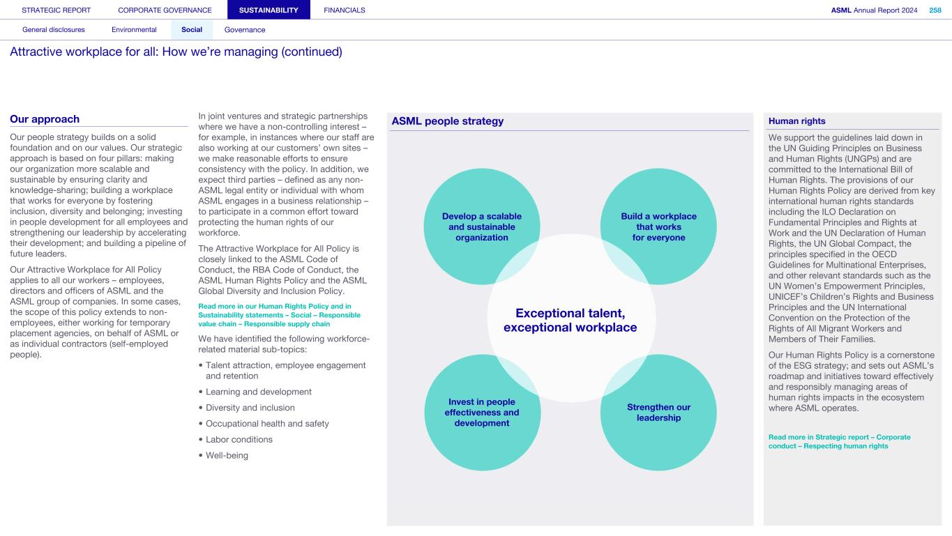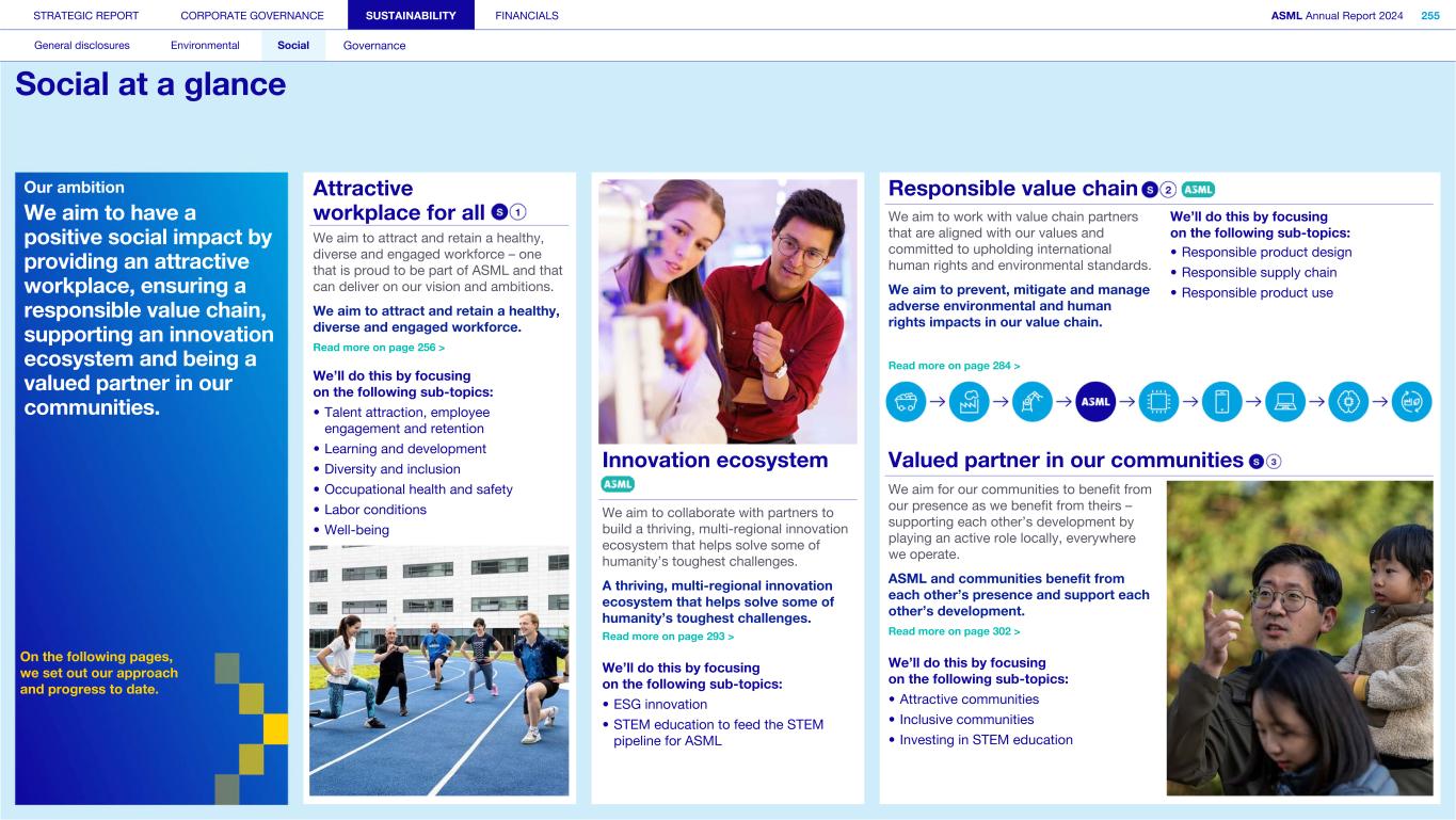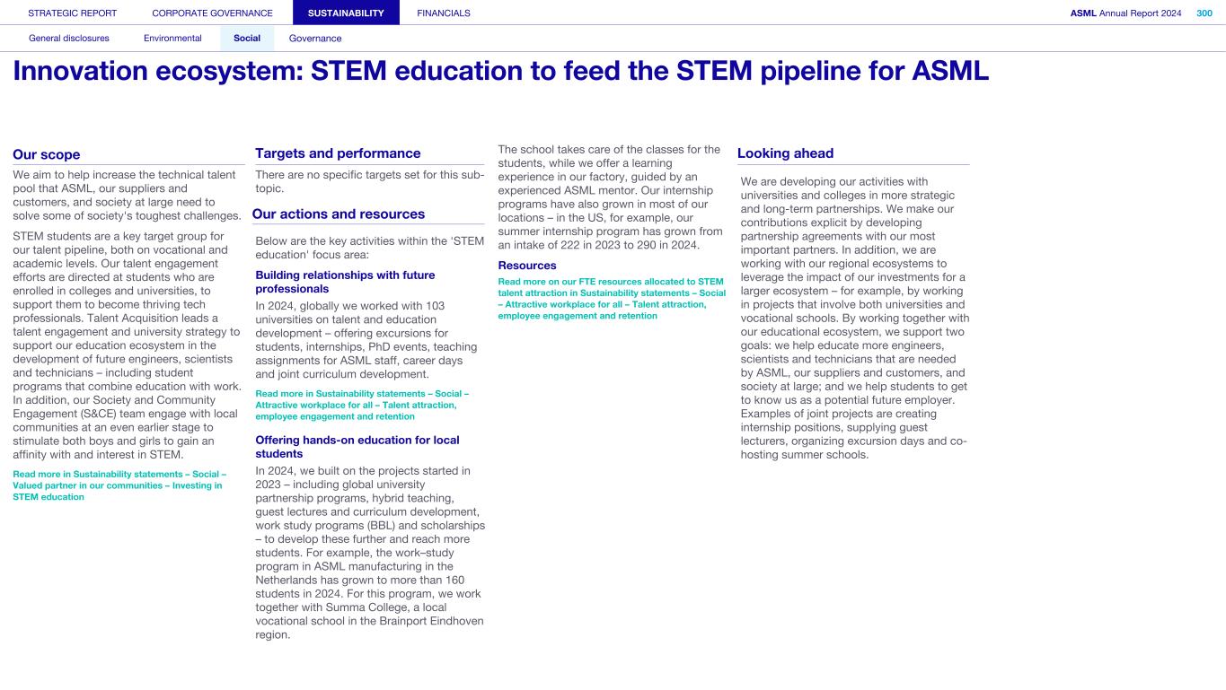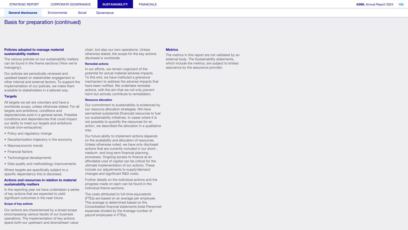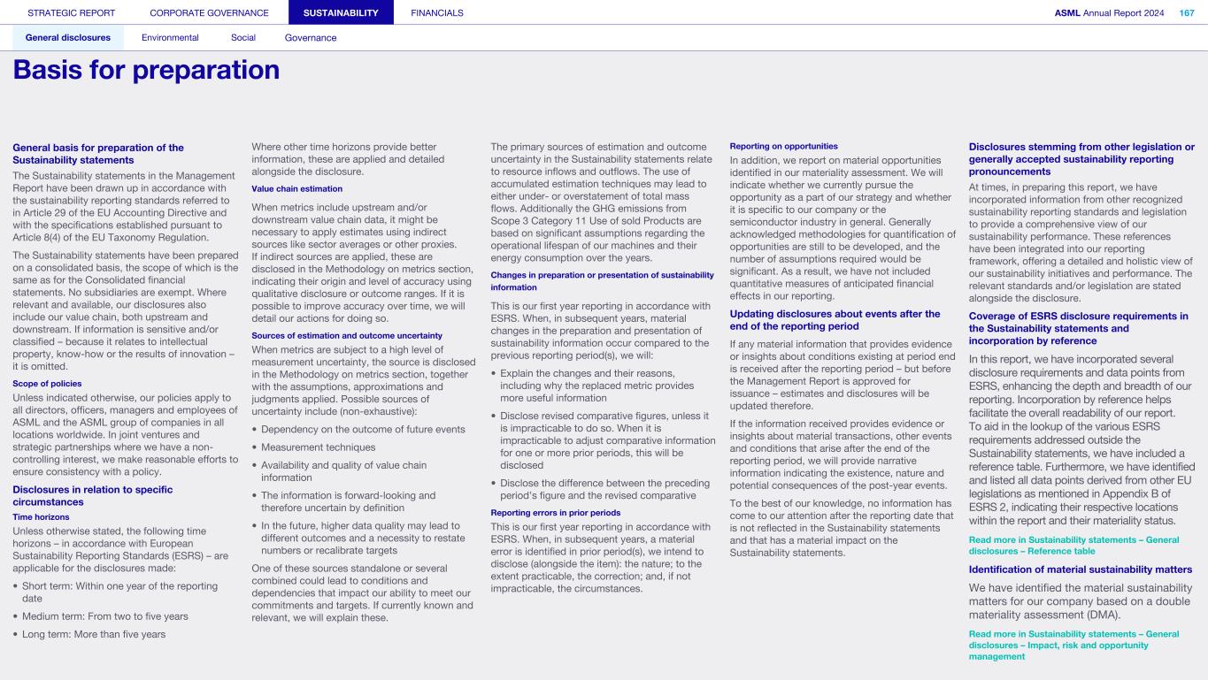 STRATEGIC REPORT CORPORATE GOVERNANCE SUSTAINABILITY FINANCIALS ASML Annual Report 2024 318 General disclosures Environmental Social Governance ESG integrated governance ESG is part of all regular, day-to-day decision making Why it matters ...for the planet ...for ASML Sustainability matters to stakeholders up and down our value chain, and together we are building a shared consensus of the importance of ESG-driven thinking. Integrity, honesty and transparency inform our entire ESG approach, including the decisions we make and disclose about our performance. As part of this, to ensure we can create long-term value for our stakeholders, we want to have good relationships with our stakeholders and support those who are more vulnerable, ensure compliance with data privacy regulations, and have more political engagement with regard to ESG topics. We aim to act on our responsibilities and anchor ESG sustainability across our entire business. Robust integrated governance policies and an ongoing commitment to responsible business conduct and risk management are essential. Ethics and compliance are a foundation to our sustainability strategy. We aim to foster a fair, transparent and inclusive culture – one where people feel empowered to speak up about the changes needed to make our sustainability transition a success. Our policies affect different groups of stakeholders: customers, employees, suppliers, shareholders and society at large. Having their trust and collaborating with these groups to inform our wider ESG strategy is important: ...for our customers We aim to be a trusted supplier. We have corporate policies and procedures in place detailing our principles and compliance, guiding us in making the right decisions and living up to our values. ...for our employees They will only feel empowered to share their views if we foster a culture of transparency and respect – which is why our Integrated Governance Policy is based on our company values, purpose, vision and mission. ...for our suppliers We aim to inform our suppliers to ensure we conduct business in a compliant way, compliant with applicable laws and regulations in all countries we operate in. ...for our shareholders We aim to report transparently so our shareholders can make well- informed decisions. ...for society We aim to be transparent about the economic, environmental and social impact of our activities and our performance goals, metrics and results. Read more about our double materiality process and identified impacts, risks and opportunities for this theme in Sustainability statements – General disclosures – Impact, risk and opportunity management