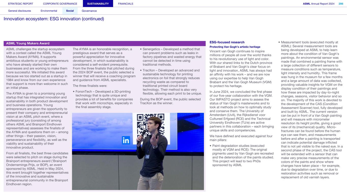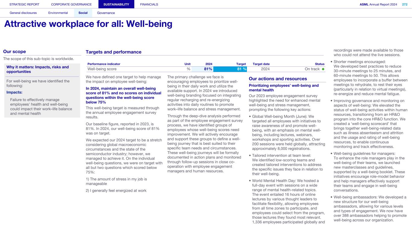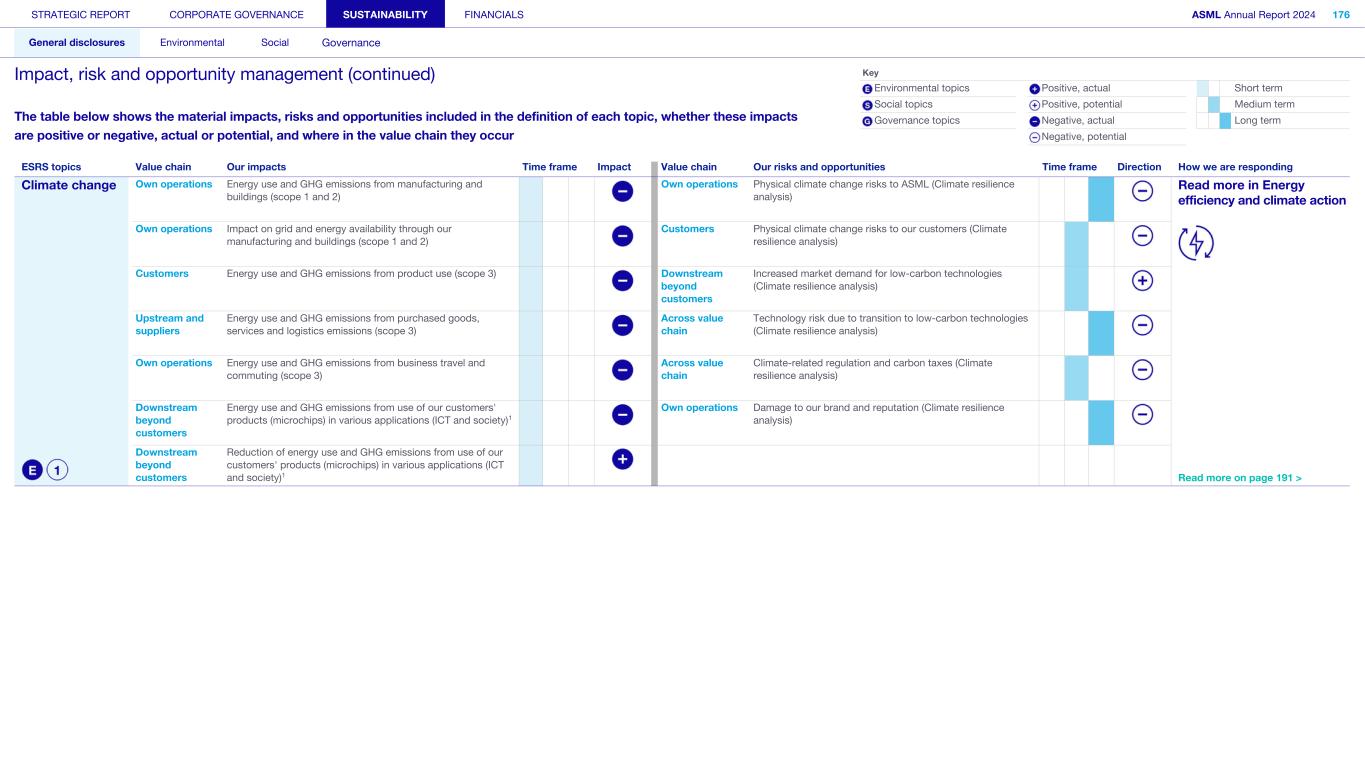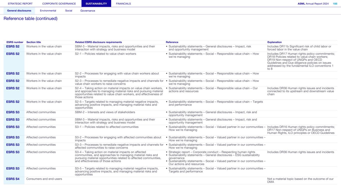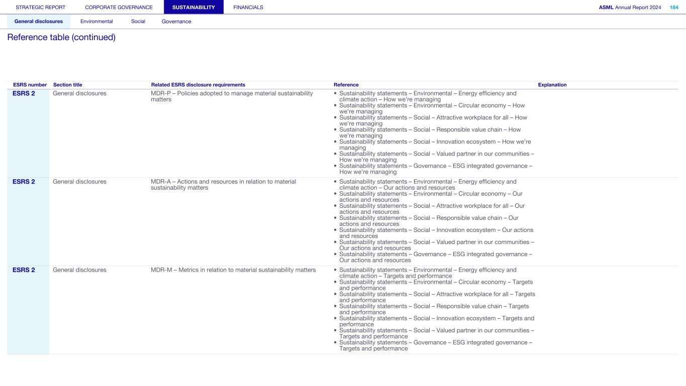 STRATEGIC REPORT CORPORATE GOVERNANCE SUSTAINABILITY FINANCIALS ASML Annual Report 2024 318 General disclosures Environmental Social Governance ESG integrated governance ESG is part of all regular, day-to-day decision making Why it matters ...for the planet ...for ASML Sustainability matters to stakeholders up and down our value chain, and together we are building a shared consensus of the importance of ESG-driven thinking. Integrity, honesty and transparency inform our entire ESG approach, including the decisions we make and disclose about our performance. As part of this, to ensure we can create long-term value for our stakeholders, we want to have good relationships with our stakeholders and support those who are more vulnerable, ensure compliance with data privacy regulations, and have more political engagement with regard to ESG topics. We aim to act on our responsibilities and anchor ESG sustainability across our entire business. Robust integrated governance policies and an ongoing commitment to responsible business conduct and risk management are essential. Ethics and compliance are a foundation to our sustainability strategy. We aim to foster a fair, transparent and inclusive culture – one where people feel empowered to speak up about the changes needed to make our sustainability transition a success. Our policies affect different groups of stakeholders: customers, employees, suppliers, shareholders and society at large. Having their trust and collaborating with these groups to inform our wider ESG strategy is important: ...for our customers We aim to be a trusted supplier. We have corporate policies and procedures in place detailing our principles and compliance, guiding us in making the right decisions and living up to our values. ...for our employees They will only feel empowered to share their views if we foster a culture of transparency and respect – which is why our Integrated Governance Policy is based on our company values, purpose, vision and mission. ...for our suppliers We aim to inform our suppliers to ensure we conduct business in a compliant way, compliant with applicable laws and regulations in all countries we operate in. ...for our shareholders We aim to report transparently so our shareholders can make well- informed decisions. ...for society We aim to be transparent about the economic, environmental and social impact of our activities and our performance goals, metrics and results. Read more about our double materiality process and identified impacts, risks and opportunities for this theme in Sustainability statements – General disclosures – Impact, risk and opportunity management