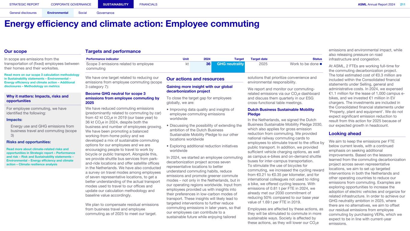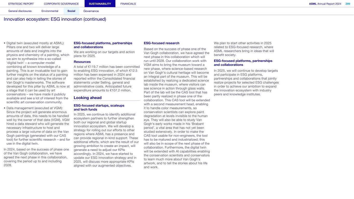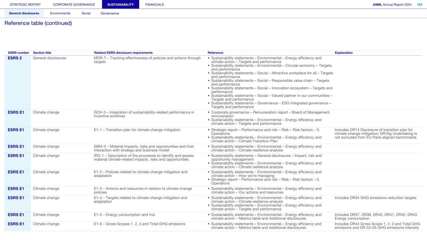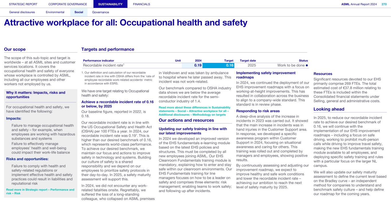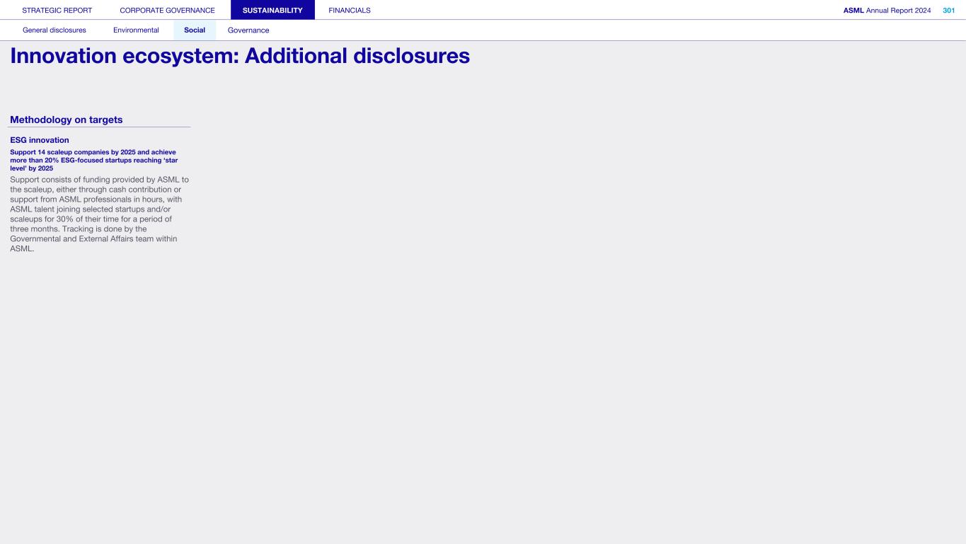 STRATEGIC REPORT CORPORATE GOVERNANCE SUSTAINABILITY FINANCIALS ASML Annual Report 2024 318 General disclosures Environmental Social Governance ESG integrated governance ESG is part of all regular, day-to-day decision making Why it matters ...for the planet ...for ASML Sustainability matters to stakeholders up and down our value chain, and together we are building a shared consensus of the importance of ESG-driven thinking. Integrity, honesty and transparency inform our entire ESG approach, including the decisions we make and disclose about our performance. As part of this, to ensure we can create long-term value for our stakeholders, we want to have good relationships with our stakeholders and support those who are more vulnerable, ensure compliance with data privacy regulations, and have more political engagement with regard to ESG topics. We aim to act on our responsibilities and anchor ESG sustainability across our entire business. Robust integrated governance policies and an ongoing commitment to responsible business conduct and risk management are essential. Ethics and compliance are a foundation to our sustainability strategy. We aim to foster a fair, transparent and inclusive culture – one where people feel empowered to speak up about the changes needed to make our sustainability transition a success. Our policies affect different groups of stakeholders: customers, employees, suppliers, shareholders and society at large. Having their trust and collaborating with these groups to inform our wider ESG strategy is important: ...for our customers We aim to be a trusted supplier. We have corporate policies and procedures in place detailing our principles and compliance, guiding us in making the right decisions and living up to our values. ...for our employees They will only feel empowered to share their views if we foster a culture of transparency and respect – which is why our Integrated Governance Policy is based on our company values, purpose, vision and mission. ...for our suppliers We aim to inform our suppliers to ensure we conduct business in a compliant way, compliant with applicable laws and regulations in all countries we operate in. ...for our shareholders We aim to report transparently so our shareholders can make well- informed decisions. ...for society We aim to be transparent about the economic, environmental and social impact of our activities and our performance goals, metrics and results. Read more about our double materiality process and identified impacts, risks and opportunities for this theme in Sustainability statements – General disclosures – Impact, risk and opportunity management