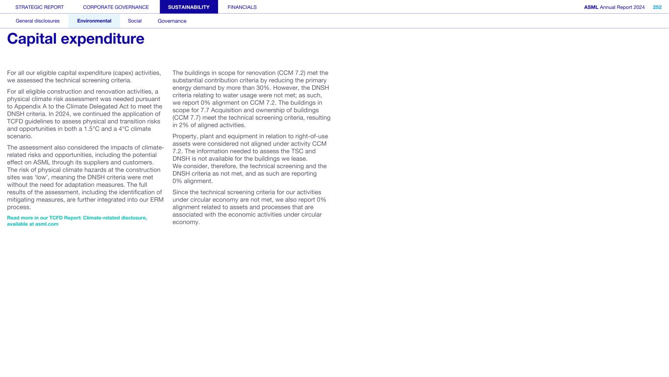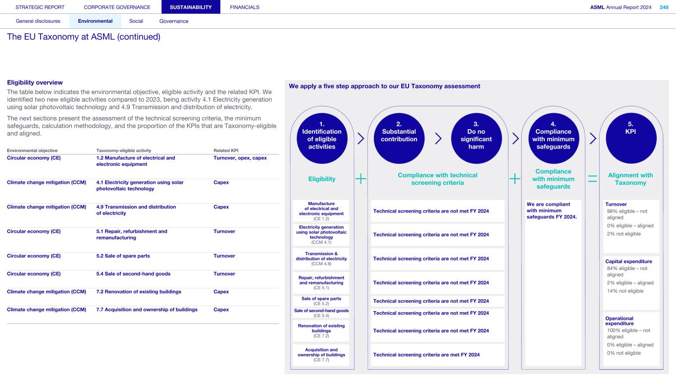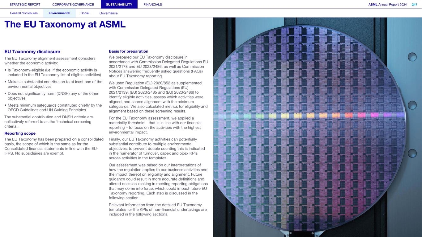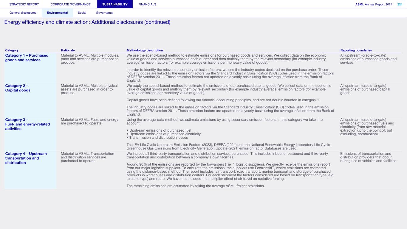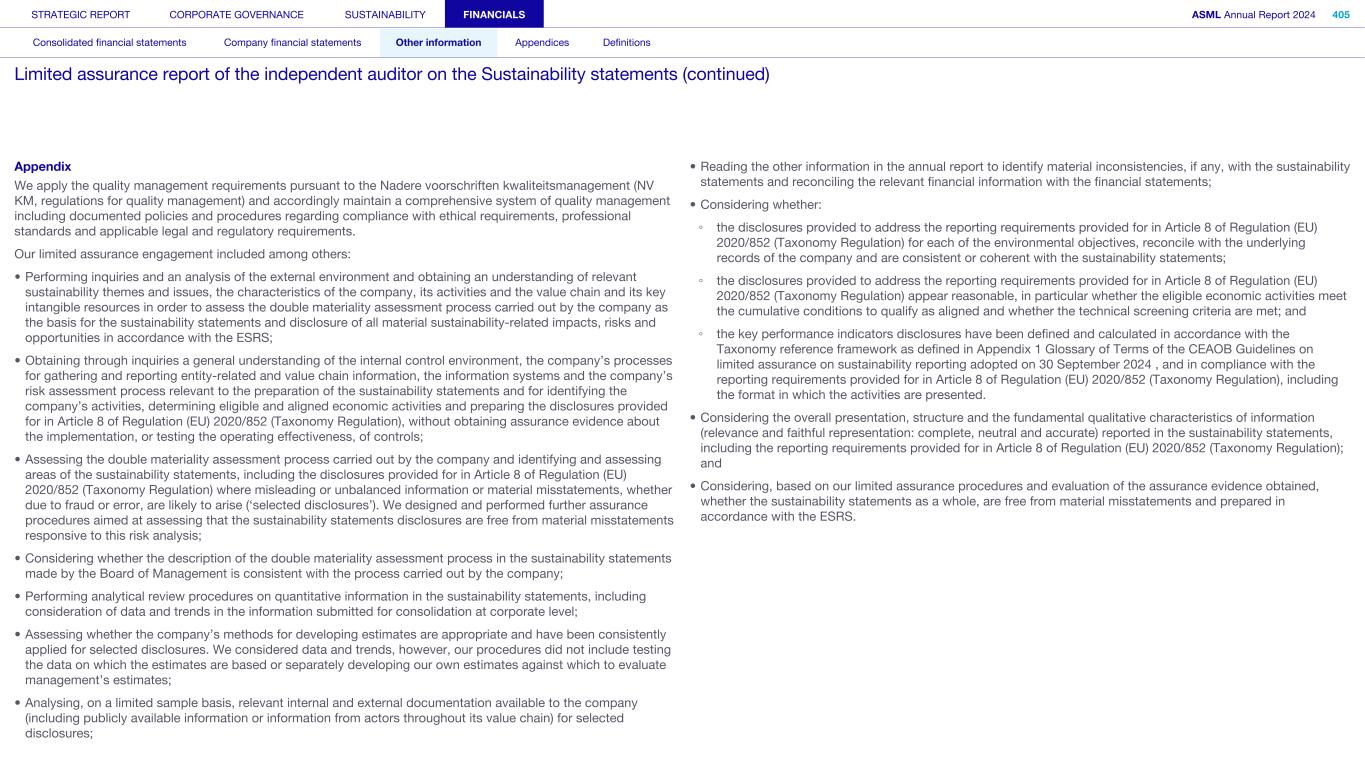 Appendix We apply the quality management requirements pursuant to the Nadere voorschriften kwaliteitsmanagement (NV KM, regulations for quality management) and accordingly maintain a comprehensive system of quality management including documented policies and procedures regarding compliance with ethical requirements, professional standards and applicable legal and regulatory requirements. Our limited assurance engagement included among others: • Performing inquiries and an analysis of the external environment and obtaining an understanding of relevant sustainability themes and issues, the characteristics of the company, its activities and the value chain and its key intangible resources in order to assess the double materiality assessment process carried out by the company as the basis for the sustainability statements and disclosure of all material sustainability-related impacts, risks and opportunities in accordance with the ESRS; • Obtaining through inquiries a general understanding of the internal control environment, the company’s processes for gathering and reporting entity-related and value chain information, the information systems and the company’s risk assessment process relevant to the preparation of the sustainability statements and for identifying the company’s activities, determining eligible and aligned economic activities and preparing the disclosures provided for in Article 8 of Regulation (EU) 2020/852 (Taxonomy Regulation), without obtaining assurance evidence about the implementation, or testing the operating effectiveness, of controls; • Assessing the double materiality assessment process carried out by the company and identifying and assessing areas of the sustainability statements, including the disclosures provided for in Article 8 of Regulation (EU) 2020/852 (Taxonomy Regulation) where misleading or unbalanced information or material misstatements, whether due to fraud or error, are likely to arise (‘selected disclosures’). We designed and performed further assurance procedures aimed at assessing that the sustainability statements disclosures are free from material misstatements responsive to this risk analysis; • Considering whether the description of the double materiality assessment process in the sustainability statements made by the Board of Management is consistent with the process carried out by the company; • Performing analytical review procedures on quantitative information in the sustainability statements, including consideration of data and trends in the information submitted for consolidation at corporate level; • Assessing whether the company’s methods for developing estimates are appropriate and have been consistently applied for selected disclosures. We considered data and trends, however, our procedures did not include testing the data on which the estimates are based or separately developing our own estimates against which to evaluate management’s estimates; • Analysing, on a limited sample basis, relevant internal and external documentation available to the company (including publicly available information or information from actors throughout its value chain) for selected disclosures; • Reading the other information in the annual report to identify material inconsistencies, if any, with the sustainability statements and reconciling the relevant financial information with the financial statements; • Considering whether: ◦ the disclosures provided to address the reporting requirements provided for in Article 8 of Regulation (EU) 2020/852 (Taxonomy Regulation) for each of the environmental objectives, reconcile with the underlying records of the company and are consistent or coherent with the sustainability statements; ◦ the disclosures provided to address the reporting requirements provided for in Article 8 of Regulation (EU) 2020/852 (Taxonomy Regulation) appear reasonable, in particular whether the eligible economic activities meet the cumulative conditions to qualify as aligned and whether the technical screening criteria are met; and ◦ the key performance indicators disclosures have been defined and calculated in accordance with the Taxonomy reference framework as defined in Appendix 1 Glossary of Terms of the CEAOB Guidelines on limited assurance on sustainability reporting adopted on 30 September 2024 , and in compliance with the reporting requirements provided for in Article 8 of Regulation (EU) 2020/852 (Taxonomy Regulation), including the format in which the activities are presented. • Considering the overall presentation, structure and the fundamental qualitative characteristics of information (relevance and faithful representation: complete, neutral and accurate) reported in the sustainability statements, including the reporting requirements provided for in Article 8 of Regulation (EU) 2020/852 (Taxonomy Regulation); and • Considering, based on our limited assurance procedures and evaluation of the assurance evidence obtained, whether the sustainability statements as a whole, are free from material misstatements and prepared in accordance with the ESRS. STRATEGIC REPORT CORPORATE GOVERNANCE SUSTAINABILITY FINANCIALS ASML Annual Report 2024 405 Consolidated financial statements Company financial statements Other information Appendices Definitions Limited assurance report of the independent auditor on the Sustainability statements (continued)