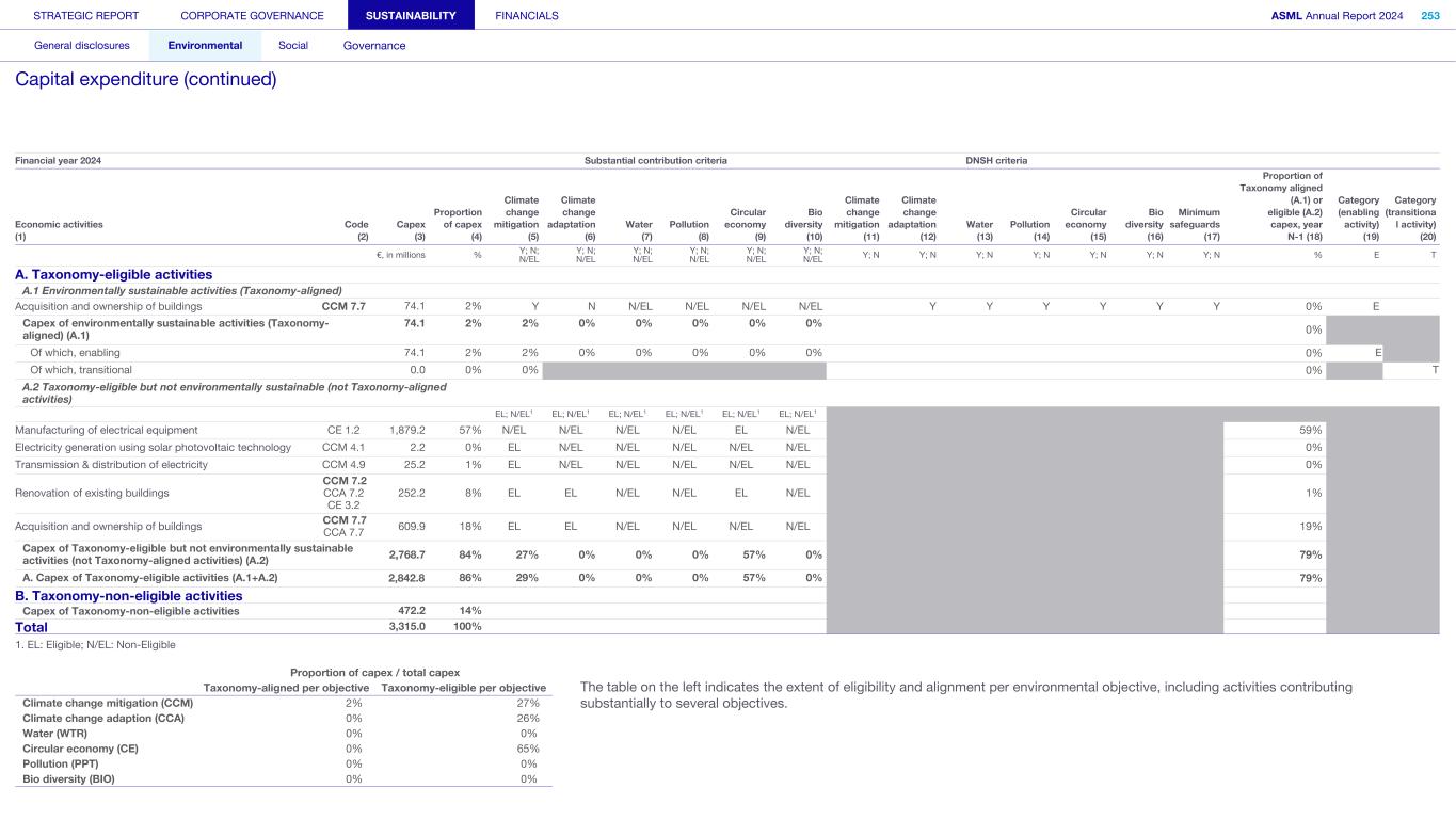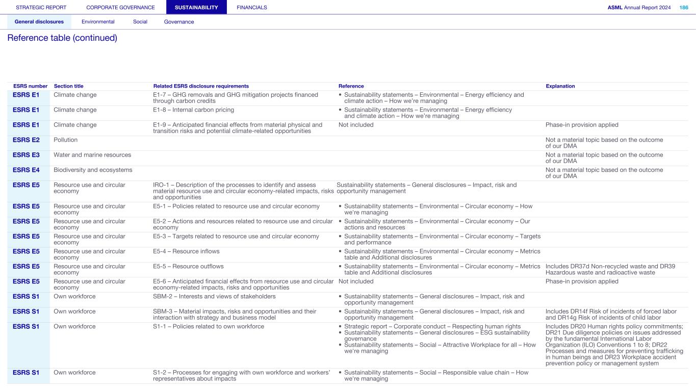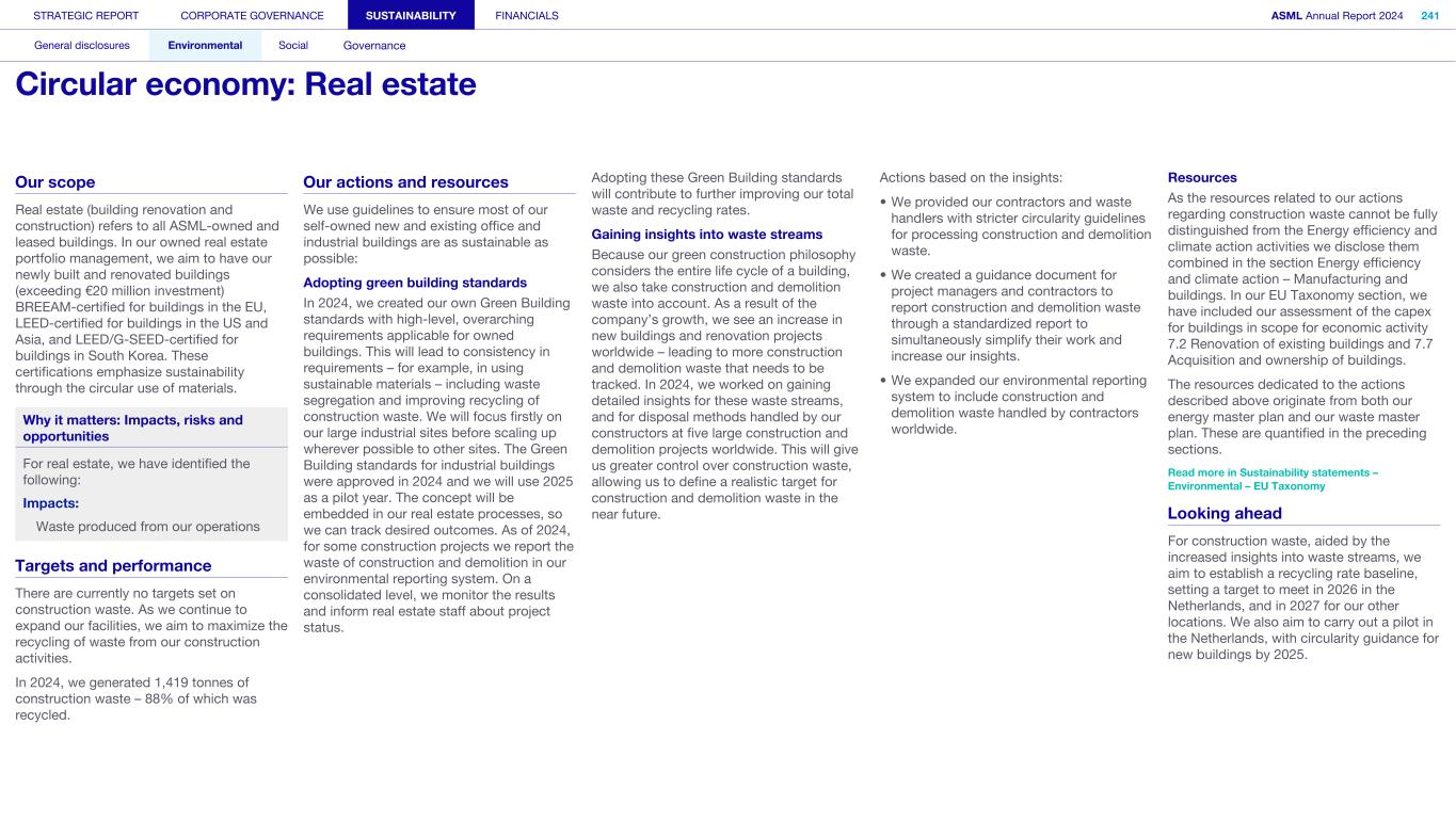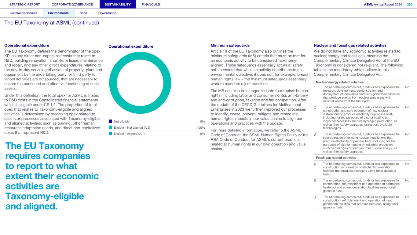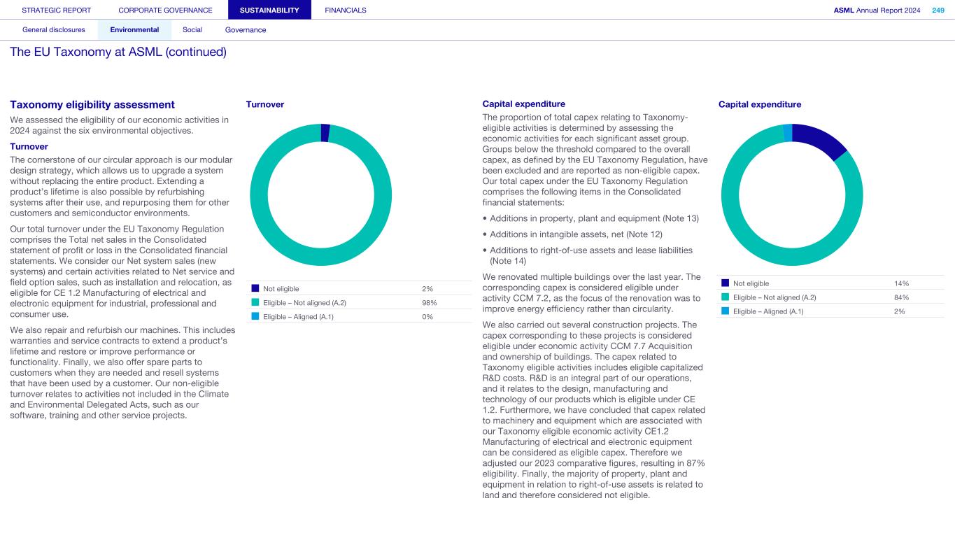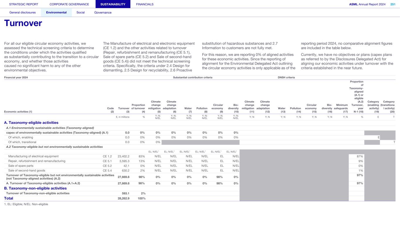Appendix We apply the quality management requirements pursuant to the Nadere voorschriften kwaliteitsmanagement (NV KM, regulations for quality management) and accordingly maintain a comprehensive system of quality management including documented policies and procedures regarding compliance with ethical requirements, professional standards and applicable legal and regulatory requirements. Our limited assurance engagement included among others: • Performing inquiries and an analysis of the external environment and obtaining an understanding of relevant sustainability themes and issues, the characteristics of the company, its activities and the value chain and its key intangible resources in order to assess the double materiality assessment process carried out by the company as the basis for the sustainability statements and disclosure of all material sustainability-related impacts, risks and opportunities in accordance with the ESRS; • Obtaining through inquiries a general understanding of the internal control environment, the company’s processes for gathering and reporting entity-related and value chain information, the information systems and the company’s risk assessment process relevant to the preparation of the sustainability statements and for identifying the company’s activities, determining eligible and aligned economic activities and preparing the disclosures provided for in Article 8 of Regulation (EU) 2020/852 (Taxonomy Regulation), without obtaining assurance evidence about the implementation, or testing the operating effectiveness, of controls; • Assessing the double materiality assessment process carried out by the company and identifying and assessing areas of the sustainability statements, including the disclosures provided for in Article 8 of Regulation (EU) 2020/852 (Taxonomy Regulation) where misleading or unbalanced information or material misstatements, whether due to fraud or error, are likely to arise (‘selected disclosures’). We designed and performed further assurance procedures aimed at assessing that the sustainability statements disclosures are free from material misstatements responsive to this risk analysis; • Considering whether the description of the double materiality assessment process in the sustainability statements made by the Board of Management is consistent with the process carried out by the company; • Performing analytical review procedures on quantitative information in the sustainability statements, including consideration of data and trends in the information submitted for consolidation at corporate level; • Assessing whether the company’s methods for developing estimates are appropriate and have been consistently applied for selected disclosures. We considered data and trends, however, our procedures did not include testing the data on which the estimates are based or separately developing our own estimates against which to evaluate management’s estimates; • Analysing, on a limited sample basis, relevant internal and external documentation available to the company (including publicly available information or information from actors throughout its value chain) for selected disclosures; • Reading the other information in the annual report to identify material inconsistencies, if any, with the sustainability statements and reconciling the relevant financial information with the financial statements; • Considering whether: ◦ the disclosures provided to address the reporting requirements provided for in Article 8 of Regulation (EU) 2020/852 (Taxonomy Regulation) for each of the environmental objectives, reconcile with the underlying records of the company and are consistent or coherent with the sustainability statements; ◦ the disclosures provided to address the reporting requirements provided for in Article 8 of Regulation (EU) 2020/852 (Taxonomy Regulation) appear reasonable, in particular whether the eligible economic activities meet the cumulative conditions to qualify as aligned and whether the technical screening criteria are met; and ◦ the key performance indicators disclosures have been defined and calculated in accordance with the Taxonomy reference framework as defined in Appendix 1 Glossary of Terms of the CEAOB Guidelines on limited assurance on sustainability reporting adopted on 30 September 2024 , and in compliance with the reporting requirements provided for in Article 8 of Regulation (EU) 2020/852 (Taxonomy Regulation), including the format in which the activities are presented. • Considering the overall presentation, structure and the fundamental qualitative characteristics of information (relevance and faithful representation: complete, neutral and accurate) reported in the sustainability statements, including the reporting requirements provided for in Article 8 of Regulation (EU) 2020/852 (Taxonomy Regulation); and • Considering, based on our limited assurance procedures and evaluation of the assurance evidence obtained, whether the sustainability statements as a whole, are free from material misstatements and prepared in accordance with the ESRS. STRATEGIC REPORT CORPORATE GOVERNANCE SUSTAINABILITY FINANCIALS ASML Annual Report 2024 405 Consolidated financial statements Company financial statements Other information Appendices Definitions Limited assurance report of the independent auditor on the Sustainability statements (continued)