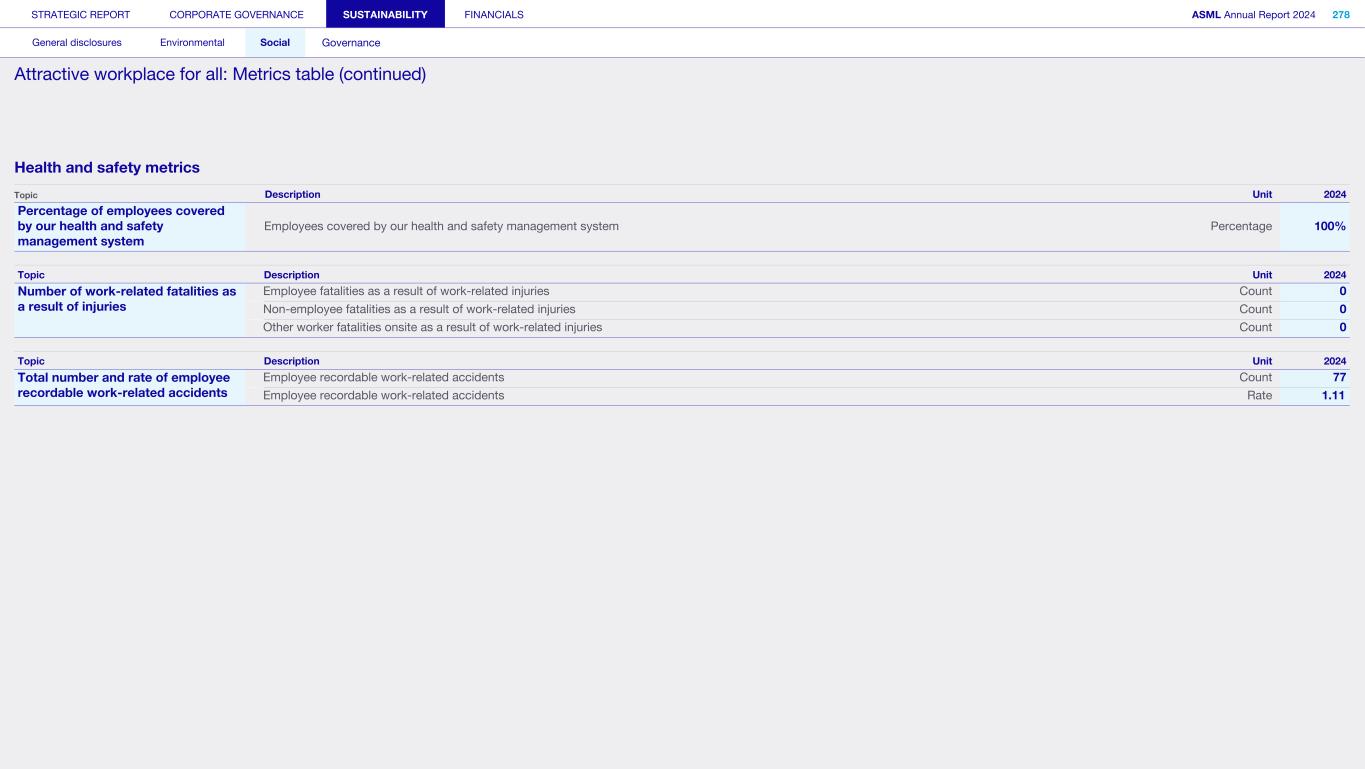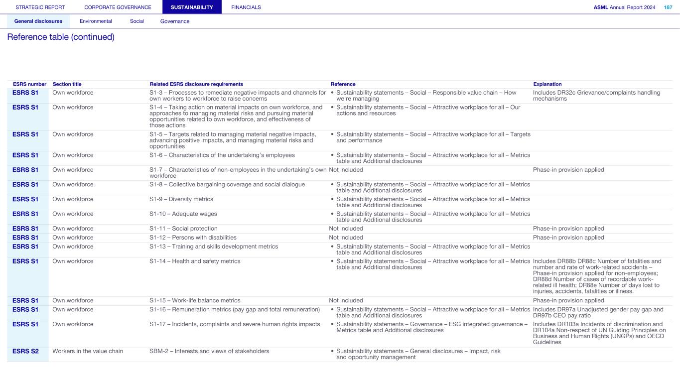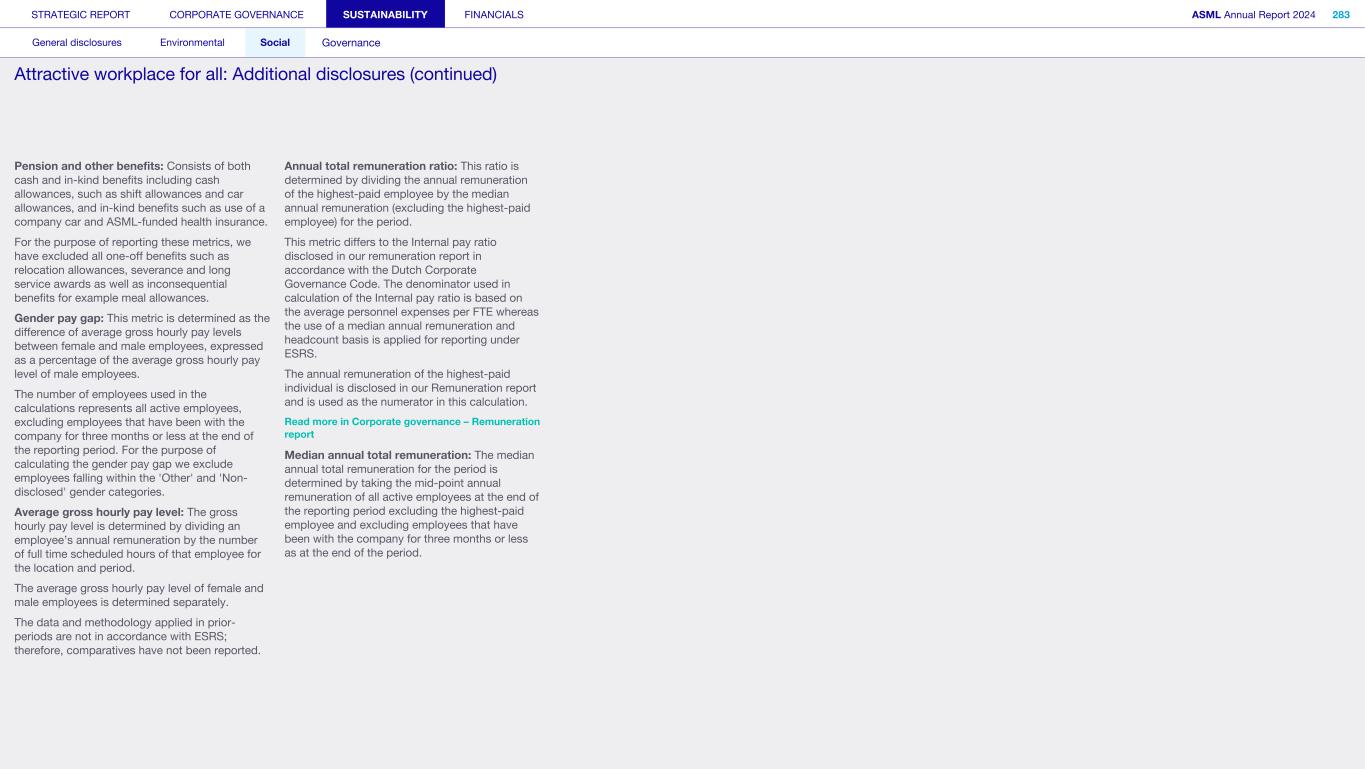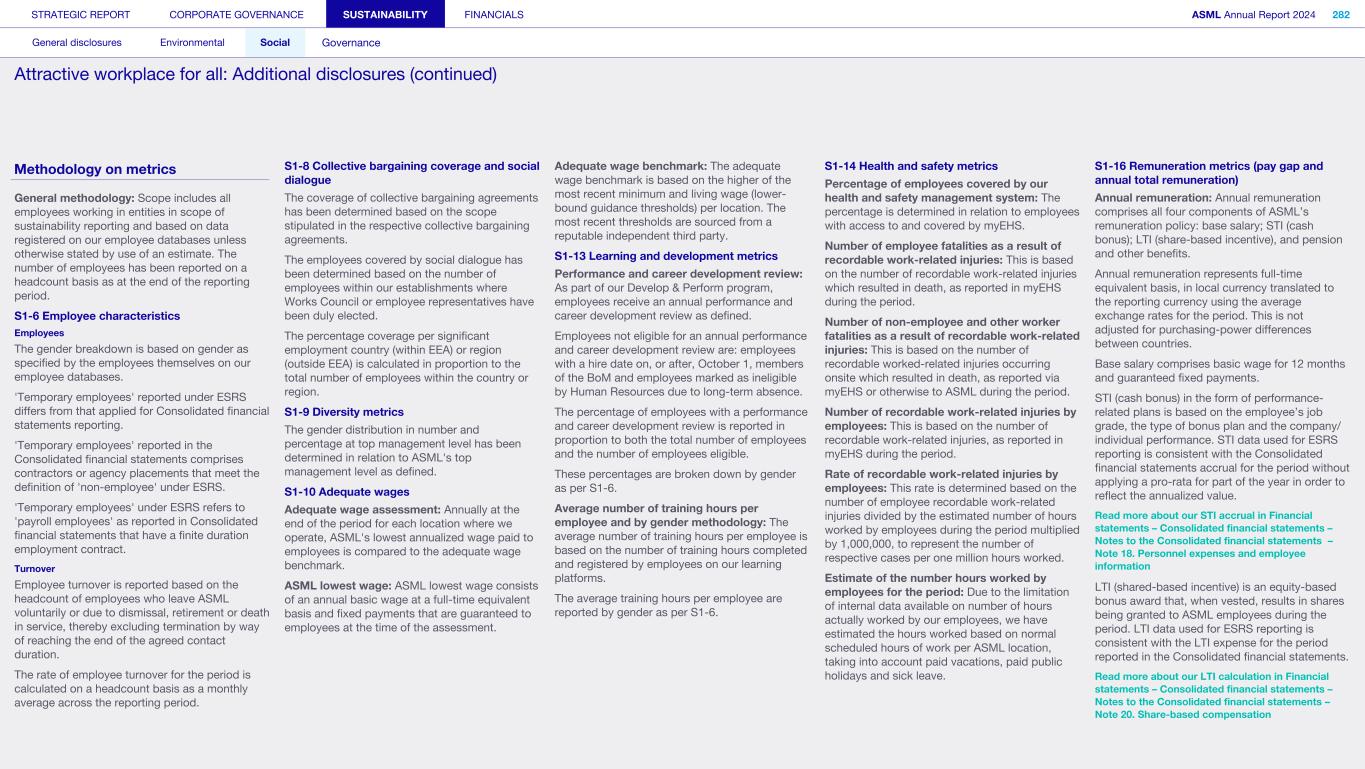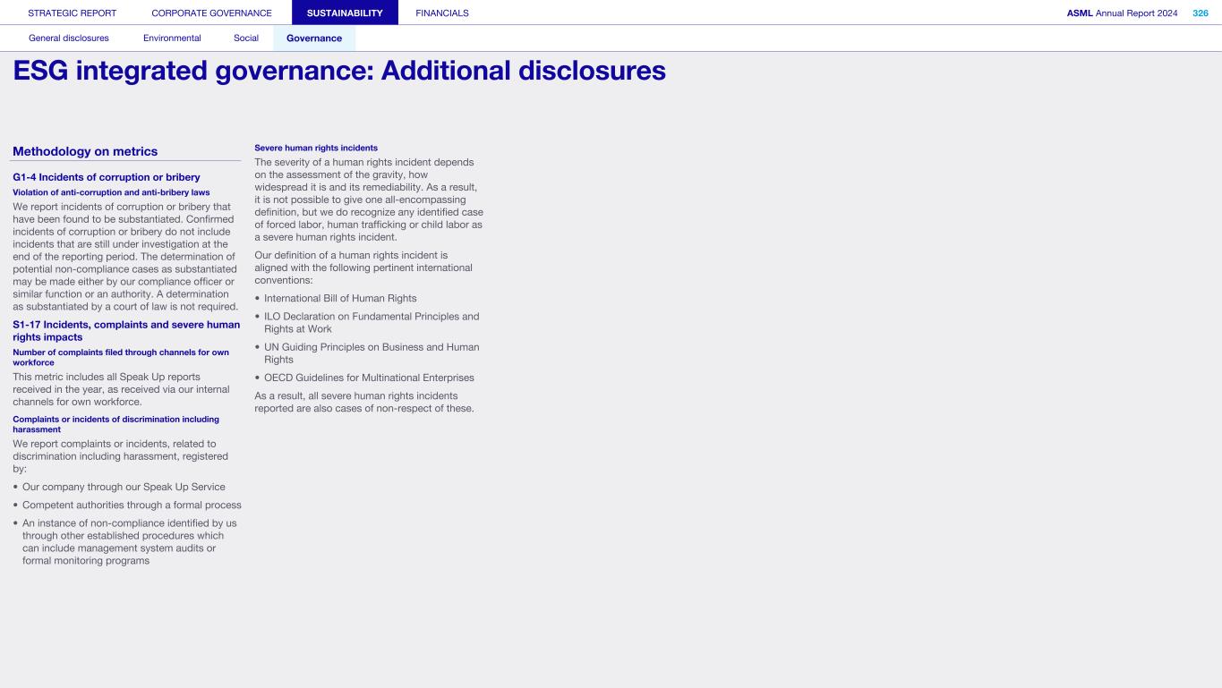 Methodology on metrics G1-4 Incidents of corruption or bribery Violation of anti-corruption and anti-bribery laws We report incidents of corruption or bribery that have been found to be substantiated. Confirmed incidents of corruption or bribery do not include incidents that are still under investigation at the end of the reporting period. The determination of potential non-compliance cases as substantiated may be made either by our compliance officer or similar function or an authority. A determination as substantiated by a court of law is not required. S1-17 Incidents, complaints and severe human rights impacts Number of complaints filed through channels for own workforce This metric includes all Speak Up reports received in the year, as received via our internal channels for own workforce. Complaints or incidents of discrimination including harassment We report complaints or incidents, related to discrimination including harassment, registered by: • Our company through our Speak Up Service • Competent authorities through a formal process • An instance of non-compliance identified by us through other established procedures which can include management system audits or formal monitoring programs Severe human rights incidents The severity of a human rights incident depends on the assessment of the gravity, how widespread it is and its remediability. As a result, it is not possible to give one all-encompassing definition, but we do recognize any identified case of forced labor, human trafficking or child labor as a severe human rights incident. Our definition of a human rights incident is aligned with the following pertinent international conventions: • International Bill of Human Rights • ILO Declaration on Fundamental Principles and Rights at Work • UN Guiding Principles on Business and Human Rights • OECD Guidelines for Multinational Enterprises As a result, all severe human rights incidents reported are also cases of non-respect of these. STRATEGIC REPORT CORPORATE GOVERNANCE SUSTAINABILITY FINANCIALS ASML Annual Report 2024 326 General disclosures Environmental Social Governance ESG integrated governance: Additional disclosures