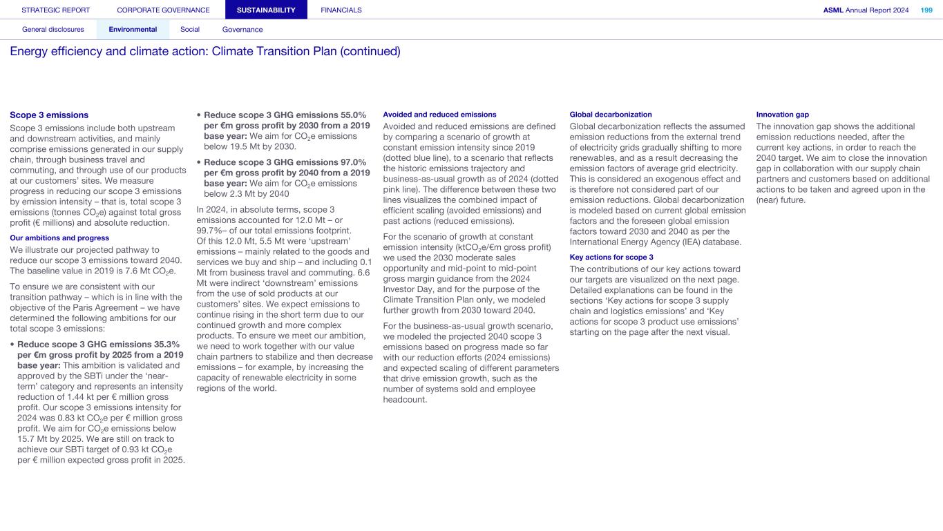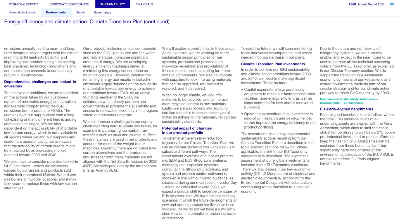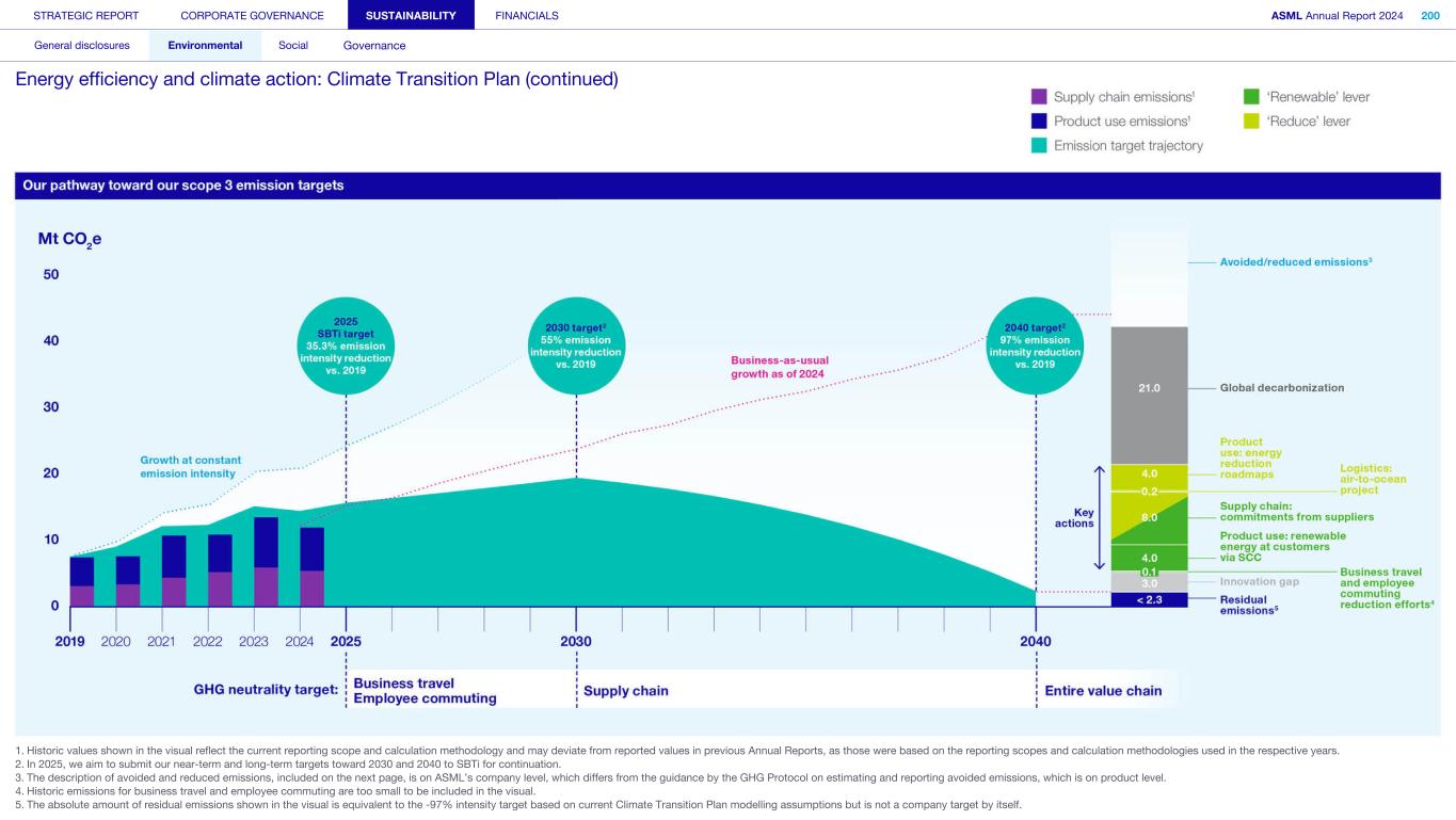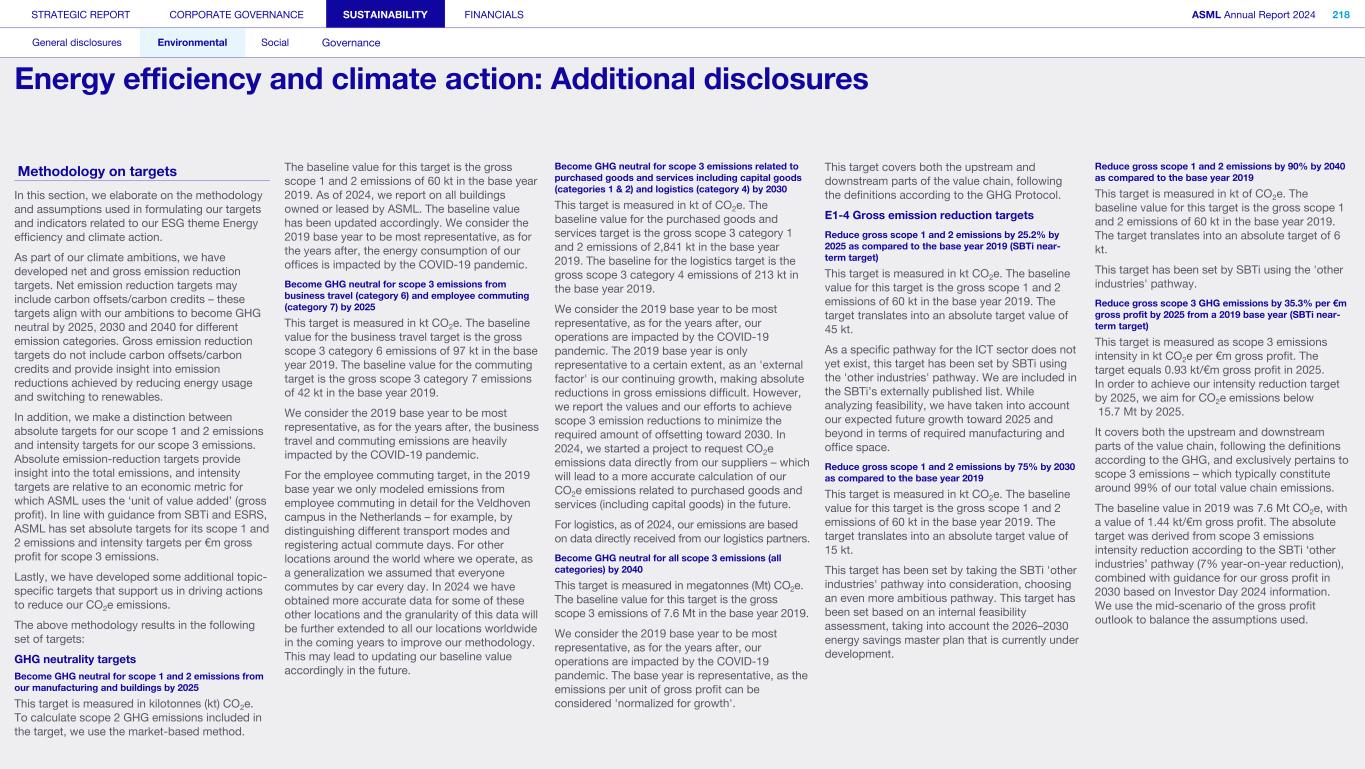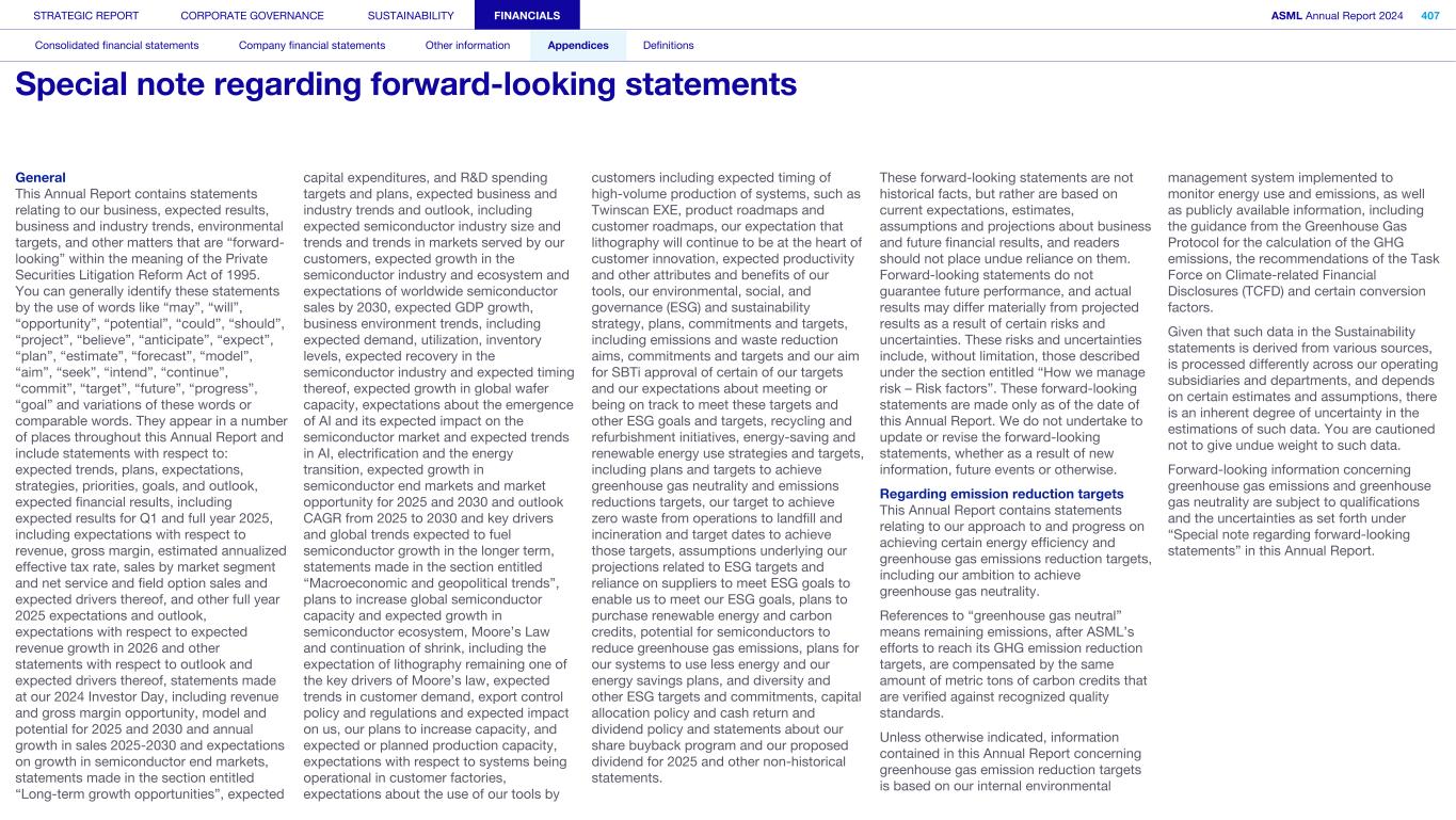 General This Annual Report contains statements relating to our business, expected results, business and industry trends, environmental targets, and other matters that are “forward- looking” within the meaning of the Private Securities Litigation Reform Act of 1995. You can generally identify these statements by the use of words like “may”, “will”, “opportunity”, “potential”, “could”, “should”, “project”, “believe”, “anticipate”, “expect”, “plan”, “estimate”, “forecast”, “model”, “aim”, “seek”, “intend”, “continue”, “commit”, “target”, “future”, “progress”, “goal” and variations of these words or comparable words. They appear in a number of places throughout this Annual Report and include statements with respect to: expected trends, plans, expectations, strategies, priorities, goals, and outlook, expected financial results, including expected results for Q1 and full year 2025, including expectations with respect to revenue, gross margin, estimated annualized effective tax rate, sales by market segment and net service and field option sales and expected drivers thereof, and other full year 2025 expectations and outlook, expectations with respect to expected revenue growth in 2026 and other statements with respect to outlook and expected drivers thereof, statements made at our 2024 Investor Day, including revenue and gross margin opportunity, model and potential for 2025 and 2030 and annual growth in sales 2025-2030 and expectations on growth in semiconductor end markets, statements made in the section entitled “Long-term growth opportunities”, expected capital expenditures, and R&D spending targets and plans, expected business and industry trends and outlook, including expected semiconductor industry size and trends and trends in markets served by our customers, expected growth in the semiconductor industry and ecosystem and expectations of worldwide semiconductor sales by 2030, expected GDP growth, business environment trends, including expected demand, utilization, inventory levels, expected recovery in the semiconductor industry and expected timing thereof, expected growth in global wafer capacity, expectations about the emergence of AI and its expected impact on the semiconductor market and expected trends in AI, electrification and the energy transition, expected growth in semiconductor end markets and market opportunity for 2025 and 2030 and outlook CAGR from 2025 to 2030 and key drivers and global trends expected to fuel semiconductor growth in the longer term, statements made in the section entitled “Macroeconomic and geopolitical trends”, plans to increase global semiconductor capacity and expected growth in semiconductor ecosystem, Moore’s Law and continuation of shrink, including the expectation of lithography remaining one of the key drivers of Moore’s law, expected trends in customer demand, export control policy and regulations and expected impact on us, our plans to increase capacity, and expected or planned production capacity, expectations with respect to systems being operational in customer factories, expectations about the use of our tools by customers including expected timing of high-volume production of systems, such as Twinscan EXE, product roadmaps and customer roadmaps, our expectation that lithography will continue to be at the heart of customer innovation, expected productivity and other attributes and benefits of our tools, our environmental, social, and governance (ESG) and sustainability strategy, plans, commitments and targets, including emissions and waste reduction aims, commitments and targets and our aim for SBTi approval of certain of our targets and our expectations about meeting or being on track to meet these targets and other ESG goals and targets, recycling and refurbishment initiatives, energy-saving and renewable energy use strategies and targets, including plans and targets to achieve greenhouse gas neutrality and emissions reductions targets, our target to achieve zero waste from operations to landfill and incineration and target dates to achieve those targets, assumptions underlying our projections related to ESG targets and reliance on suppliers to meet ESG goals to enable us to meet our ESG goals, plans to purchase renewable energy and carbon credits, potential for semiconductors to reduce greenhouse gas emissions, plans for our systems to use less energy and our energy savings plans, and diversity and other ESG targets and commitments, capital allocation policy and cash return and dividend policy and statements about our share buyback program and our proposed dividend for 2025 and other non-historical statements. These forward-looking statements are not historical facts, but rather are based on current expectations, estimates, assumptions and projections about business and future financial results, and readers should not place undue reliance on them. Forward-looking statements do not guarantee future performance, and actual results may differ materially from projected results as a result of certain risks and uncertainties. These risks and uncertainties include, without limitation, those described under the section entitled “How we manage risk – Risk factors”. These forward-looking statements are made only as of the date of this Annual Report. We do not undertake to update or revise the forward-looking statements, whether as a result of new information, future events or otherwise. Regarding emission reduction targets This Annual Report contains statements relating to our approach to and progress on achieving certain energy efficiency and greenhouse gas emissions reduction targets, including our ambition to achieve greenhouse gas neutrality. References to “greenhouse gas neutral” means remaining emissions, after ASML’s efforts to reach its GHG emission reduction targets, are compensated by the same amount of metric tons of c