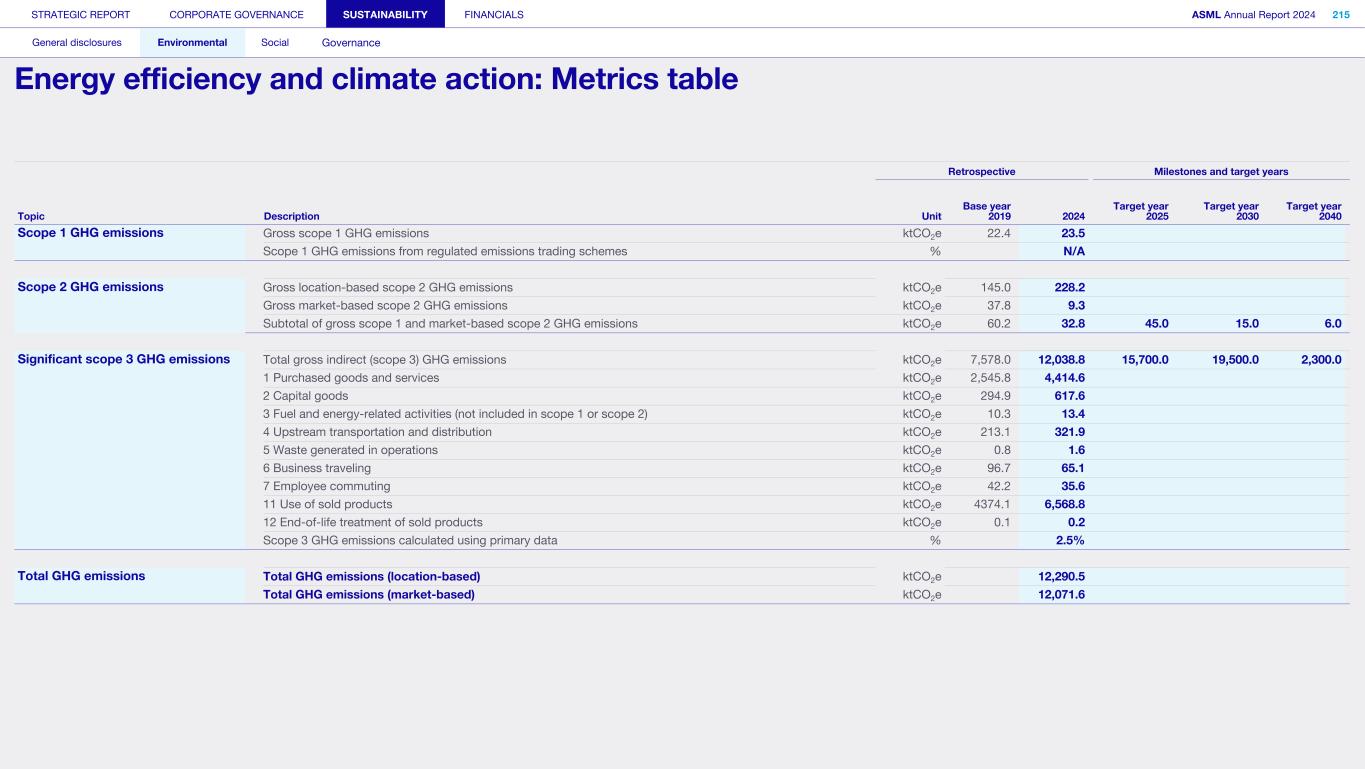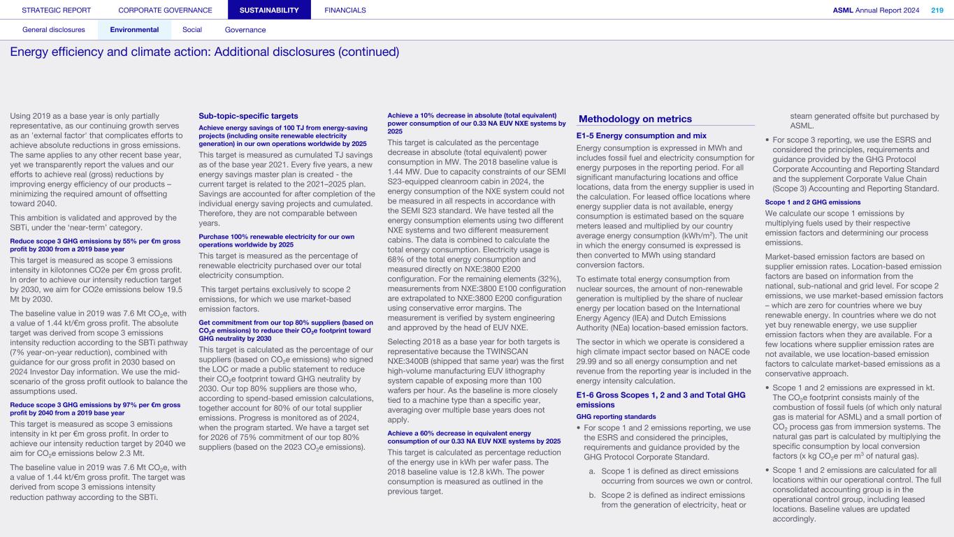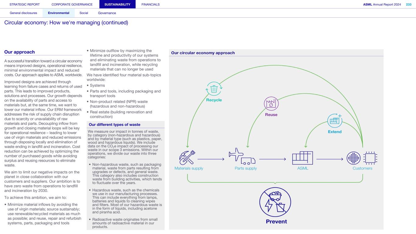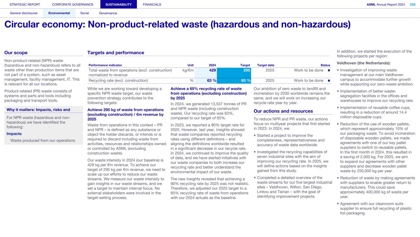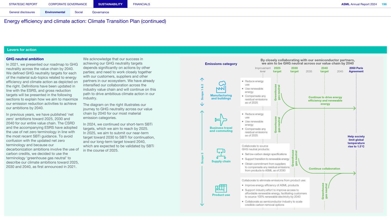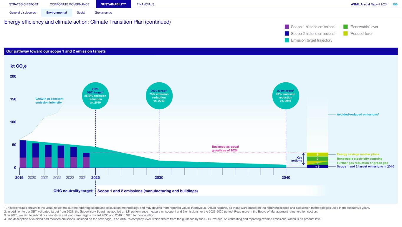 General This Annual Report contains statements relating to our business, expected results, business and industry trends, environmental targets, and other matters that are “forward- looking” within the meaning of the Private Securities Litigation Reform Act of 1995. You can generally identify these statements by the use of words like “may”, “will”, “opportunity”, “potential”, “could”, “should”, “project”, “believe”, “anticipate”, “expect”, “plan”, “estimate”, “forecast”, “model”, “aim”, “seek”, “intend”, “continue”, “commit”, “target”, “future”, “progress”, “goal” and variations of these words or comparable words. They appear in a number of places throughout this Annual Report and include statements with respect to: expected trends, plans, expectations, strategies, priorities, goals, and outlook, expected financial results, including expected results for Q1 and full year 2025, including expectations with respect to revenue, gross margin, estimated annualized effective tax rate, sales by market segment and net service and field option sales and expected drivers thereof, and other full year 2025 expectations and outlook, expectations with respect to expected revenue growth in 2026 and other statements with respect to outlook and expected drivers thereof, statements made at our 2024 Investor Day, including revenue and gross margin opportunity, model and potential for 2025 and 2030 and annual growth in sales 2025-2030 and expectations on growth in semiconductor end markets, statements made in the section entitled “Long-term growth opportunities”, expected capital expenditures, and R&D spending targets and plans, expected business and industry trends and outlook, including expected semiconductor industry size and trends and trends in markets served by our customers, expected growth in the semiconductor industry and ecosystem and expectations of worldwide semiconductor sales by 2030, expected GDP growth, business environment trends, including expected demand, utilization, inventory levels, expected recovery in the semiconductor industry and expected timing thereof, expected growth in global wafer capacity, expectations about the emergence of AI and its expected impact on the semiconductor market and expected trends in AI, electrification and the energy transition, expected growth in semiconductor end markets and market opportunity for 2025 and 2030 and outlook CAGR from 2025 to 2030 and key drivers and global trends expected to fuel semiconductor growth in the longer term, statements made in the section entitled “Macroeconomic and geopolitical trends”, plans to increase global semiconductor capacity and expected growth in semiconductor ecosystem, Moore’s Law and continuation of shrink, including the expectation of lithography remaining one of the key drivers of Moore’s law, expected trends in customer demand, export control policy and regulations and expected impact on us, our plans to increase capacity, and expected or planned production capacity, expectations with respect to systems being operational in customer factories, expectations about the use of our tools by customers including expected timing of high-volume production of systems, such as Twinscan EXE, product roadmaps and customer roadmaps, our expectation that lithography will continue to be at the heart of customer innovation, expected productivity and other attributes and benefits of our tools, our environmental, social, and governance (ESG) and sustainability strategy, plans, commitments and targets, including emissions and waste reduction aims, commitments and targets and our aim for SBTi approval of certain of our targets and our expectations about meeting or being on track to meet these targets and other ESG goals and targets, recycling and refurbishment initiatives, energy-saving and renewable energy use strategies and targets, including plans and targets to achieve greenhouse gas neutrality and emissions reductions targets, our target to achieve zero waste from operations to landfill and incineration and target dates to achieve those targets, assumptions underlying our projections related to ESG targets and reliance on suppliers to meet ESG goals to enable us to meet our ESG goals, plans to purchase renewable energy and carbon credits, potential for semiconductors to reduce greenhouse gas emissions, plans for our systems to use less energy and our energy savings plans, and diversity and other ESG targets and commitments, capital allocation policy and cash return and dividend policy and statements about our share buyback program and our proposed dividend for 2025 and other non-historical statements. These forward-looking statements are not historical facts, but rather are based on current expectations, estimates, assumptions and projections about business and future financial results, and readers should not place undue reliance on them. Forward-looking statements do not guarantee future performance, and actual results may differ materially from projected results as a result of certain risks and uncertainties. These risks and uncertainties include, without limitation, those described under the section entitled “How we manage risk – Risk factors”. These forward-looking statements are made only as of the date of this Annual Report. We do not undertake to update or revise the forward-looking statements, whether as a result of new information, future events or otherwise. Regarding emission reduction targets This Annual Report contains statements relating to our approach to and progress on achieving certain energy efficiency and greenhouse gas emissions reduction targets, including our ambition to achieve greenhouse gas neutrality. References to “greenhouse gas neutral” means remaining emissions, after ASML’s efforts to reach its GHG emission reduction targets, are compensated by the same amount of metric tons of c