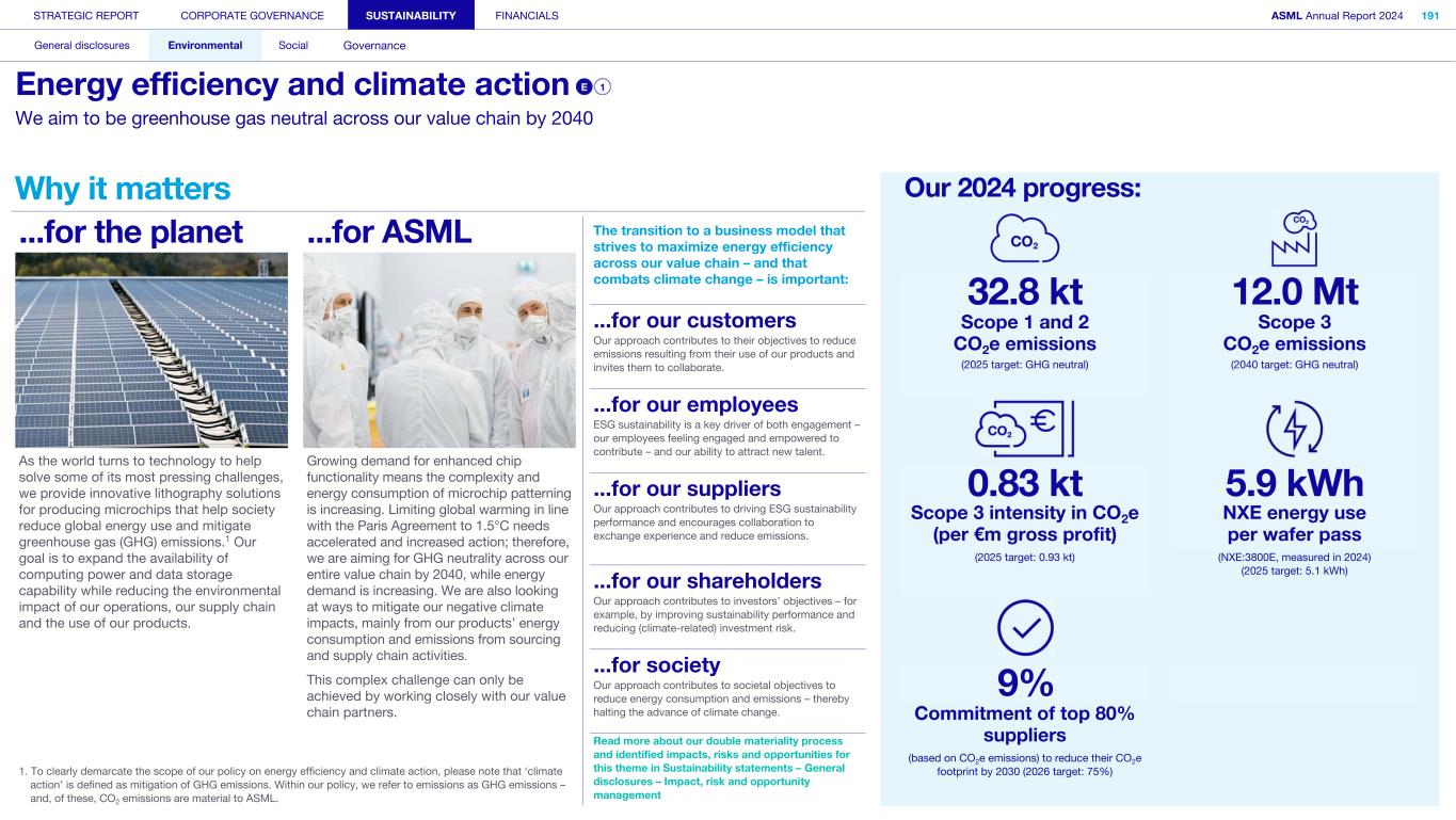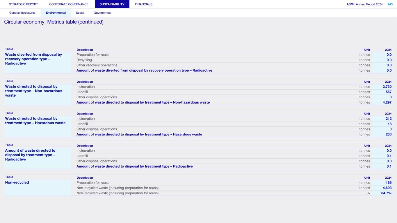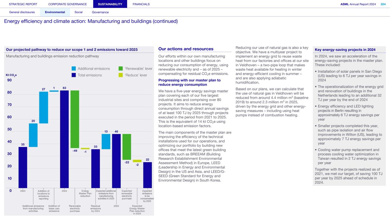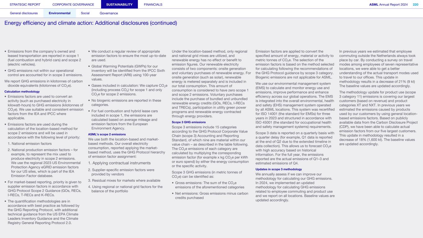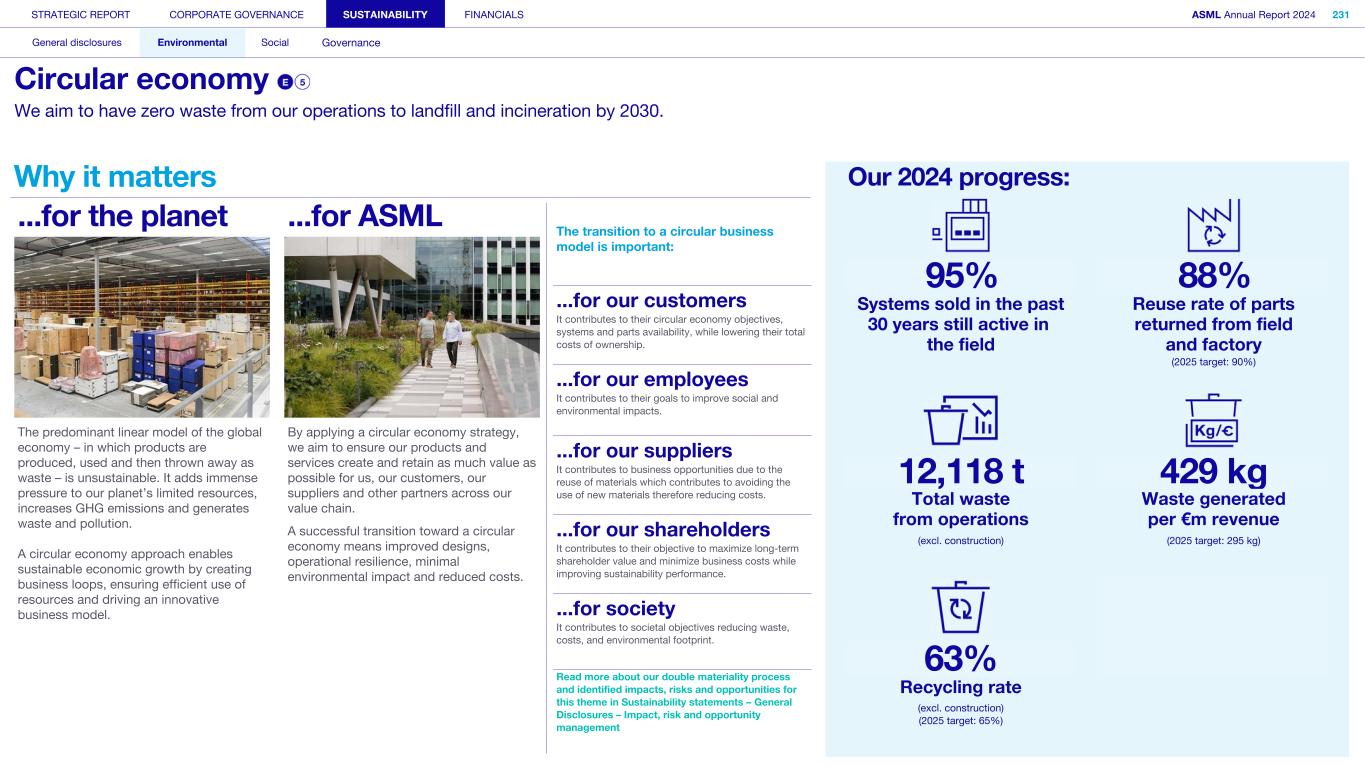 General This Annual Report contains statements relating to our business, expected results, business and industry trends, environmental targets, and other matters that are “forward- looking” within the meaning of the Private Securities Litigation Reform Act of 1995. You can generally identify these statements by the use of words like “may”, “will”, “opportunity”, “potential”, “could”, “should”, “project”, “believe”, “anticipate”, “expect”, “plan”, “estimate”, “forecast”, “model”, “aim”, “seek”, “intend”, “continue”, “commit”, “target”, “future”, “progress”, “goal” and variations of these words or comparable words. They appear in a number of places throughout this Annual Report and include statements with respect to: expected trends, plans, expectations, strategies, priorities, goals, and outlook, expected financial results, including expected results for Q1 and full year 2025, including expectations with respect to revenue, gross margin, estimated annualized effective tax rate, sales by market segment and net service and field option sales and expected drivers thereof, and other full year 2025 expectations and outlook, expectations with respect to expected revenue growth in 2026 and other statements with respect to outlook and expected drivers thereof, statements made at our 2024 Investor Day, including revenue and gross margin opportunity, model and potential for 2025 and 2030 and annual growth in sales 2025-2030 and expectations on growth in semiconductor end markets, statements made in the section entitled “Long-term growth opportunities”, expected capital expenditures, and R&D spending targets and plans, expected business and industry trends and outlook, including expected semiconductor industry size and trends and trends in markets served by our customers, expected growth in the semiconductor industry and ecosystem and expectations of worldwide semiconductor sales by 2030, expected GDP growth, business environment trends, including expected demand, utilization, inventory levels, expected recovery in the semiconductor industry and expected timing thereof, expected growth in global wafer capacity, expectations about the emergence of AI and its expected impact on the semiconductor market and expected trends in AI, electrification and the energy transition, expected growth in semiconductor end markets and market opportunity for 2025 and 2030 and outlook CAGR from 2025 to 2030 and key drivers and global trends expected to fuel semiconductor growth in the longer term, statements made in the section entitled “Macroeconomic and geopolitical trends”, plans to increase global semiconductor capacity and expected growth in semiconductor ecosystem, Moore’s Law and continuation of shrink, including the expectation of lithography remaining one of the key drivers of Moore’s law, expected trends in customer demand, export control policy and regulations and expected impact on us, our plans to increase capacity, and expected or planned production capacity, expectations with respect to systems being operational in customer factories, expectations about the use of our tools by customers including expected timing of high-volume production of systems, such as Twinscan EXE, product roadmaps and customer roadmaps, our expectation that lithography will continue to be at the heart of customer innovation, expected productivity and other attributes and benefits of our tools, our environmental, social, and governance (ESG) and sustainability strategy, plans, commitments and targets, including emissions and waste reduction aims, commitments and targets and our aim for SBTi approval of certain of our targets and our expectations about meeting or being on track to meet these targets and other ESG goals and targets, recycling and refurbishment initiatives, energy-saving and renewable energy use strategies and targets, including plans and targets to achieve greenhouse gas neutrality and emissions reductions targets, our target to achieve zero waste from operations to landfill and incineration and target dates to achieve those targets, assumptions underlying our projections related to ESG targets and reliance on suppliers to meet ESG goals to enable us to meet our ESG goals, plans to purchase renewable energy and carbon credits, potential for semiconductors to reduce greenhouse gas emissions, plans for our systems to use less energy and our energy savings plans, and diversity and other ESG targets and commitments, capital allocation policy and cash return and dividend policy and statements about our share buyback program and our proposed dividend for 2025 and other non-historical statements. These forward-looking statements are not historical facts, but rather are based on current expectations, estimates, assumptions and projections about business and future financial results, and readers should not place undue reliance on them. Forward-looking statements do not guarantee future performance, and actual results may differ materially from projected results as a result of certain risks and uncertainties. These risks and uncertainties include, without limitation, those described under the section entitled “How we manage risk – Risk factors”. These forward-looking statements are made only as of the date of this Annual Report. We do not undertake to update or revise the forward-looking statements, whether as a result of new information, future events or otherwise. Regarding emission reduction targets This Annual Report contains statements relating to our approach to and progress on achieving certain energy efficiency and greenhouse gas emissions reduction targets, including our ambition to achieve greenhouse gas neutrality. References to “greenhouse gas neutral” means remaining emissions, after ASML’s efforts to reach its GHG emission reduction targets, are compensated by the same amount of metric tons of c
