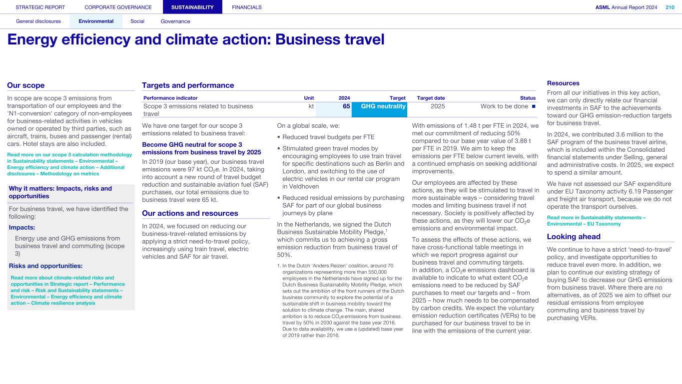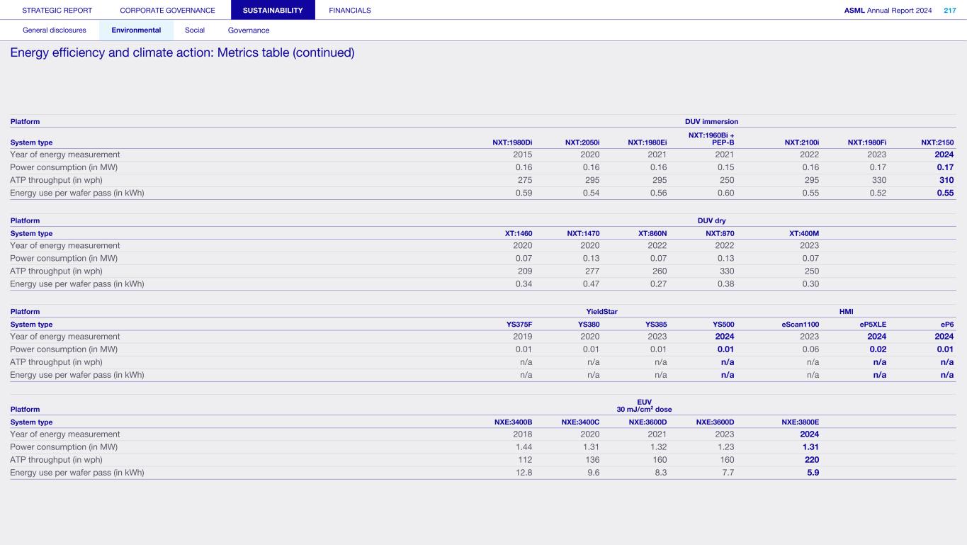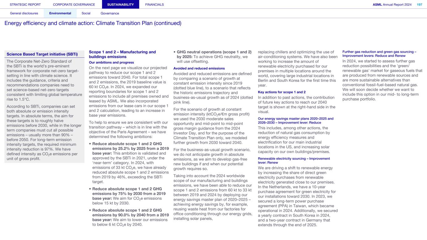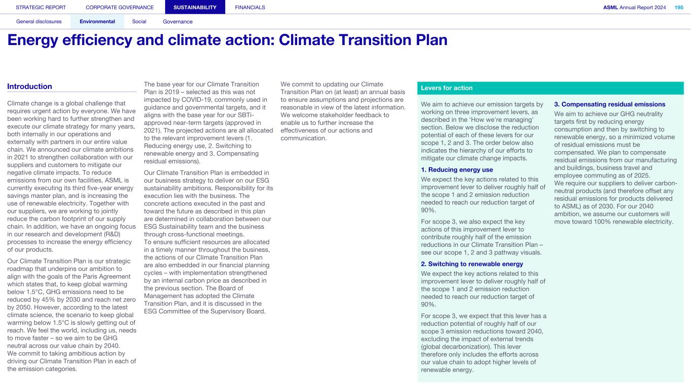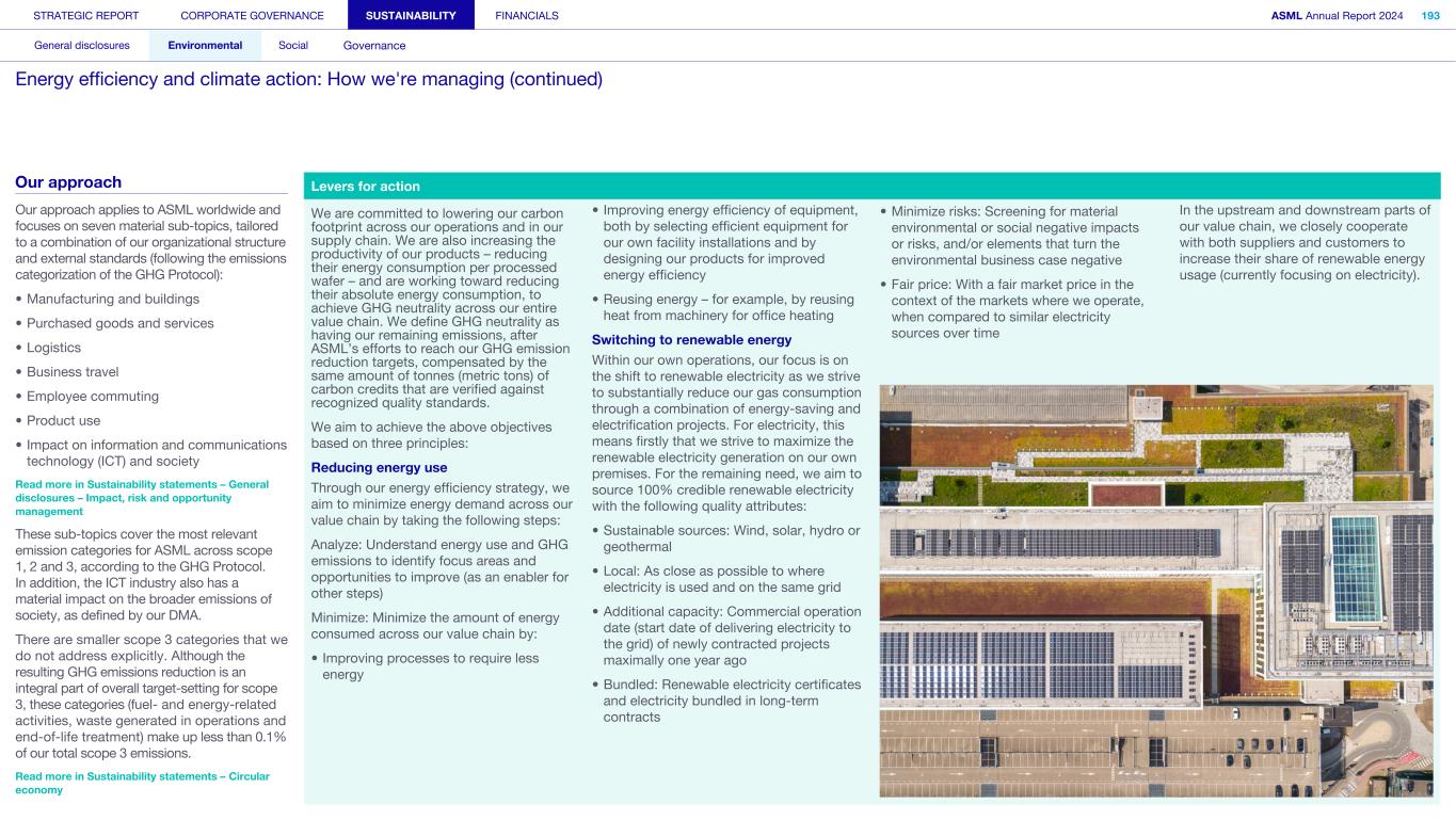 General This Annual Report contains statements relating to our business, expected results, business and industry trends, environmental targets, and other matters that are “forward- looking” within the meaning of the Private Securities Litigation Reform Act of 1995. You can generally identify these statements by the use of words like “may”, “will”, “opportunity”, “potential”, “could”, “should”, “project”, “believe”, “anticipate”, “expect”, “plan”, “estimate”, “forecast”, “model”, “aim”, “seek”, “intend”, “continue”, “commit”, “target”, “future”, “progress”, “goal” and variations of these words or comparable words. They appear in a number of places throughout this Annual Report and include statements with respect to: expected trends, plans, expectations, strategies, priorities, goals, and outlook, expected financial results, including expected results for Q1 and full year 2025, including expectations with respect to revenue, gross margin, estimated annualized effective tax rate, sales by market segment and net service and field option sales and expected drivers thereof, and other full year 2025 expectations and outlook, expectations with respect to expected revenue growth in 2026 and other statements with respect to outlook and expected drivers thereof, statements made at our 2024 Investor Day, including revenue and gross margin opportunity, model and potential for 2025 and 2030 and annual growth in sales 2025-2030 and expectations on growth in semiconductor end markets, statements made in the section entitled “Long-term growth opportunities”, expected capital expenditures, and R&D spending targets and plans, expected business and industry trends and outlook, including expected semiconductor industry size and trends and trends in markets served by our customers, expected growth in the semiconductor industry and ecosystem and expectations of worldwide semiconductor sales by 2030, expected GDP growth, business environment trends, including expected demand, utilization, inventory levels, expected recovery in the semiconductor industry and expected timing thereof, expected growth in global wafer capacity, expectations about the emergence of AI and its expected impact on the semiconductor market and expected trends in AI, electrification and the energy transition, expected growth in semiconductor end markets and market opportunity for 2025 and 2030 and outlook CAGR from 2025 to 2030 and key drivers and global trends expected to fuel semiconductor growth in the longer term, statements made in the section entitled “Macroeconomic and geopolitical trends”, plans to increase global semiconductor capacity and expected growth in semiconductor ecosystem, Moore’s Law and continuation of shrink, including the expectation of lithography remaining one of the key drivers of Moore’s law, expected trends in customer demand, export control policy and regulations and expected impact on us, our plans to increase capacity, and expected or planned production capacity, expectations with respect to systems being operational in customer factories, expectations about the use of our tools by customers including expected timing of high-volume production of systems, such as Twinscan EXE, product roadmaps and customer roadmaps, our expectation that lithography will continue to be at the heart of customer innovation, expected productivity and other attributes and benefits of our tools, our environmental, social, and governance (ESG) and sustainability strategy, plans, commitments and targets, including emissions and waste reduction aims, commitments and targets and our aim for SBTi approval of certain of our targets and our expectations about meeting or being on track to meet these targets and other ESG goals and targets, recycling and refurbishment initiatives, energy-saving and renewable energy use strategies and targets, including plans and targets to achieve greenhouse gas neutrality and emissions reductions targets, our target to achieve zero waste from operations to landfill and incineration and target dates to achieve those targets, assumptions underlying our projections related to ESG targets and reliance on suppliers to meet ESG goals to enable us to meet our ESG goals, plans to purchase renewable energy and carbon credits, potential for semiconductors to reduce greenhouse gas emissions, plans for our systems to use less energy and our energy savings plans, and diversity and other ESG targets and commitments, capital allocation policy and cash return and dividend policy and statements about our share buyback program and our proposed dividend for 2025 and other non-historical statements. These forward-looking statements are not historical facts, but rather are based on current expectations, estimates, assumptions and projections about business and future financial results, and readers should not place undue reliance on them. Forward-looking statements do not guarantee future performance, and actual results may differ materially from projected results as a result of certain risks and uncertainties. These risks and uncertainties include, without limitation, those described under the section entitled “How we manage risk – Risk factors”. These forward-looking statements are made only as of the date of this Annual Report. We do not undertake to update or revise the forward-looking statements, whether as a result of new information, future events or otherwise. Regarding emission reduction targets This Annual Report contains statements relating to our approach to and progress on achieving certain energy efficiency and greenhouse gas emissions reduction targets, including our ambition to achieve greenhouse gas neutrality. References to “greenhouse gas neutral” means remaining emissions, after ASML’s efforts to reach its GHG emission reduction targets, are compensated by the same amount of metric tons of c