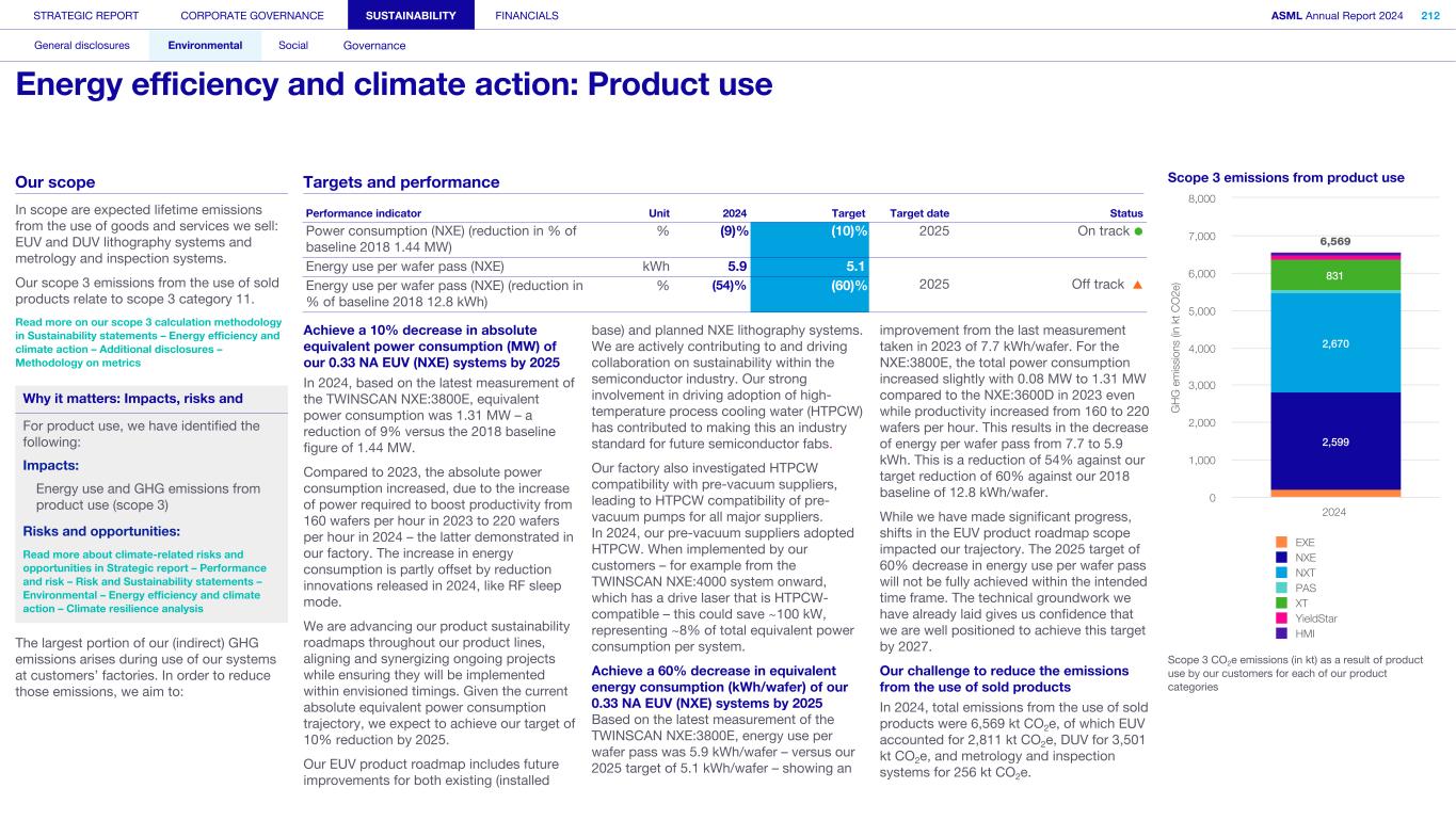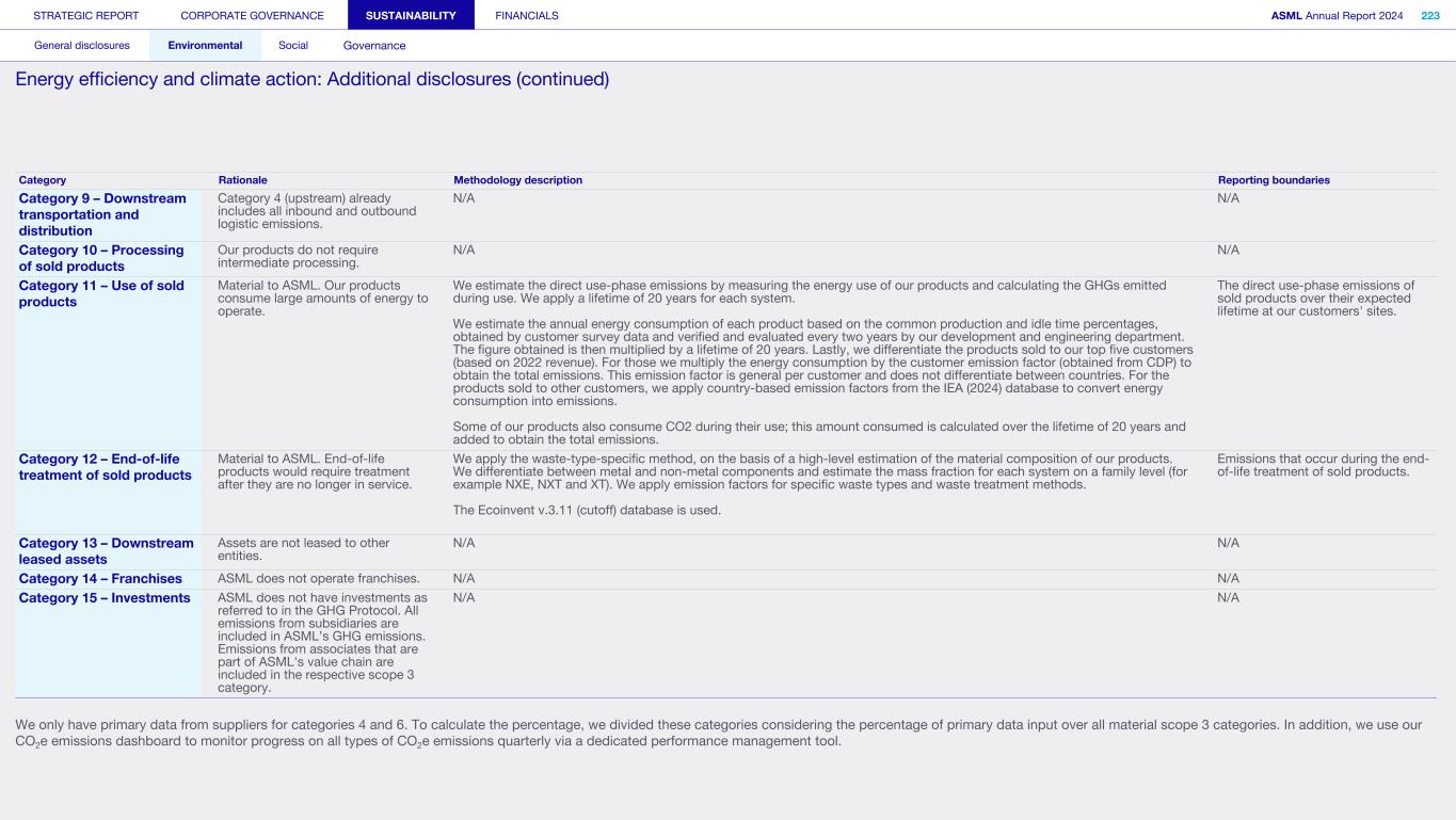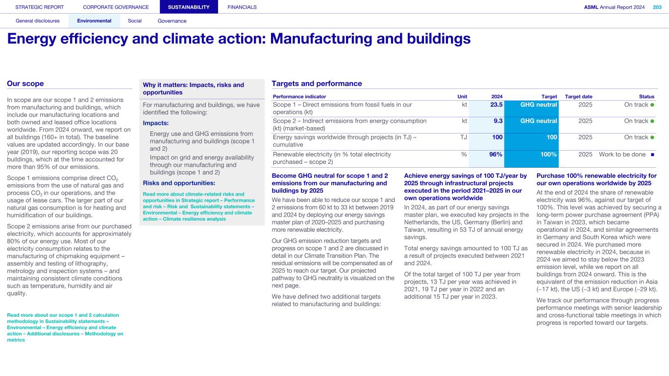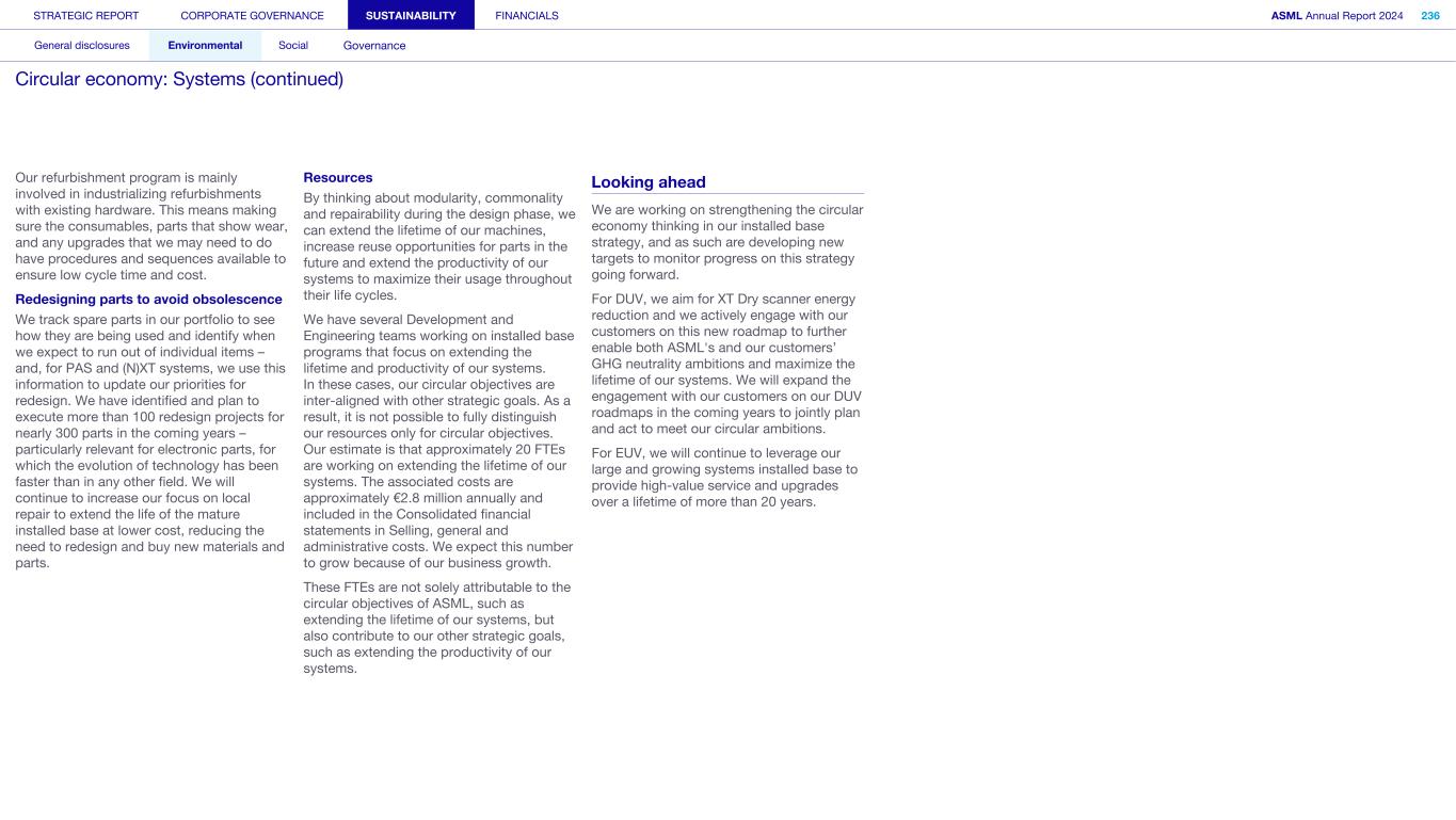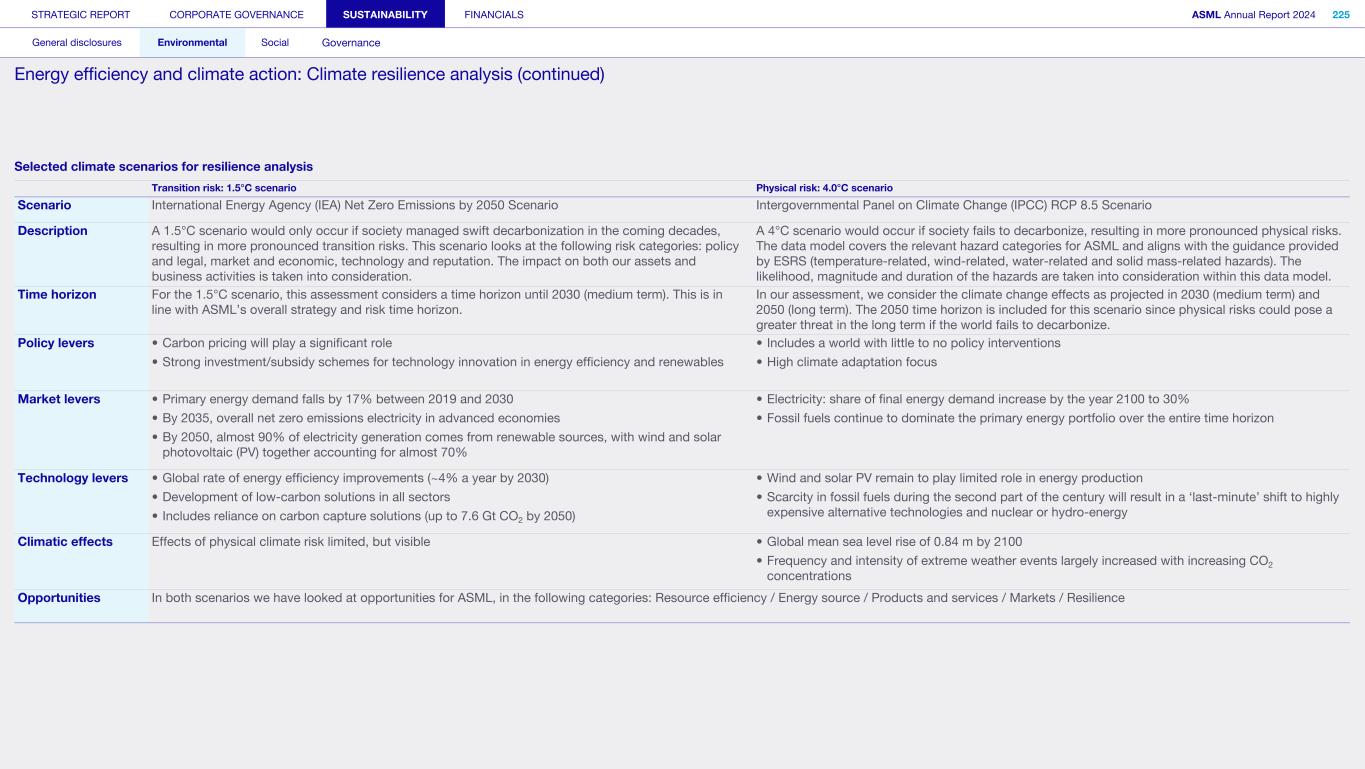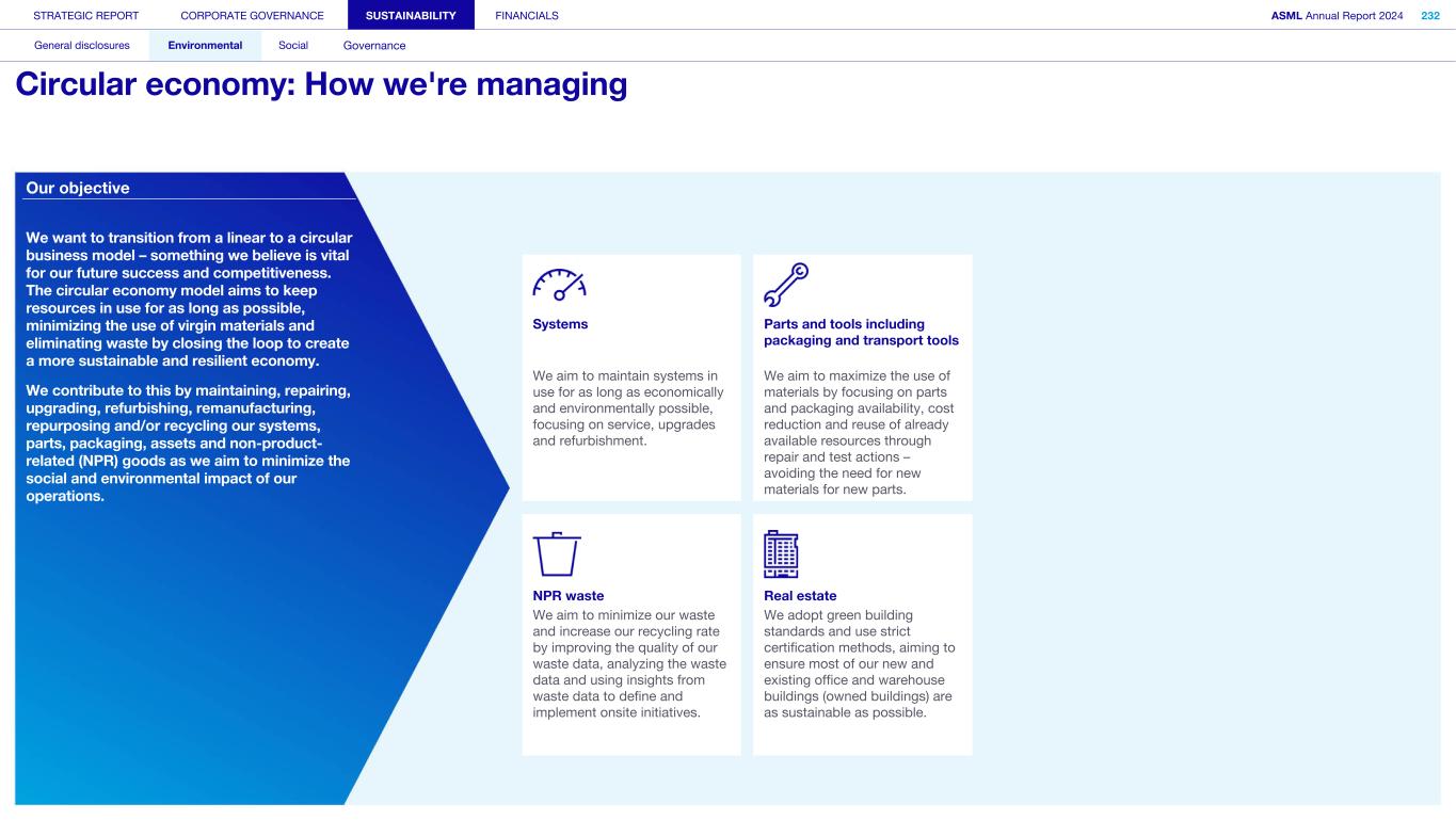 General This Annual Report contains statements relating to our business, expected results, business and industry trends, environmental targets, and other matters that are “forward- looking” within the meaning of the Private Securities Litigation Reform Act of 1995. You can generally identify these statements by the use of words like “may”, “will”, “opportunity”, “potential”, “could”, “should”, “project”, “believe”, “anticipate”, “expect”, “plan”, “estimate”, “forecast”, “model”, “aim”, “seek”, “intend”, “continue”, “commit”, “target”, “future”, “progress”, “goal” and variations of these words or comparable words. They appear in a number of places throughout this Annual Report and include statements with respect to: expected trends, plans, expectations, strategies, priorities, goals, and outlook, expected financial results, including expected results for Q1 and full year 2025, including expectations with respect to revenue, gross margin, estimated annualized effective tax rate, sales by market segment and net service and field option sales and expected drivers thereof, and other full year 2025 expectations and outlook, expectations with respect to expected revenue growth in 2026 and other statements with respect to outlook and expected drivers thereof, statements made at our 2024 Investor Day, including revenue and gross margin opportunity, model and potential for 2025 and 2030 and annual growth in sales 2025-2030 and expectations on growth in semiconductor end markets, statements made in the section entitled “Long-term growth opportunities”, expected capital expenditures, and R&D spending targets and plans, expected business and industry trends and outlook, including expected semiconductor industry size and trends and trends in markets served by our customers, expected growth in the semiconductor industry and ecosystem and expectations of worldwide semiconductor sales by 2030, expected GDP growth, business environment trends, including expected demand, utilization, inventory levels, expected recovery in the semiconductor industry and expected timing thereof, expected growth in global wafer capacity, expectations about the emergence of AI and its expected impact on the semiconductor market and expected trends in AI, electrification and the energy transition, expected growth in semiconductor end markets and market opportunity for 2025 and 2030 and outlook CAGR from 2025 to 2030 and key drivers and global trends expected to fuel semiconductor growth in the longer term, statements made in the section entitled “Macroeconomic and geopolitical trends”, plans to increase global semiconductor capacity and expected growth in semiconductor ecosystem, Moore’s Law and continuation of shrink, including the expectation of lithography remaining one of the key drivers of Moore’s law, expected trends in customer demand, export control policy and regulations and expected impact on us, our plans to increase capacity, and expected or planned production capacity, expectations with respect to systems being operational in customer factories, expectations about the use of our tools by customers including expected timing of high-volume production of systems, such as Twinscan EXE, product roadmaps and customer roadmaps, our expectation that lithography will continue to be at the heart of customer innovation, expected productivity and other attributes and benefits of our tools, our environmental, social, and governance (ESG) and sustainability strategy, plans, commitments and targets, including emissions and waste reduction aims, commitments and targets and our aim for SBTi approval of certain of our targets and our expectations about meeting or being on track to meet these targets and other ESG goals and targets, recycling and refurbishment initiatives, energy-saving and renewable energy use strategies and targets, including plans and targets to achieve greenhouse gas neutrality and emissions reductions targets, our target to achieve zero waste from operations to landfill and incineration and target dates to achieve those targets, assumptions underlying our projections related to ESG targets and reliance on suppliers to meet ESG goals to enable us to meet our ESG goals, plans to purchase renewable energy and carbon credits, potential for semiconductors to reduce greenhouse gas emissions, plans for our systems to use less energy and our energy savings plans, and diversity and other ESG targets and commitments, capital allocation policy and cash return and dividend policy and statements about our share buyback program and our proposed dividend for 2025 and other non-historical statements. These forward-looking statements are not historical facts, but rather are based on current expectations, estimates, assumptions and projections about business and future financial results, and readers should not place undue reliance on them. Forward-looking statements do not guarantee future performance, and actual results may differ materially from projected results as a result of certain risks and uncertainties. These risks and uncertainties include, without limitation, those described under the section entitled “How we manage risk – Risk factors”. These forward-looking statements are made only as of the date of this Annual Report. We do not undertake to update or revise the forward-looking statements, whether as a result of new information, future events or otherwise. Regarding emission reduction targets This Annual Report contains statements relating to our approach to and progress on achieving certain energy efficiency and greenhouse gas emissions reduction targets, including our ambition to achieve greenhouse gas neutrality. References to “greenhouse gas neutral” means remaining emissions, after ASML’s efforts to reach its GHG emission reduction targets, are compensated by the same amount of metric tons of c