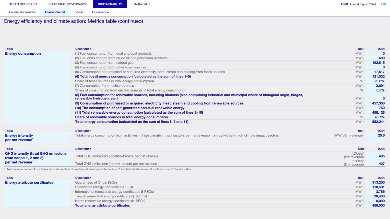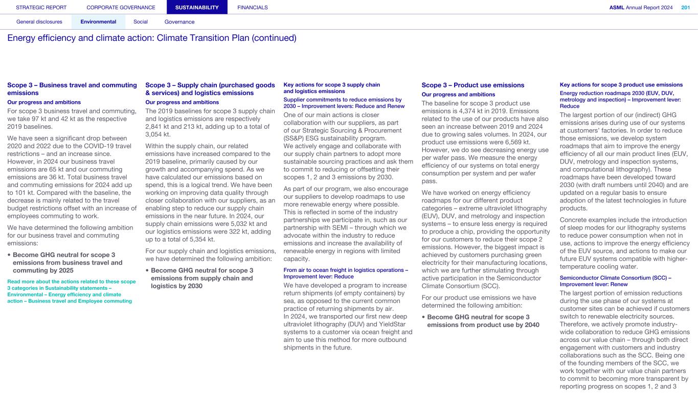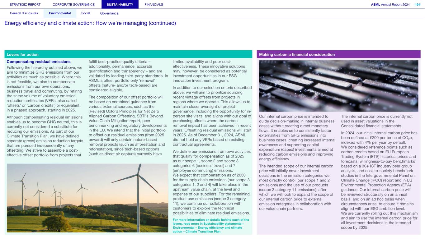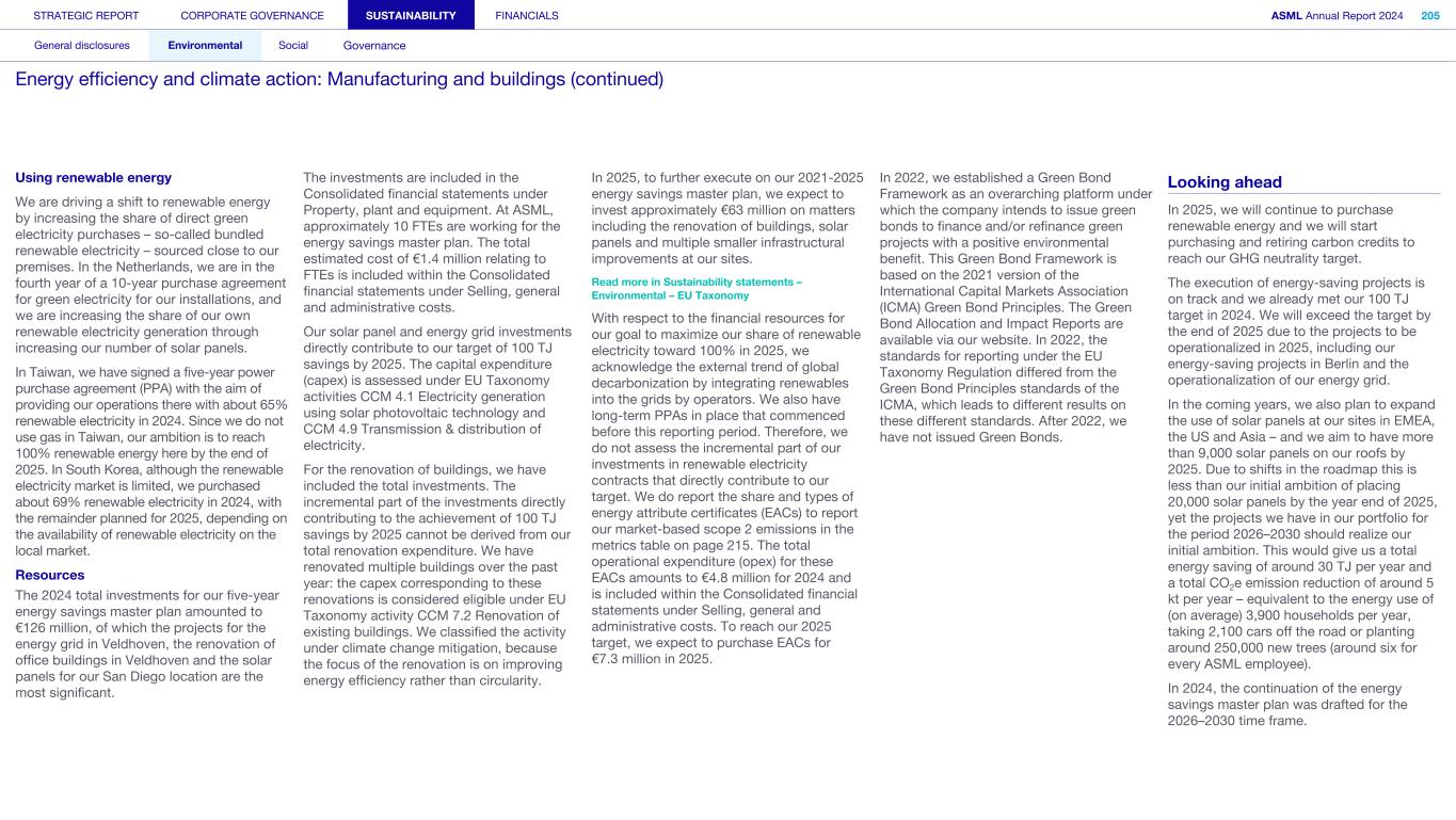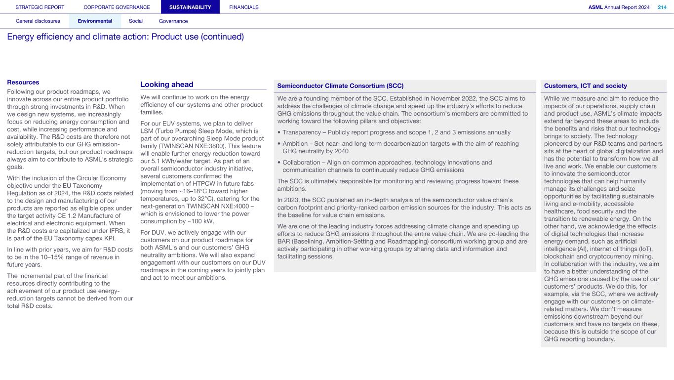 General This Annual Report contains statements relating to our business, expected results, business and industry trends, environmental targets, and other matters that are “forward- looking” within the meaning of the Private Securities Litigation Reform Act of 1995. You can generally identify these statements by the use of words like “may”, “will”, “opportunity”, “potential”, “could”, “should”, “project”, “believe”, “anticipate”, “expect”, “plan”, “estimate”, “forecast”, “model”, “aim”, “seek”, “intend”, “continue”, “commit”, “target”, “future”, “progress”, “goal” and variations of these words or comparable words. They appear in a number of places throughout this Annual Report and include statements with respect to: expected trends, plans, expectations, strategies, priorities, goals, and outlook, expected financial results, including expected results for Q1 and full year 2025, including expectations with respect to revenue, gross margin, estimated annualized effective tax rate, sales by market segment and net service and field option sales and expected drivers thereof, and other full year 2025 expectations and outlook, expectations with respect to expected revenue growth in 2026 and other statements with respect to outlook and expected drivers thereof, statements made at our 2024 Investor Day, including revenue and gross margin opportunity, model and potential for 2025 and 2030 and annual growth in sales 2025-2030 and expectations on growth in semiconductor end markets, statements made in the section entitled “Long-term growth opportunities”, expected capital expenditures, and R&D spending targets and plans, expected business and industry trends and outlook, including expected semiconductor industry size and trends and trends in markets served by our customers, expected growth in the semiconductor industry and ecosystem and expectations of worldwide semiconductor sales by 2030, expected GDP growth, business environment trends, including expected demand, utilization, inventory levels, expected recovery in the semiconductor industry and expected timing thereof, expected growth in global wafer capacity, expectations about the emergence of AI and its expected impact on the semiconductor market and expected trends in AI, electrification and the energy transition, expected growth in semiconductor end markets and market opportunity for 2025 and 2030 and outlook CAGR from 2025 to 2030 and key drivers and global trends expected to fuel semiconductor growth in the longer term, statements made in the section entitled “Macroeconomic and geopolitical trends”, plans to increase global semiconductor capacity and expected growth in semiconductor ecosystem, Moore’s Law and continuation of shrink, including the expectation of lithography remaining one of the key drivers of Moore’s law, expected trends in customer demand, export control policy and regulations and expected impact on us, our plans to increase capacity, and expected or planned production capacity, expectations with respect to systems being operational in customer factories, expectations about the use of our tools by customers including expected timing of high-volume production of systems, such as Twinscan EXE, product roadmaps and customer roadmaps, our expectation that lithography will continue to be at the heart of customer innovation, expected productivity and other attributes and benefits of our tools, our environmental, social, and governance (ESG) and sustainability strategy, plans, commitments and targets, including emissions and waste reduction aims, commitments and targets and our aim for SBTi approval of certain of our targets and our expectations about meeting or being on track to meet these targets and other ESG goals and targets, recycling and refurbishment initiatives, energy-saving and renewable energy use strategies and targets, including plans and targets to achieve greenhouse gas neutrality and emissions reductions targets, our target to achieve zero waste from operations to landfill and incineration and target dates to achieve those targets, assumptions underlying our projections related to ESG targets and reliance on suppliers to meet ESG goals to enable us to meet our ESG goals, plans to purchase renewable energy and carbon credits, potential for semiconductors to reduce greenhouse gas emissions, plans for our systems to use less energy and our energy savings plans, and diversity and other ESG targets and commitments, capital allocation policy and cash return and dividend policy and statements about our share buyback program and our proposed dividend for 2025 and other non-historical statements. These forward-looking statements are not historical facts, but rather are based on current expectations, estimates, assumptions and projections about business and future financial results, and readers should not place undue reliance on them. Forward-looking statements do not guarantee future performance, and actual results may differ materially from projected results as a result of certain risks and uncertainties. These risks and uncertainties include, without limitation, those described under the section entitled “How we manage risk – Risk factors”. These forward-looking statements are made only as of the date of this Annual Report. We do not undertake to update or revise the forward-looking statements, whether as a result of new information, future events or otherwise. Regarding emission reduction targets This Annual Report contains statements relating to our approach to and progress on achieving certain energy efficiency and greenhouse gas emissions reduction targets, including our ambition to achieve greenhouse gas neutrality. References to “greenhouse gas neutral” means remaining emissions, after ASML’s efforts to reach its GHG emission reduction targets, are compensated by the same amount of metric tons of c