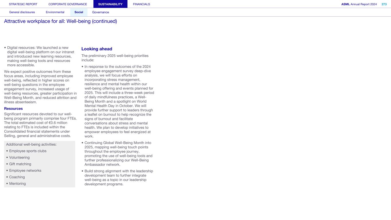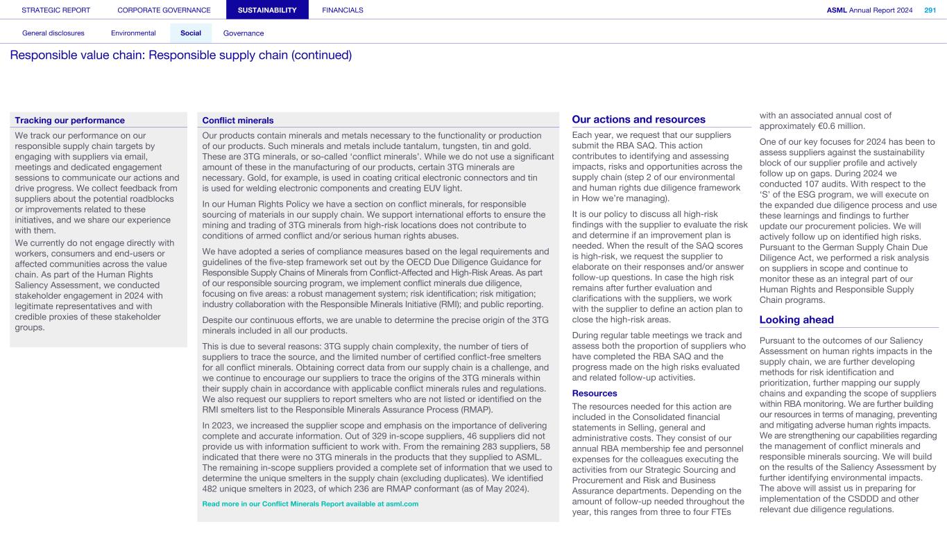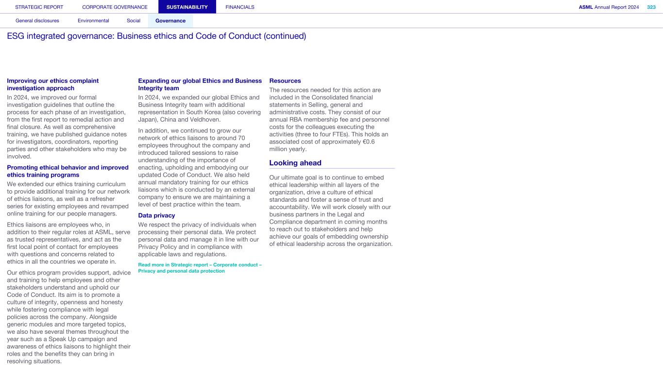 Improving our ethics complaint investigation approach In 2024, we improved our formal investigation guidelines that outline the process for each phase of an investigation, from the first report to remedial action and final closure. As well as comprehensive training, we have published guidance notes for investigators, coordinators, reporting parties and other stakeholders who may be involved. Promoting ethical behavior and improved ethics training programs We extended our ethics training curriculum to provide additional training for our network of ethics liaisons, as well as a refresher series for existing employees and revamped online training for our people managers. Ethics liaisons are employees who, in addition to their regular roles at ASML, serve as trusted representatives, and act as the first local point of contact for employees with questions and concerns related to ethics in all the countries we operate in. Our ethics program provides support, advice and training to help employees and other stakeholders understand and uphold our Code of Conduct. Its aim is to promote a culture of integrity, openness and honesty while fostering compliance with legal policies across the company. Alongside generic modules and more targeted topics, we also have several themes throughout the year such as a Speak Up campaign and awareness of ethics liaisons to highlight their roles and the benefits they can bring in resolving situations. Expanding our global Ethics and Business Integrity team In 2024, we expanded our global Ethics and Business Integrity team with additional representation in South Korea (also covering Japan), China and Veldhoven. In addition, we continued to grow our network of ethics liaisons to around 70 employees throughout the company and introduced tailored sessions to raise understanding of the importance of enacting, upholding and embodying our updated Code of Conduct. We also held annual mandatory training for our ethics liaisons which is conducted by an external company to ensure we are maintaining a level of best practice within the team. Data privacy We respect the privacy of individuals when processing their personal data. We protect personal data and manage it in line with our Privacy Policy and in compliance with applicable laws and regulations. Read more in Strategic report – Corporate conduct – Privacy and personal data protection Resources The resources needed for this action are included in the Consolidated financial statements in Selling, general and administrative costs. They consist of our annual RBA membership fee and personnel costs for the colleagues executing the activities (three to four FTEs). This holds an associated cost of approximately €0.6 million yearly. Looking ahead Our ultimate goal is to continue to embed ethical leadership within all layers of the organization, drive a culture of ethical standards and foster a sense of trust and accountability. We will work closely with our business partners in the Legal and Compliance department in coming months to reach out to stakeholders and help achieve our goals of embedding ownership of ethical leadership across the organization. STRATEGIC REPORT CORPORATE GOVERNANCE SUSTAINABILITY FINANCIALS ASML Annual Report 2024 323 General disclosures Environmental Social Governance ESG integrated governance: Business ethics and Code of Conduct (continued)