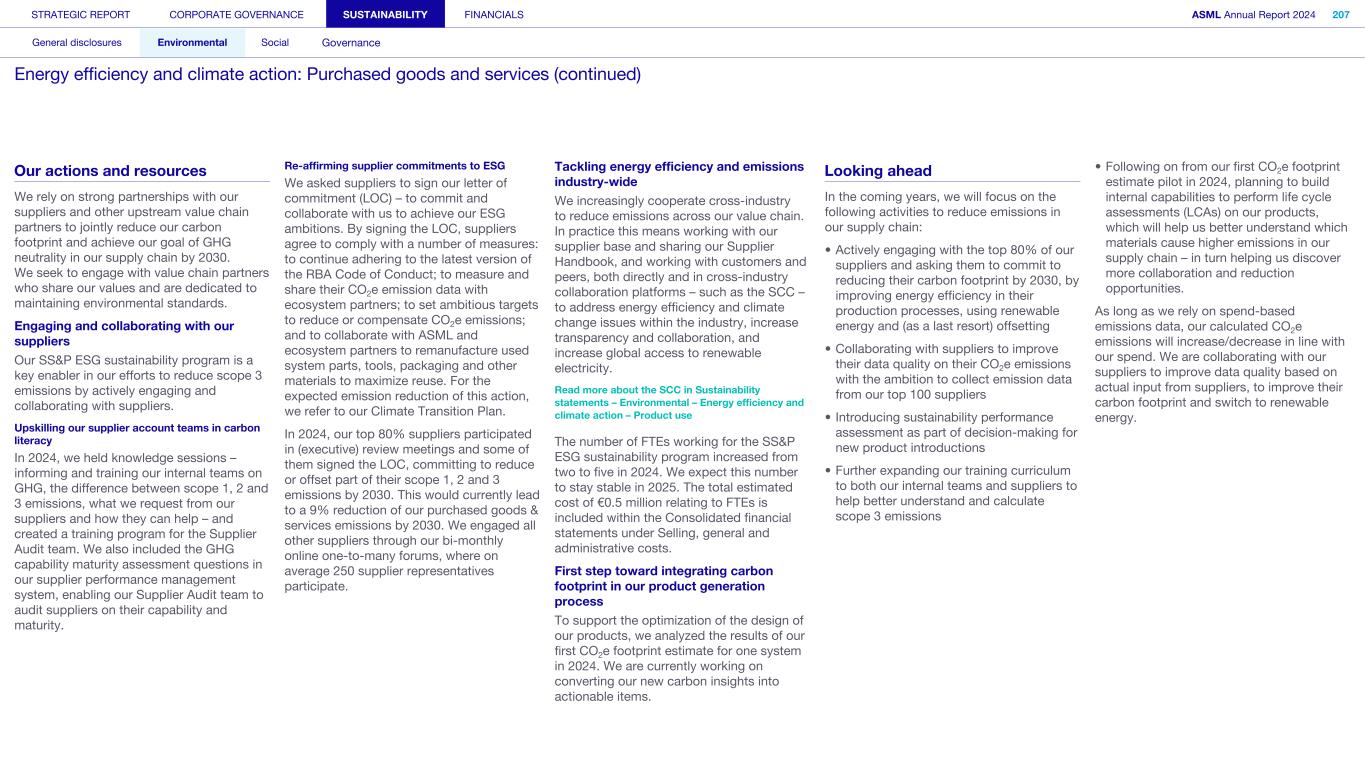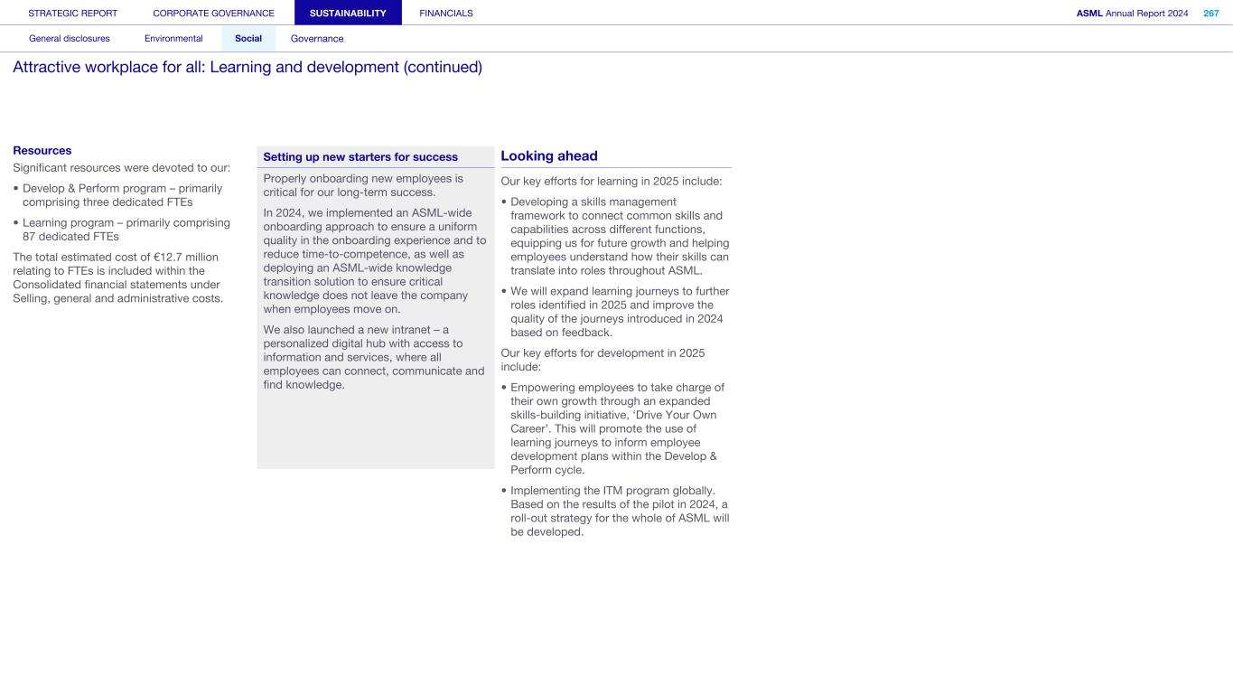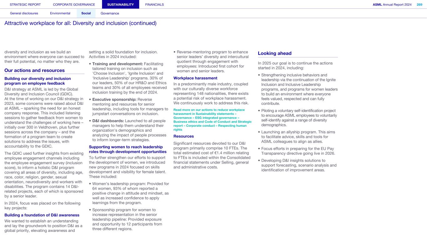 Improving our ethics complaint investigation approach In 2024, we improved our formal investigation guidelines that outline the process for each phase of an investigation, from the first report to remedial action and final closure. As well as comprehensive training, we have published guidance notes for investigators, coordinators, reporting parties and other stakeholders who may be involved. Promoting ethical behavior and improved ethics training programs We extended our ethics training curriculum to provide additional training for our network of ethics liaisons, as well as a refresher series for existing employees and revamped online training for our people managers. Ethics liaisons are employees who, in addition to their regular roles at ASML, serve as trusted representatives, and act as the first local point of contact for employees with questions and concerns related to ethics in all the countries we operate in. Our ethics program provides support, advice and training to help employees and other stakeholders understand and uphold our Code of Conduct. Its aim is to promote a culture of integrity, openness and honesty while fostering compliance with legal policies across the company. Alongside generic modules and more targeted topics, we also have several themes throughout the year such as a Speak Up campaign and awareness of ethics liaisons to highlight their roles and the benefits they can bring in resolving situations. Expanding our global Ethics and Business Integrity team In 2024, we expanded our global Ethics and Business Integrity team with additional representation in South Korea (also covering Japan), China and Veldhoven. In addition, we continued to grow our network of ethics liaisons to around 70 employees throughout the company and introduced tailored sessions to raise understanding of the importance of enacting, upholding and embodying our updated Code of Conduct. We also held annual mandatory training for our ethics liaisons which is conducted by an external company to ensure we are maintaining a level of best practice within the team. Data privacy We respect the privacy of individuals when processing their personal data. We protect personal data and manage it in line with our Privacy Policy and in compliance with applicable laws and regulations. Read more in Strategic report – Corporate conduct – Privacy and personal data protection Resources The resources needed for this action are included in the Consolidated financial statements in Selling, general and administrative costs. They consist of our annual RBA membership fee and personnel costs for the colleagues executing the activities (three to four FTEs). This holds an associated cost of approximately €0.6 million yearly. Looking ahead Our ultimate goal is to continue to embed ethical leadership within all layers of the organization, drive a culture of ethical standards and foster a sense of trust and accountability. We will work closely with our business partners in the Legal and Compliance department in coming months to reach out to stakeholders and help achieve our goals of embedding ownership of ethical leadership across the organization. STRATEGIC REPORT CORPORATE GOVERNANCE SUSTAINABILITY FINANCIALS ASML Annual Report 2024 323 General disclosures Environmental Social Governance ESG integrated governance: Business ethics and Code of Conduct (continued)