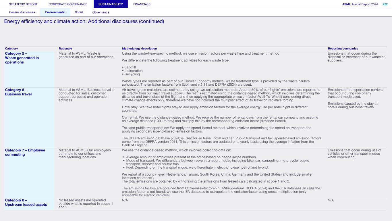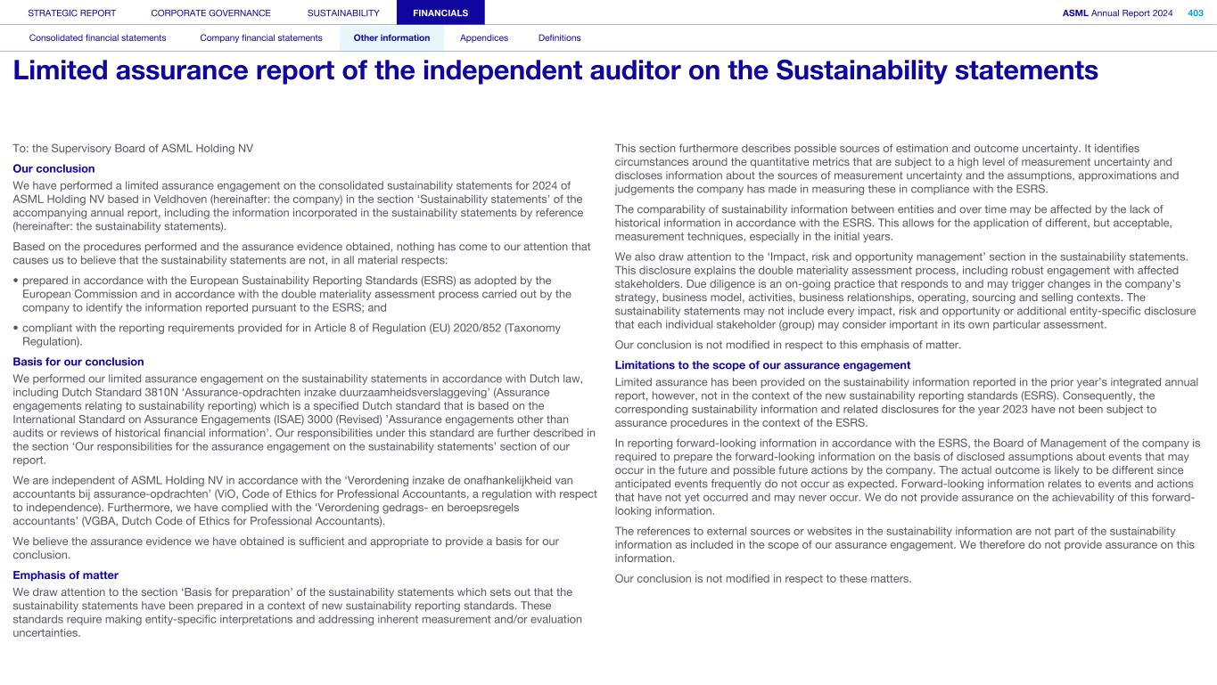 To: the Supervisory Board of ASML Holding NV Our conclusion We have performed a limited assurance engagement on the consolidated sustainability statements for 2024 of ASML Holding NV based in Veldhoven (hereinafter: the company) in the section ‘Sustainability statements’ of the accompanying annual report, including the information incorporated in the sustainability statements by reference (hereinafter: the sustainability statements). Based on the procedures performed and the assurance evidence obtained, nothing has come to our attention that causes us to believe that the sustainability statements are not, in all material respects: • prepared in accordance with the European Sustainability Reporting Standards (ESRS) as adopted by the European Commission and in accordance with the double materiality assessment process carried out by the company to identify the information reported pursuant to the ESRS; and • compliant with the reporting requirements provided for in Article 8 of Regulation (EU) 2020/852 (Taxonomy Regulation). Basis for our conclusion We performed our limited assurance engagement on the sustainability statements in accordance with Dutch law, including Dutch Standard 3810N ‘Assurance-opdrachten inzake duurzaamheidsverslaggeving’ (Assurance engagements relating to sustainability reporting) which is a specified Dutch standard that is based on the International Standard on Assurance Engagements (ISAE) 3000 (Revised) ’Assurance engagements other than audits or reviews of historical financial information’. Our responsibilities under this standard are further described in the section ‘Our responsibilities for the assurance engagement on the sustainability statements’ section of our report. We are independent of ASML Holding NV in accordance with the ‘Verordening inzake de onafhankelijkheid van accountants bij assurance-opdrachten’ (ViO, Code of Ethics for Professional Accountants, a regulation with respect to independence). Furthermore, we have complied with the ‘Verordening gedrags- en beroepsregels accountants’ (VGBA, Dutch Code of Ethics for Professional Accountants). We believe the assurance evidence we have obtained is sufficient and appropriate to provide a basis for our conclusion. Emphasis of matter We draw attention to the section ‘Basis for preparation’ of the sustainability statements which sets out that the sustainability statements have been prepared in a context of new sustainability reporting standards. These standards require making entity-specific interpretations and addressing inherent measurement and/or evaluation uncertainties. This section furthermore describes possible sources of estimation and outcome uncertainty. It identifies circumstances around the quantitative metrics that are subject to a high level of measurement uncertainty and discloses information about the sources of measurement uncertainty and the assumptions, approximations and judgements the company has made in measuring these in compliance with the ESRS. The comparability of sustainability information between entities and over time may be affected by the lack of historical information in accordance with the ESRS. This allows for the application of different, but acceptable, measurement techniques, especially in the initial years. We also draw attention to the ‘Impact, risk and opportunity management’ section in the sustainability statements. This disclosure explains the double materiality assessment process, including robust engagement with affected stakeholders. Due diligence is an on-going practice that responds to and may trigger changes in the company’s strategy, business model, activities, business relationships, operating, sourcing and selling contexts. The sustainability statements may not include every impact, risk and opportunity or additional entity-specific disclosure that each individual stakeholder (group) may consider important in its own particular assessment. Our conclusion is not modified in respect to this emphasis of matter. Limitations to the scope of our assurance engagement Limited assurance has been provided on the sustainability information reported in the prior year’s integrated annual report, however, not in the context of the new sustainability reporting standards (ESRS). Consequently, the corresponding sustainability information and related disclosures for the year 2023 have not been subject to assurance procedures in the context of the ESRS. In reporting forward-looking information in accordance with the ESRS, the Board of Management of the company is required to prepare the forward-looking information on the basis of disclosed assumptions about events that may occur in the future and possible future actions by the company. The actual outcome is likely to be different since anticipated events frequently do not occur as expected. Forward-looking information relates to events and actions that have not yet occurred and may never occur. We do not provide assurance on the achievability of this forward- looking information. The references to external sources or websites in the sustainability information are not part of the sustainability information as included in the scope of our assurance engagement. We therefore do not provide assurance on this information. Our conclusion is not modified in respect to these matters. STRATEGIC REPORT CORPORATE GOVERNANCE SUSTAINABILITY FINANCIALS ASML Annual Report 2024 403 Consolidated financial statements Company financial statements Other information Appendices Definitions Limited assurance report of the independent auditor on the Sustainability statements