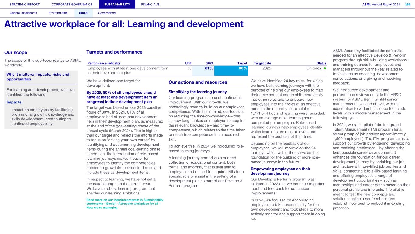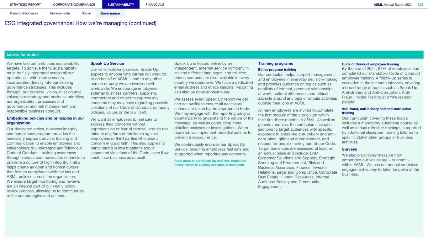 Levers for action We have laid out ambitious sustainability targets. To achieve them, sustainability must be fully integrated across all our operations – with improvements incorporated directly into our existing governance strategies. This includes through: our purpose, vision, mission and values; our strategy and business priorities; our organization, processes and governance; and risk management and responsible business conduct. Embedding policies and principles in our organization Our dedicated ethics, business integrity and compliance program provides the necessary support, advice, training and communication to enable employees and stakeholders to understand and follow our Code of Conduct – building awareness through various communication channels to promote a culture of high integrity. It also helps create an open and honest culture that fosters compliance with the law and ASML policies across the organization. We ensure target monitoring and reviews are an integral part of our yearly policy review process, allowing us to continuously refine our strategies and actions. Speak Up Service Our whistleblowing service, Speak Up, applies to anyone who carries out work for, or on behalf of ASML – and to any other person or party we are involved with worldwide. We encourage employees, external business partners, suppliers, contractors and others to express any concerns they may have regarding possible violations of our Code of Conduct, company policies, values or the law itself. We want all employees to feel safe to express their concerns without apprehension or fear of reprisal, and do not tolerate any form of retaliation against employees or third parties who raise a concern in good faith. This also applies to participating in investigations about suspected violations of the Code, even if we could lose business as a result. Speak Up is hosted online by an independent, external service company in several different languages, and toll-free phone numbers are also available in every country we operate in. We have a dedicated email address and ethics liaisons. Reporting can also be done anonymously. We assess every Speak Up report we get and act swiftly to ensure all necessary actions are taken by the appropriate body. We may engage with the reporting party or counterparty to understand the nature of the message, as well as conducting more detailed analyses or investigations. When required, we implement remedial actions to prevent a reoccurrence. We continuously improve our Speak Up Service, ensuring employees feel safe and supported when reporting any concerns. Read more in our Speak Up and Non-retaliation Policy, which is publicly available at asml.com Training programs Ethics program training Our curriculum helps support management and employees in everyday decision-making and provides guidance on topics such as conflicts of interest, personal relationships at work, cultural differences and ethical aspects around any paid or unpaid activities outside their jobs at ASML. All new employees are invited to complete the first module of the curriculum within their first three months at ASML. As well as generic modules, the curriculum includes sections to target audiences with specific exposure to areas like anti-bribery and anti- corruption, gifts and entertainment, and respect for people – a key part of our Code. Target audiences are assessed at least on an annual basis and include: BoM, Customer Solutions and Support, Strategic Sourcing and Procurement, Risk and Business Assurance, Finance, Investor Relations, Legal and Compliance, Corporate Real Estate, Human Resources, Internal Audit and Society and Community Engagement. Code of Conduct employee training By the end of 2024, 97% of employees had completed our mandatory Code of Conduct employee training. A follow-up series is cascaded in three-month intervals, covering a broad range of topics such as Speak Up, Anti-Bribery and Anti-Corruption, Anti- Fraud, Insider Trading and ‘We respect people’. Anti-fraud, anti-bribery and anti-corruption training Our curriculum covering these topics includes a mandatory e-learning course as well as annual refresher trainings, supported by additional classroom training tailored to specific stakeholder groups or business activities. Surveys We also proactively measure how embedded our values are – or aren’t – within ASML. We use our annual employee engagement survey to take the pulse of the business. STRATEGIC REPORT CORPORATE GOVERNANCE SUSTAINABILITY FINANCIALS ASML Annual Report 2024 321 General disclosures Environmental Social Governance ESG integrated governance: How we’re managing (continued)