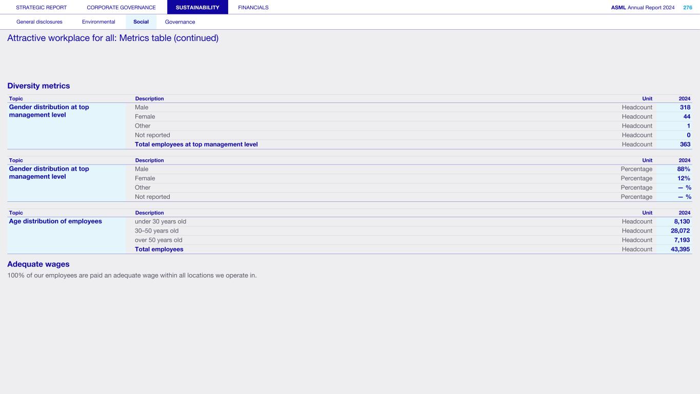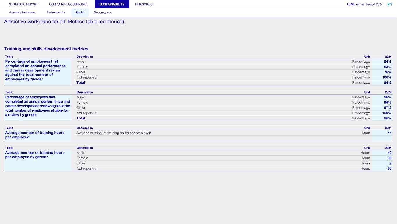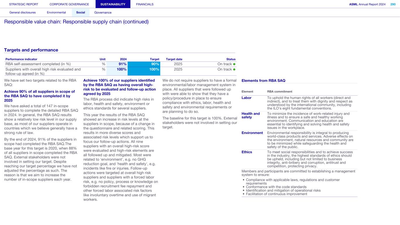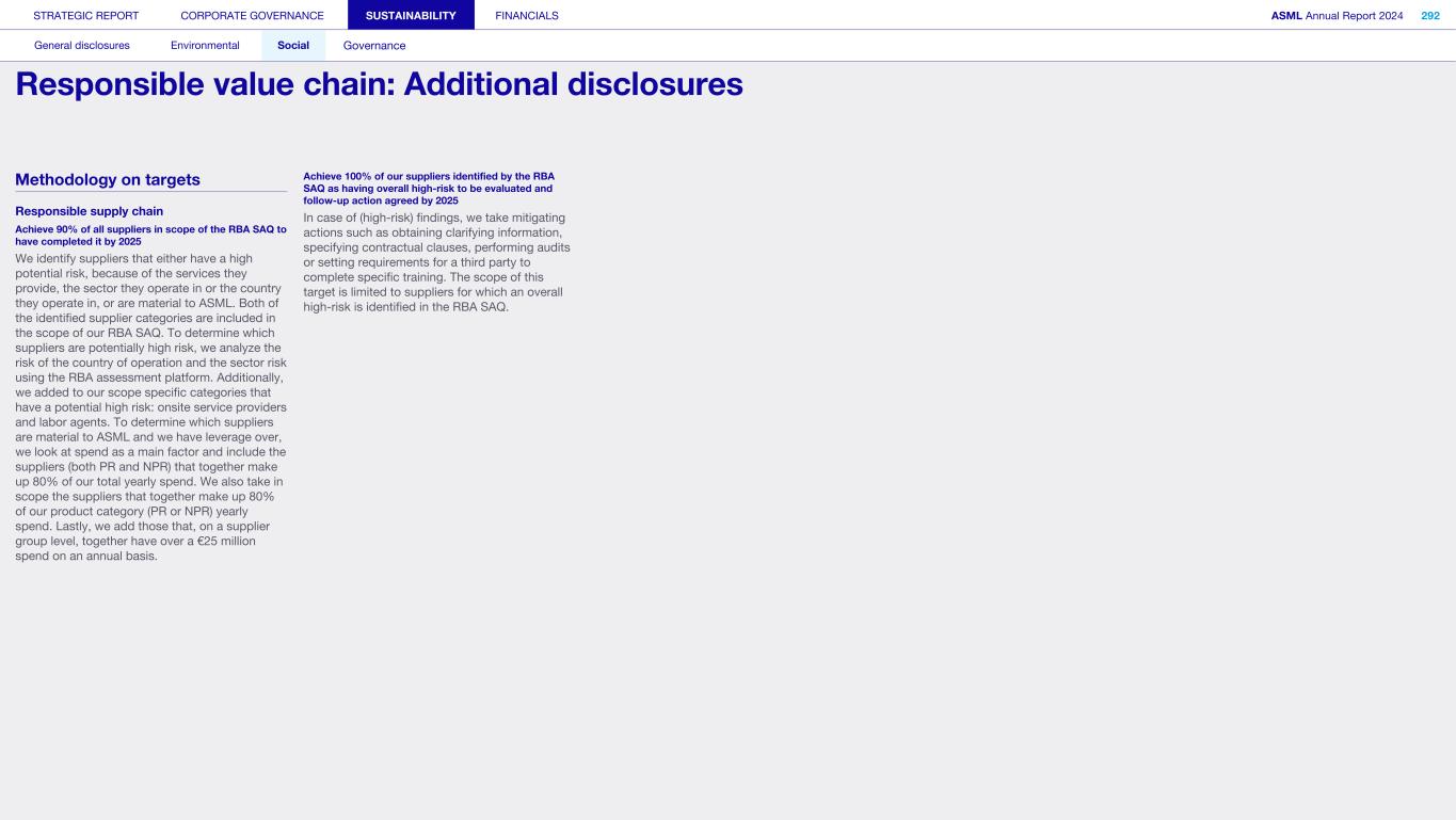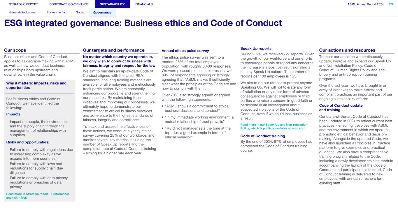 Our scope Business ethics and Code of Conduct applies to all decision-making within ASML, as well as how we conduct business relationships both upstream and downstream in the value chain. Why it matters: Impacts, risks and opportunities For Business ethics and Code of Conduct, we have identified the following: Impacts: Impact on people, the environment and the supply chain through the management of relationships with suppliers Risks and opportunities: Failure to comply with regulations due to increasing complexity as we expand into more countries F a i Failure to comply with laws and regulations for supply chain due diligence Failure to comply with data privacy regulations or breaches of data privacy Read more in Strategic report – Performance and risk – Risk Our targets and performance No matter which country we operate in, we only wish to conduct business with fairness, integrity and respect for the law We aim to maintain an up-to-date Code of Conduct aligned with the latest RBA standards, ensuring training materials are available for all employees and meticulously track participation. We are constantly enhancing our programs and strengthening our measures. By maintaining these initiatives and improving our processes, we ultimately hope to demonstrate our commitment to ethical business practices and adherence to the highest standards of fairness, integrity and compliance. To track and assess the effectiveness of these actions, we conduct a yearly ethics survey covering 25% of our workforce, and monitor several key metrics including the number of Speak Up reports and the completion rate of Code of Conduct training – aiming for a higher rate each year. Annual ethics pulse survey The ethics pulse survey was sent to a random 25% of the total employee population, with roughly 3,400 responses. We were pleased to see stable results, with 89% of respondents agreeing or strongly agreeing that “ASML makes it sufficiently clear what the principles of the Code are and how to comply with them”. Over 70% also strongly agreed or agreed with the following statements: • “ASML shows a commitment to ethical business decisions and conduct” • “In my immediate working environment, a mutual relationship of trust prevails” • “My direct manager sets the tone at the top – i.e. a good example in terms of ethical behavior” Speak Up reports During 2024, we received 727 reports. Given the growth of our workforce and our efforts to encourage people to report any concerns, the increase is a positive result signaling a healthy Speak Up culture. The number of reports per 100 employees is 1.7. We aim to do our utmost to protect anyone Speaking Up. We will not tolerate any form of retaliation or any other form of adverse consequences against employees or third parties who raise a concern in good faith or participate in an investigation about suspected violations of the Code of Conduct, even if we could lose business as a result. Read more in our Speak Up and Non-retaliation Policy, which is publicly available at asml.com Code of Conduct training By the end of 2024, 97% of employees had completed the Code of Conduct training course. Our actions and resources To meet our ambition we continuously update, improve and expand our Speak Up and Non-retaliation Policy, Code of Conduct, Human Rights Policy and anti- bribery and anti-corruption training programs. Over the last year, we have brought in an array of initiatives to make ethical and compliant practices an important part of our ongoing sustainability efforts: Code of Conduct update and training Our state-of-the-art Code of Conduct has been updated in 2024 to reflect current best practices – ensuring it evolves with ASML and the environment in which we operate, promoting ethical behavior and decision- making. Alongside the updated Code, we have also launched a Principles in Practice platform to give examples and practical guidance. We also have a comprehensive training program related to the Code, including a newly developed training module accompanying the launch of the Code of Conduct, and participation is tracked. Code of Conduct training is delivered to new employees, with annual refreshers for existing staff. STRATEGIC REPORT CORPORATE GOVERNANCE SUSTAINABILITY FINANCIALS ASML Annual Report 2024 322 General disclosures Environmental Social Governance ESG integrated governance: Business ethics and Code of Conduct