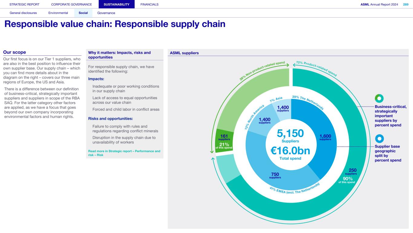 Suppliers We engage with our suppliers to help deliver our innovations. They are critical to our value chain and our ambition to be a sustainable leader in the semiconductor industry. What’s happening in their world Over recent years, the world of our suppliers has been turbulent. Geopolitical uncertainties have disrupted our supply chain due to reduced material availability and rising prices. Additionally, inflationary pressures have affected our suppliers in raw materials, energy and wages. Despite market uncertainties, suppliers are required to build up further capacity for future growth while putting pressure on cost, quality and ESG performance. Our future growth – and that of our customers – can only be met if our suppliers are capable and willing to keep up. How we respond We want to build and maintain strong business relationships with our suppliers, based on mutual trust. We listen to our suppliers when they openly share their pain points and challenges, and are implementing improvements relating to quality issues, early supplier involvement during the industrialization phase of new product introductions, reducing cycle time and cost, planning with our suppliers and ESG sustainability. Read more in Strategic report – 2024 stories – Powering technology forward with suppliers How we engage • ASML Suppliers' Day • Direct interactions via supplier account teams/ sourcing account leaders • Supplier audits • Site visits • Supplier newsletter • Responsible Business Alliance (RBA) self-assessment questionnaire (SAQ) • ASML's Speak Up Service • Knowledge sessions on ESG sustainability • ASML’s Supplier Collaboration Day STRATEGIC REPORT CORPORATE GOVERNANCE SUSTAINABILITY FINANCIALS ASML Annual Report 2024 47 At a glance Q&A with the CEO 2024 stories Our business Performance Risk Corporate conduct Engaged stakeholders (continued) Working with our suppliers By partnering closely with and supporting our suppliers, we aim to ensure that they’re prepared to work with us for years to come – and to weather the changes that the chip industry is known for, including periods of rapid growth and business-cycle fluctuations. Enabling our supply chain to grow with us toward our 2030 targets calls for an evolution in how we work with our suppliers.” Wayne Allan Executive Vice President and Chief Strategic Sourcing & Procurement Officer The top 35 of our 5,150 suppliers make up 80% of our total sourcing spend