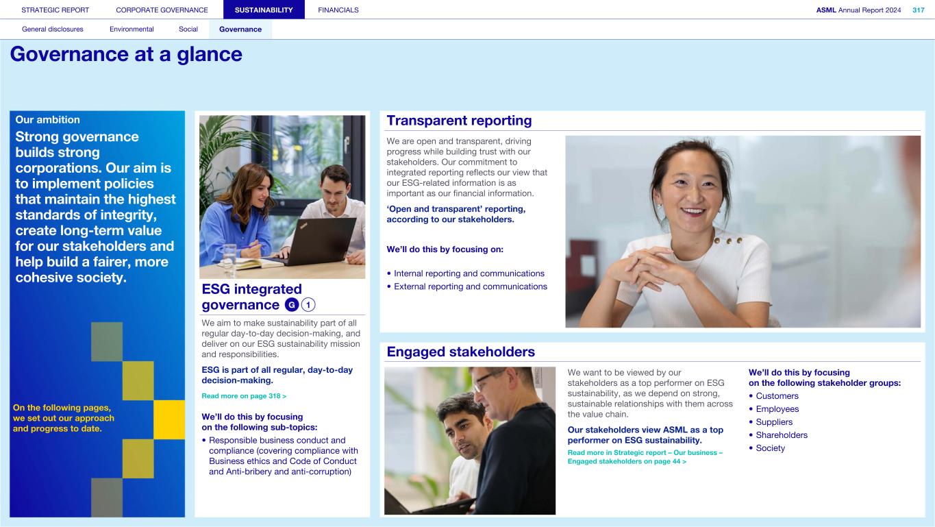Our ambition Strong governance builds strong corporations. Our aim is to implement policies that maintain the highest standards of integrity, create long-term value for our stakeholders and help build a fairer, more cohesive society. On the following pages, we set out our approach and progress to date. ESG integrated governance We aim to make sustainability part of all regular day-to-day decision-making, and deliver on our ESG sustainability mission and responsibilities. ESG is part of all regular, day-to-day decision-making. Read more on page 318 > We’ll do this by focusing on the following sub-topics: • Responsible business conduct and compliance (covering compliance with Business ethics and Code of Conduct and Anti-bribery and anti-corruption) STRATEGIC REPORT CORPORATE GOVERNANCE SUSTAINABILITY FINANCIALS ASML Annual Report 2024 317 General disclosures Environmental Social Governance Governance at a glance Transparent reporting We are open and transparent, driving progress while building trust with our stakeholders. Our commitment to integrated reporting reflects our view that our ESG-related information is as important as our financial information. ‘Open and transparent’ reporting, according to our stakeholders. We’ll do this by focusing on: • Internal reporting and communications • External reporting and communications Engaged stakeholders We want to be viewed by our stakeholders as a top performer on ESG sustainability, as we depend on strong, sustainable relationships with them across the value chain. Our stakeholders view ASML as a top performer on ESG sustainability. We’ll do this by focusing on the following stakeholder groups: • Customers • Employees • Suppliers • Shareholders • SocietyRead more in Strategic report – Our business – Engaged stakeholders on page 44 >