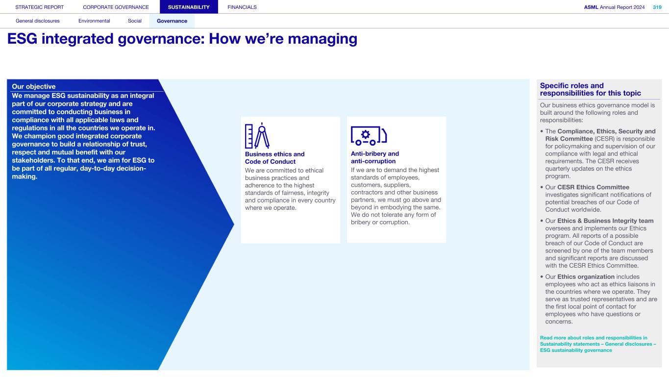 Our objective We manage ESG sustainability as an integral part of our corporate strategy and are committed to conducting business in compliance with all applicable laws and regulations in all the countries we operate in. We champion good integrated corporate governance to build a relationship of trust, respect and mutual benefit with our stakeholders. To that end, we aim for ESG to be part of all regular, day-to-day decision- making. Specific roles and responsibilities for this topic Our business ethics governance model is built around the following roles and responsibilities: • The Compliance, Ethics, Security and Risk Committee (CESR) is responsible for policymaking and supervision of our compliance with legal and ethical requirements. The CESR receives quarterly updates on the ethics program. • Our CESR Ethics Committee investigates significant notifications of potential breaches of our Code of Conduct worldwide. • Our Ethics & Business Integrity team oversees and implements our Ethics program. All reports of a possible breach of our Code of Conduct are screened by one of the team members and significant reports are discussed with the CESR Ethics Committee. • Our Ethics organization includes employees who act as ethics liaisons in the countries where we operate. They serve as trusted representatives and are the first local point of contact for employees who have questions or concerns. Read more about roles and responsibilities in Sustainability statements – General disclosures – ESG sustainability governance STRATEGIC REPORT CORPORATE GOVERNANCE SUSTAINABILITY FINANCIALS ASML Annual Report 2024 319 General disclosures Environmental Social Governance ESG integrated governance: How we’re managing Business ethics and Code of Conduct We are committed to ethical business practices and adherence to the highest standards of fairness, integrity and compliance in every country where we operate. Anti-bribery and anti-corruption If we are to demand the highest standards of employees, customers, suppliers, contractors and other business partners, we must go above and beyond in embodying the same. We do not tolerate any form of bribery or corruption.