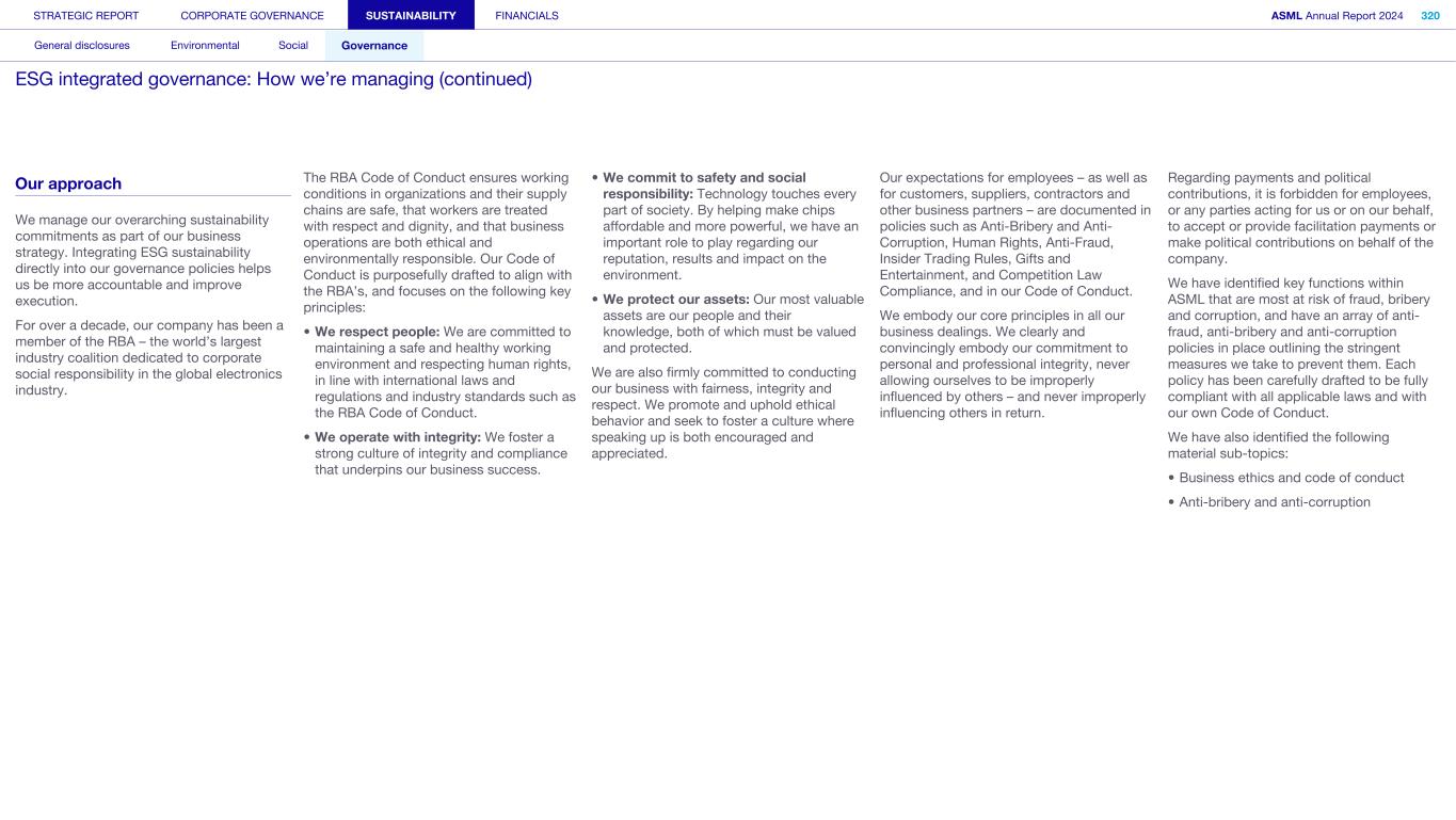 Our approach We manage our overarching sustainability commitments as part of our business strategy. Integrating ESG sustainability directly into our governance policies helps us be more accountable and improve execution. For over a decade, our company has been a member of the RBA – the world’s largest industry coalition dedicated to corporate social responsibility in the global electronics industry. The RBA Code of Conduct ensures working conditions in organizations and their supply chains are safe, that workers are treated with respect and dignity, and that business operations are both ethical and environmentally responsible. Our Code of Conduct is purposefully drafted to align with the RBA’s, and focuses on the following key principles: • We respect people: We are committed to maintaining a safe and healthy working environment and respecting human rights, in line with international laws and regulations and industry standards such as the RBA Code of Conduct. • We operate with integrity: We foster a strong culture of integrity and compliance that underpins our business success. • We commit to safety and social responsibility: Technology touches every part of society. By helping make chips affordable and more powerful, we have an important role to play regarding our reputation, results and impact on the environment. • We protect our assets: Our most valuable assets are our people and their knowledge, both of which must be valued and protected. We are also firmly committed to conducting our business with fairness, integrity and respect. We promote and uphold ethical behavior and seek to foster a culture where speaking up is both encouraged and appreciated. Our expectations for employees – as well as for customers, suppliers, contractors and other business partners – are documented in policies such as Anti-Bribery and Anti- Corruption, Human Rights, Anti-Fraud, Insider Trading Rules, Gifts and Entertainment, and Competition Law Compliance, and in our Code of Conduct. We embody our core principles in all our business dealings. We clearly and convincingly embody our commitment to personal and professional integrity, never allowing ourselves to be improperly influenced by others – and never improperly influencing others in return. Regarding payments and political contributions, it is forbidden for employees, or any parties acting for us or on our behalf, to accept or provide facilitation payments or make political contributions on behalf of the company. We have identified key functions within ASML that are most at risk of fraud, bribery and corruption, and have an array of anti- fraud, anti-bribery and anti-corruption policies in place outlining the stringent measures we take to prevent them. Each policy has been carefully drafted to be fully compliant with all applicable laws and with our own Code of Conduct. We have also identified the following material sub-topics: • Business ethics and code of conduct • Anti-bribery and anti-corruption STRATEGIC REPORT CORPORATE GOVERNANCE SUSTAINABILITY FINANCIALS ASML Annual Report 2024 320 General disclosures Environmental Social Governance ESG integrated governance: How we’re managing (continued)