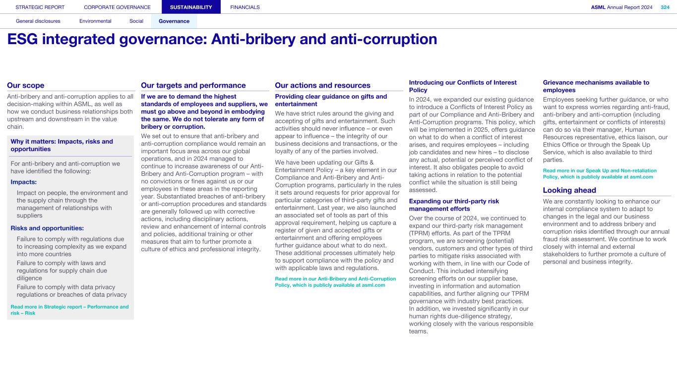 Our scope Anti-bribery and anti-corruption applies to all decision-making within ASML, as well as how we conduct business relationships both upstream and downstream in the value chain. Why it matters: Impacts, risks and opportunities For anti-bribery and anti-corruption we have identified the following: Impacts: Impact on people, the environment and the supply chain through the management of relationships with suppliers Risks and opportunities: Failure to comply with regulations due to increasing complexity as we expand into more countries F a i Failure to comply with laws and regulations for supply chain due diligence Failure to comply with data privacy regulations or breaches of data privacy Read more in Strategic report – Performance and risk – Risk Our targets and performance If we are to demand the highest standards of employees and suppliers, we must go above and beyond in embodying the same. We do not tolerate any form of bribery or corruption. We set out to ensure that anti-bribery and anti-corruption compliance would remain an important focus area across our global operations, and in 2024 managed to continue to increase awareness of our Anti- Bribery and Anti-Corruption program – with no convictions or fines against us or our employees in these areas in the reporting year. Substantiated breaches of anti-bribery or anti-corruption procedures and standards are generally followed up with corrective actions, including disciplinary actions, review and enhancement of internal controls and policies, additional training or other measures that aim to further promote a culture of ethics and professional integrity. Our actions and resources Providing clear guidance on gifts and entertainment We have strict rules around the giving and accepting of gifts and entertainment. Such activities should never influence – or even appear to influence – the integrity of our business decisions and transactions, or the loyalty of any of the parties involved. We have been updating our Gifts & Entertainment Policy – a key element in our Compliance and Anti-Bribery and Anti- Corruption programs, particularly in the rules it sets around requests for prior approval for particular categories of third-party gifts and entertainment. Last year, we also launched an associated set of tools as part of this approval requirement, helping us capture a register of given and accepted gifts or entertainment and offering employees further guidance about what to do next. These additional processes ultimately help to support compliance with the policy and with applicable laws and regulations. Read more in our Anti-Bribery and Anti-Corruption Policy, which is publicly available at asml.com Introducing our Conflicts of Interest Policy In 2024, we expanded our existing guidance to introduce a Conflicts of Interest Policy as part of our Compliance and Anti-Bribery and Anti-Corruption programs. This policy, which will be implemented in 2025, offers guidance on what to do when a conflict of interest arises, and requires employees – including job candidates and new hires – to disclose any actual, potential or perceived conflict of interest. It also obligates people to avoid taking actions in relation to the potential conflict while the situation is still being assessed. Expanding our third-party risk management efforts Over the course of 2024, we continued to expand our third-party risk management (TPRM) efforts. As part of the TPRM program, we are screening (potential) vendors, customers and other types of third parties to mitigate risks associated with working with them, in line with our Code of Conduct. This included intensifying screening efforts on our supplier base, investing in information and automation capabilities, and further aligning our TPRM governance with industry best practices. In addition, we invested significantly in our human rights due-diligence strategy, working closely with the various responsible teams. Grievance mechanisms available to employees Employees seeking further guidance, or who want to express worries regarding anti-fraud, anti-bribery and anti-corruption (including gifts, entertainment or conflicts of interests) can do so via their manager, Human Resources representative, ethics liaison, our Ethics Office or through the Speak Up Service, which is also available to third parties. Read more in our Speak Up and Non-retaliation Policy, which is publicly available at asml.com Looking ahead We are constantly looking to enhance our internal compliance system to adapt to changes in the legal and our business environment and to address bribery and corruption risks identified through our annual fraud risk assessment. We continue to work closely with internal and external stakeholders to further promote a culture of personal and business integrity. STRATEGIC REPORT CORPORATE GOVERNANCE SUSTAINABILITY FINANCIALS ASML Annual Report 2024 324 General disclosures Environmental Social Governance ESG integrated governance: Anti-bribery and anti-corruption