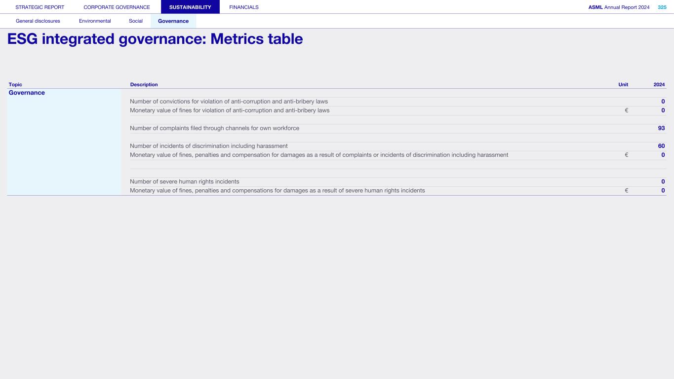 Topic Description Unit 2024 Governance Number of convictions for violation of anti-corruption and anti-bribery laws 0 Monetary value of fines for violation of anti-corruption and anti-bribery laws € 0 Number of complaints filed through channels for own workforce 93 Number of incidents of discrimination including harassment 60 Monetary value of fines, penalties and compensation for damages as a result of complaints or incidents of discrimination including harassment € 0 Number of severe human rights incidents 0 Monetary value of fines, penalties and compensations for damages as a result of severe human rights incidents € 0 STRATEGIC REPORT CORPORATE GOVERNANCE SUSTAINABILITY FINANCIALS ASML Annual Report 2024 325 General disclosures Environmental Social Governance ESG integrated governance: Metrics table
