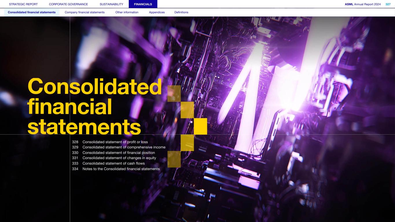 STRATEGIC REPORT CORPORATE GOVERNANCE SUSTAINABILITY FINANCIALS ASML Annual Report 2024 327 Consolidated financial statements Company financial statements Other information Appendices Definitions 328 Consolidated statement of profit or loss 329 Consolidated statement of comprehensive income 330 Consolidated statement of financial position 331 Consolidated statement of changes in equity 333 Consolidated statement of cash flows 334 Notes to the Consolidated financial statements Consolidated financial statements