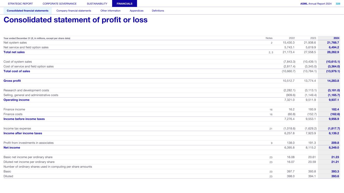 Net system sales 2 15,430.3 21,938.6 21,768.7 Net service and field option sales 5,743.1 5,619.9 6,494.2 Total net sales 2, 3 21,173.4 27,558.5 28,262.9 Cost of system sales (7,843.3) (10,439.1) (10,615.1) Cost of service and field option sales (2,817.4) (3,345.0) (3,364.0) Total cost of sales (10,660.7) (13,784.1) (13,979.1) Gross profit 10,512.7 13,774.4 14,283.8 Research and development costs (2,282.1) (3,113.1) (3,181.0) Selling, general and administrative costs (909.6) (1,149.4) (1,165.7) Operating income 7,321.0 9,511.9 9,937.1 Finance income 16 16.2 193.9 182.4 Finance costs 16 (60.8) (152.7) (162.6) Income before income taxes 7,276.4 9,553.1 9,956.9 Income tax expense 21 (1,018.6) (1,629.2) (1,817.7) Income after income taxes 6,257.8 7,923.9 8,139.2 Profit from investments in associates 9 138.0 191.3 209.8 Net income 6,395.8 8,115.2 8,349.0 Basic net income per ordinary share 23 16.08 20.61 21.23 Diluted net income per ordinary share 23 16.07 20.59 21.21 Number of ordinary shares used in computing per share amounts Basic 23 397.7 393.8 393.3 Diluted 23 398.0 394.1 393.6 Year ended December 31 (€, in millions, except per share data) Notes 2022 2023 2024 STRATEGIC REPORT CORPORATE GOVERNANCE SUSTAINABILITY FINANCIALS ASML Annual Report 2024 328 Consolidated financial statements Company financial statements Other information Appendices Definitions Consolidated statement of profit or loss