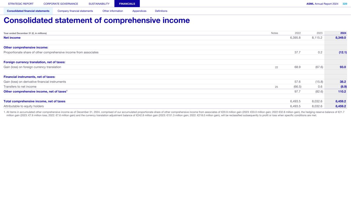 Year ended December 31 (€, in millions) Notes 2022 2023 2024 Net income 6,395.8 8,115.2 8,349.0 Other comprehensive income: Proportionate share of other comprehensive income from associates 37.7 0.2 (12.1) Foreign currency translation, net of taxes: Gain (loss) on foreign currency translation 22 68.9 (67.6) 93.0 Financial instruments, net of taxes: Gain (loss) on derivative financial instruments 57.6 (15.8) 38.2 Transfers to net income 25 (66.5) 0.6 (8.9) Other comprehensive income, net of taxes1 97.7 (82.6) 110.2 Total comprehensive income, net of taxes 6,493.5 8,032.6 8,459.2 Attributable to equity holders 6,493.5 8,032.6 8,459.2 1. All items in accumulated other comprehensive income as of December 31, 2024, comprised of our accumulated proportionate share of other comprehensive income from associates of €20.9 million gain (2023: €33.0 million gain; 2022 €32.8 million gain), the hedging reserve balance of €21.7 million gain (2023: €7.6 million loss; 2022: €7.6 million gain) and the currency translation adjustment balance of €242.8 million gain (2023: €151.3 million gain; 2022: €218.0 million gain), will be reclassified subsequently to profit or loss when specific conditions are met. STRATEGIC REPORT CORPORATE GOVERNANCE SUSTAINABILITY FINANCIALS ASML Annual Report 2024 329 Consolidated financial statements Company financial statements Other information Appendices Definitions Consolidated statement of comprehensive income