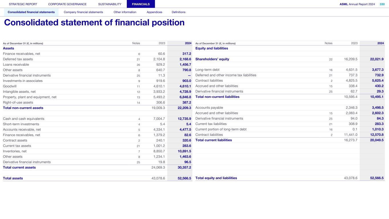 Assets Finance receivables, net 6 60.6 317.2 Deferred tax assets 21 2,104.8 2,168.6 Loans receivable 26 929.2 1,456.7 Other assets 8 640.7 790.8 Derivative financial instruments 25 11.3 — Investments in associates 9 919.6 903.0 Goodwill 11 4,610.1 4,610.1 Intangible assets, net 12 3,933.2 4,728.9 Property, plant and equipment, net 13 5,493.2 6,846.8 Right-of-use assets 14 306.6 387.2 Total non-current assets 19,009.3 22,209.3 Cash and cash equivalents 4 7,004.7 12,735.9 Short-term investments 4 5.4 5.4 Accounts receivable, net 5 4,334.1 4,477.5 Finance receivables, net 6 1,379.2 82.6 Contract assets 2 240.1 320.6 Current tax assets 21 1,001.2 283.6 Inventories, net 7 8,850.7 10,891.5 Other assets 8 1,234.1 1,463.6 Derivative financial instruments 25 19.8 96.5 Total current assets 24,069.3 30,357.2 Total assets 43,078.6 52,566.5 As of December 31 (€, in millions) Notes 2023 2024 Equity and liabilities Shareholders’ equity 22 16,209.5 22,021.9 Long-term debt 16 4,631.5 3,677.3 Deferred and other income tax liabilities 21 737.3 732.9 Contract liabilities 2 4,825.5 5,625.4 Accrued and other liabilities 15 338.4 430.2 Derivative financial instruments 25 62.7 29.3 Total non-current liabilities 10,595.4 10,495.1 Accounts payable 2,346.3 3,498.5 Accrued and other liabilities 15 2,083.4 2,602.3 Derivative financial instruments 25 94.0 84.3 Current tax liabilities 21 308.9 283.3 Current portion of long-term debt 16 0.1 1,010.3 Contract liabilities 2 11,441.0 12,570.8 Total current liabilities 16,273.7 20,049.5 Total equity and liabilities 43,078.6 52,566.5 As of December 31 (€, in millions) Notes 2023 2024 STRATEGIC REPORT CORPORATE GOVERNANCE SUSTAINABILITY FINANCIALS ASML Annual Report 2024 330 Consolidated financial statements Company financial statements Other information Appendices Definitions Consolidated statement of financial position