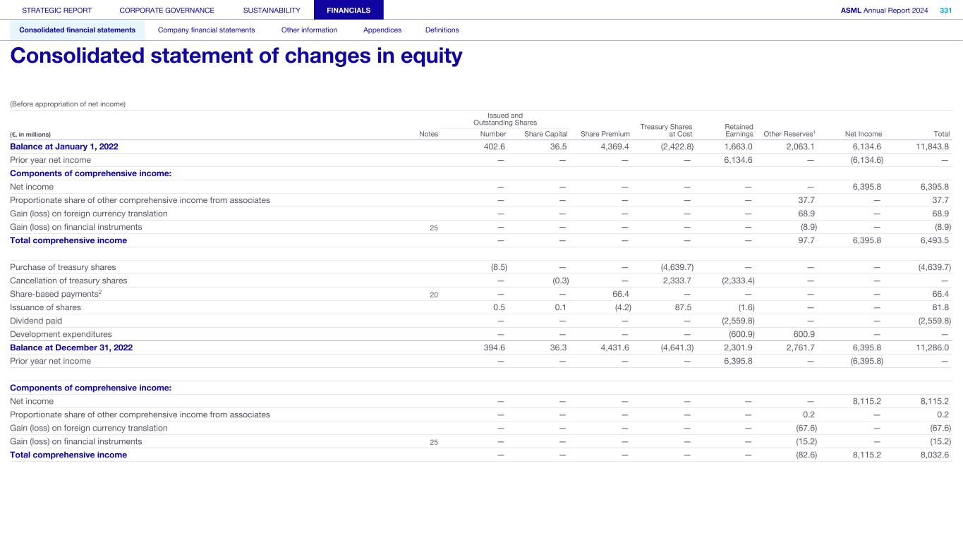 (Before appropriation of net income) Balance at January 1, 2022 402.6 36.5 4,369.4 (2,422.8) 1,663.0 2,063.1 6,134.6 11,843.8 Prior year net income — — — — 6,134.6 — (6,134.6) — Components of comprehensive income: Net income — — — — — — 6,395.8 6,395.8 Proportionate share of other comprehensive income from associates — — — — — 37.7 — 37.7 Gain (loss) on foreign currency translation — — — — — 68.9 — 68.9 Gain (loss) on financial instruments 25 — — — — — (8.9) — (8.9) Total comprehensive income — — — — — 97.7 6,395.8 6,493.5 Purchase of treasury shares (8.5) — — (4,639.7) — — — (4,639.7) Cancellation of treasury shares — (0.3) — 2,333.7 (2,333.4) — — — Share-based payments2 20 — — 66.4 — — — — 66.4 Issuance of shares 0.5 0.1 (4.2) 87.5 (1.6) — — 81.8 Dividend paid — — — — (2,559.8) — — (2,559.8) Development expenditures — — — — (600.9) 600.9 — — Balance at December 31, 2022 394.6 36.3 4,431.6 (4,641.3) 2,301.9 2,761.7 6,395.8 11,286.0 Prior year net income — — — — 6,395.8 — (6,395.8) — Components of comprehensive income: Net income — — — — — — 8,115.2 8,115.2 Proportionate share of other comprehensive income from associates — — — — — 0.2 — 0.2 Gain (loss) on foreign currency translation — — — — — (67.6) — (67.6) Gain (loss) on financial instruments 25 — — — — — (15.2) — (15.2) Total comprehensive income — — — — — (82.6) 8,115.2 8,032.6 Issued and Outstanding Shares Share Premium Treasury Shares at Cost Retained Earnings Other Reserves1 Net Income Total(€, in millions) Notes Number Share Capital STRATEGIC REPORT CORPORATE GOVERNANCE SUSTAINABILITY FINANCIALS ASML Annual Report 2024 331 Consolidated financial statements Company financial statements Other information Appendices Definitions Consolidated statement of changes in equity