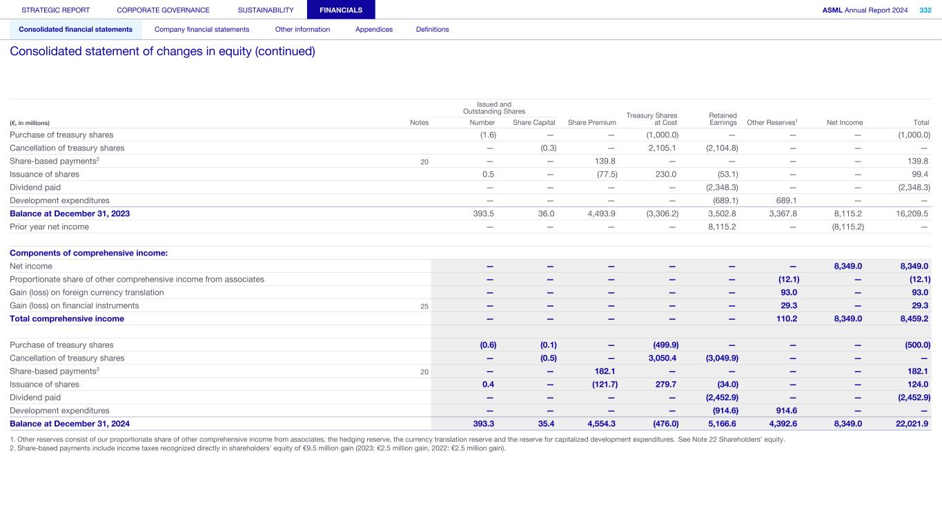 Purchase of treasury shares (1.6) — — (1,000.0) — — — (1,000.0) Cancellation of treasury shares — (0.3) — 2,105.1 (2,104.8) — — — Share-based payments2 20 — — 139.8 — — — — 139.8 Issuance of shares 0.5 — (77.5) 230.0 (53.1) — — 99.4 Dividend paid — — — — (2,348.3) — — (2,348.3) Development expenditures — — — — (689.1) 689.1 — — Balance at December 31, 2023 393.5 36.0 4,493.9 (3,306.2) 3,502.8 3,367.8 8,115.2 16,209.5 Prior year net income — — — — 8,115.2 — (8,115.2) — Components of comprehensive income: Net income — — — — — — 8,349.0 8,349.0 Proportionate share of other comprehensive income from associates — — — — — (12.1) — (12.1) Gain (loss) on foreign currency translation — — — — — 93.0 — 93.0 Gain (loss) on financial instruments 25 — — — — — 29.3 — 29.3 Total comprehensive income — — — — — 110.2 8,349.0 8,459.2 Purchase of treasury shares (0.6) (0.1) — (499.9) — — — (500.0) Cancellation of treasury shares — (0.5) — 3,050.4 (3,049.9) — — — Share-based payments2 20 — — 182.1 — — — — 182.1 Issuance of shares 0.4 — (121.7) 279.7 (34.0) — — 124.0 Dividend paid — — — — (2,452.9) — — (2,452.9) Development expenditures — — — — (914.6) 914.6 — — Balance at December 31, 2024 393.3 35.4 4,554.3 (476.0) 5,166.6 4,392.6 8,349.0 22,021.9 Issued and Outstanding Shares Share Premium Treasury Shares at Cost Retained Earnings Other Reserves1 Net Income Total(€, in millions) Notes Number Share Capital 1. Other reserves consist of our proportionate share of other comprehensive income from associates, the hedging reserve, the currency translation reserve and the reserve for capitalized development expenditures. See Note 22 Shareholders’ equity. 2. Share-based payments include income taxes recognized directly in shareholders' equity of €9.5 million gain (2023: €2.5 million gain, 2022: €2.5 million gain). STRATEGIC REPORT CORPORATE GOVERNANCE SUSTAINABILITY FINANCIALS ASML Annual Report 2024 332 Consolidated financial statements Company financial statements Other information Appendices Definitions Consolidated statement of changes in equity (continued)