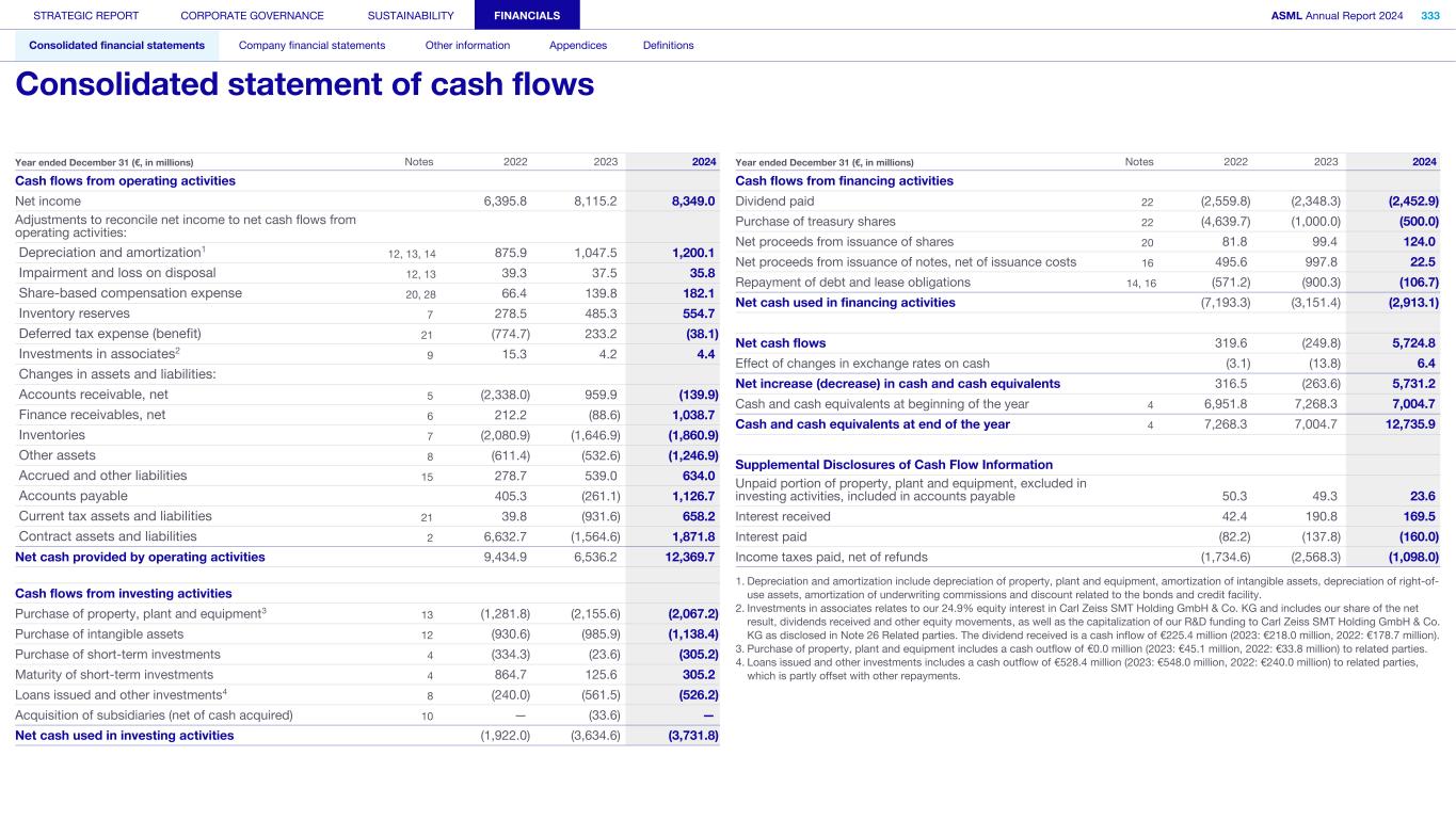 Cash flows from operating activities Net income 6,395.8 8,115.2 8,349.0 Adjustments to reconcile net income to net cash flows from operating activities: Depreciation and amortization1 12, 13, 14 875.9 1,047.5 1,200.1 Impairment and loss on disposal 12, 13 39.3 37.5 35.8 Share-based compensation expense 20, 28 66.4 139.8 182.1 Inventory reserves 7 278.5 485.3 554.7 Deferred tax expense (benefit) 21 (774.7) 233.2 (38.1) Investments in associates2 9 15.3 4.2 4.4 Changes in assets and liabilities: Accounts receivable, net 5 (2,338.0) 959.9 (139.9) Finance receivables, net 6 212.2 (88.6) 1,038.7 Inventories 7 (2,080.9) (1,646.9) (1,860.9) Other assets 8 (611.4) (532.6) (1,246.9) Accrued and other liabilities 15 278.7 539.0 634.0 Accounts payable 405.3 (261.1) 1,126.7 Current tax assets and liabilities 21 39.8 (931.6) 658.2 Contract assets and liabilities 2 6,632.7 (1,564.6) 1,871.8 Net cash provided by operating activities 9,434.9 6,536.2 12,369.7 Cash flows from investing activities Purchase of property, plant and equipment3 13 (1,281.8) (2,155.6) (2,067.2) Purchase of intangible assets 12 (930.6) (985.9) (1,138.4) Purchase of short-term investments 4 (334.3) (23.6) (305.2) Maturity of short-term investments 4 864.7 125.6 305.2 Loans issued and other investments4 8 (240.0) (561.5) (526.2) Acquisition of subsidiaries (net of cash acquired) 10 — (33.6) — Net cash used in investing activities (1,922.0) (3,634.6) (3,731.8) Year ended December 31 (€, in millions) Notes 2022 2023 2024 Cash flows from financing activities Dividend paid 22 (2,559.8) (2,348.3) (2,452.9) Purchase of treasury shares 22 (4,639.7) (1,000.0) (500.0) Net proceeds from issuance of shares 20 81.8 99.4 124.0 Net proceeds from issuance of notes, net of issuance costs 16 495.6 997.8 22.5 Repayment of debt and lease obligations 14, 16 (571.2) (900.3) (106.7) Net cash used in financing activities (7,193.3) (3,151.4) (2,913.1) Net cash flows 319.6 (249.8) 5,724.8 Effect of changes in exchange rates on cash (3.1) (13.8) 6.4 Net increase (decrease) in cash and cash equivalents 316.5 (263.6) 5,731.2 Cash and cash equivalents at beginning of the year 4 6,951.8 7,268.3 7,004.7 Cash and cash equivalents at end of the year 4 7,268.3 7,004.7 12,735.9 Supplemental Disclosures of Cash Flow Information Unpaid portion of property, plant and equipment, excluded in investing activities, included in accounts payable 50.3 49.3 23.6 Interest received 42.4 190.8 169.5 Interest paid (82.2) (137.8) (160.0) Income taxes paid, net of refunds (1,734.6) (2,568.3) (1,098.0) Year ended December 31 (€, in millions) Notes 2022 2023 2024 1. Depreciation and amortization include depreciation of property, plant and equipment, amortization of intangible assets, depreciation of right-of- use assets, amortization of underwriting commissions and discount related to the bonds and credit facility. 2. Investments in associates relates to our 24.9% equity interest in Carl Zeiss SMT Holding GmbH & Co. KG and includes our share of the net result, dividends received and other equity movements, as well as the capitalization of our R&D funding to Carl Zeiss SMT Holding GmbH & Co. KG as disclosed in Note 26 Related parties. The dividend received is a cash inflow of €225.4 million (2023: €218.0 million, 2022: €178.7 million). 3. Purchase of property, plant and equipment includes a cash outflow of €0.0 million (2023: €45.1 million, 2022: €33.8 million) to related parties. 4. Loans issued and other investments includes a cash outflow of €528.4 million (2023: €548.0 million, 2022: €240.0 million) to related parties, which is partly offset with other repayments. STRATEGIC REPORT CORPORATE GOVERNANCE SUSTAINABILITY FINANCIALS ASML Annual Report 2024 333 Consolidated financial statements Company financial statements Other information Appendices Definitions Consolidated statement of cash flows