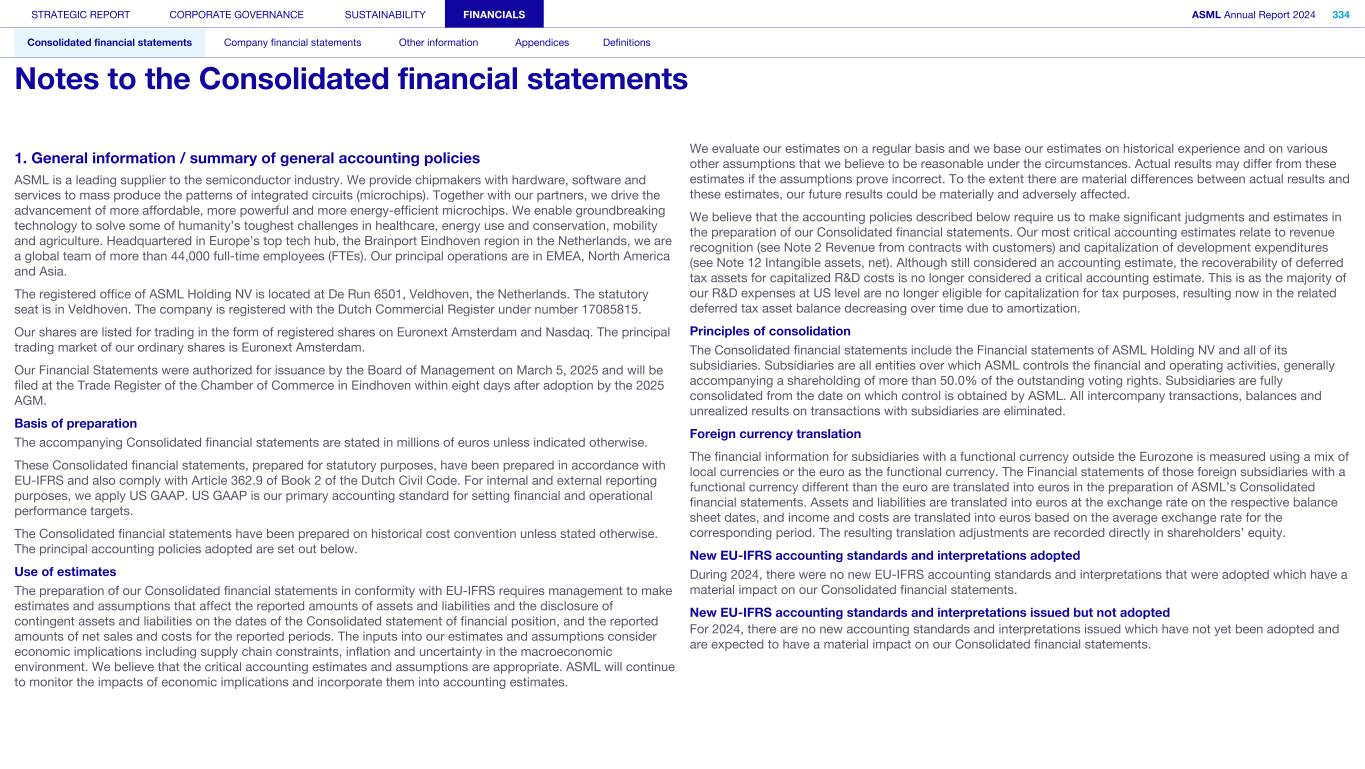 1. General information / summary of general accounting policies ASML is a leading supplier to the semiconductor industry. We provide chipmakers with hardware, software and services to mass produce the patterns of integrated circuits (microchips). Together with our partners, we drive the advancement of more affordable, more powerful and more energy-efficient microchips. We enable groundbreaking technology to solve some of humanity’s toughest challenges in healthcare, energy use and conservation, mobility and agriculture. Headquartered in Europe’s top tech hub, the Brainport Eindhoven region in the Netherlands, we are a global team of more than 44,000 full-time employees (FTEs). Our principal operations are in EMEA, North America and Asia. The registered office of ASML Holding NV is located at De Run 6501, Veldhoven, the Netherlands. The statutory seat is in Veldhoven. The company is registered with the Dutch Commercial Register under number 17085815. Our shares are listed for trading in the form of registered shares on Euronext Amsterdam and Nasdaq. The principal trading market of our ordinary shares is Euronext Amsterdam. Our Financial Statements were authorized for issuance by the Board of Management on March 5, 2025 and will be filed at the Trade Register of the Chamber of Commerce in Eindhoven within eight days after adoption by the 2025 AGM. Basis of preparation The accompanying Consolidated financial statements are stated in millions of euros unless indicated otherwise. These Consolidated financial statements, prepared for statutory purposes, have been prepared in accordance with EU-IFRS and also comply with Article 362.9 of Book 2 of the Dutch Civil Code. For internal and external reporting purposes, we apply US GAAP. US GAAP is our primary accounting standard for setting financial and operational performance targets. The Consolidated financial statements have been prepared on historical cost convention unless stated otherwise. The principal accounting policies adopted are set out below. Use of estimates The preparation of our Consolidated financial statements in conformity with EU-IFRS requires management to make estimates and assumptions that affect the reported amounts of assets and liabilities and the disclosure of contingent assets and liabilities on the dates of the Consolidated statement of financial position, and the reported amounts of net sales and costs for the reported periods. The inputs into our estimates and assumptions consider economic implications including supply chain constraints, inflation and uncertainty in the macroeconomic environment. We believe that the critical accounting estimates and assumptions are appropriate. ASML will continue to monitor the impacts of economic implications and incorporate them into accounting estimates. We evaluate our estimates on a regular basis and we base our estimates on historical experience and on various other assumptions that we believe to be reasonable under the circumstances. Actual results may differ from these estimates if the assumptions prove incorrect. To the extent there are material differences between actual results and these estimates, our future results could be materially and adversely affected. We believe that the accounting policies described below require us to make significant judgments and estimates in the preparation of our Consolidated financial statements. Our most critical accounting estimates relate to revenue recognition (see Note 2 Revenue from contracts with customers) and capitalization of development expenditures (see Note 12 Intangible assets, net). Although still considered an accounting estimate, the recoverability of deferred tax assets for capitalized R&D costs is no longer considered a critical accounting estimate. This is as the majority of our R&D expenses at US level are no longer eligible for capitalization for tax purposes, resulting now in the related deferred tax asset balance decreasing over time due to amortization. Principles of consolidation The Consolidated financial statements include the Financial statements of ASML Holding NV and all of its subsidiaries. Subsidiaries are all entities over which ASML controls the financial and operating activities, generally accompanying a shareholding of more than 50.0% of the outstanding voting rights. Subsidiaries are fully consolidated from the date on which control is obtained by ASML. All intercompany transactions, balances and unrealized results on transactions with subsidiaries are eliminated. Foreign currency translation The financial information for subsidiaries with a functional currency outside the Eurozone is measured using a mix of local currencies or the euro as the functional currency. The Financial statements of those foreign subsidiaries with a functional currency different than the euro are translated into euros in the preparation of ASML’s Consolidated financial statements. Assets and liabilities are translated into euros at the exchange rate on the respective balance sheet dates, and income and costs are translated into euros based on the average exchange rate for the corresponding period. The resulting translation adjustments are recorded directly in shareholders’ equity. New EU-IFRS accounting standards and interpretations adopted During 2024, there were no new EU-IFRS accounting standards and interpretations that were adopted which have a material impact on our Consolidated financial statements. New EU-IFRS accounting standards and interpretations issued but not adopted For 2024, there are no new accounting standards and interpretations issued which have not yet been adopted and are expected to have a material impact on our Consolidated financial statements. STRATEGIC REPORT CORPORATE GOVERNANCE SUSTAINABILITY FINANCIALS ASML Annual Report 2024 334 Consolidated financial statements Company financial statements Other information Appendices Definitions Notes to the Consolidated financial statements