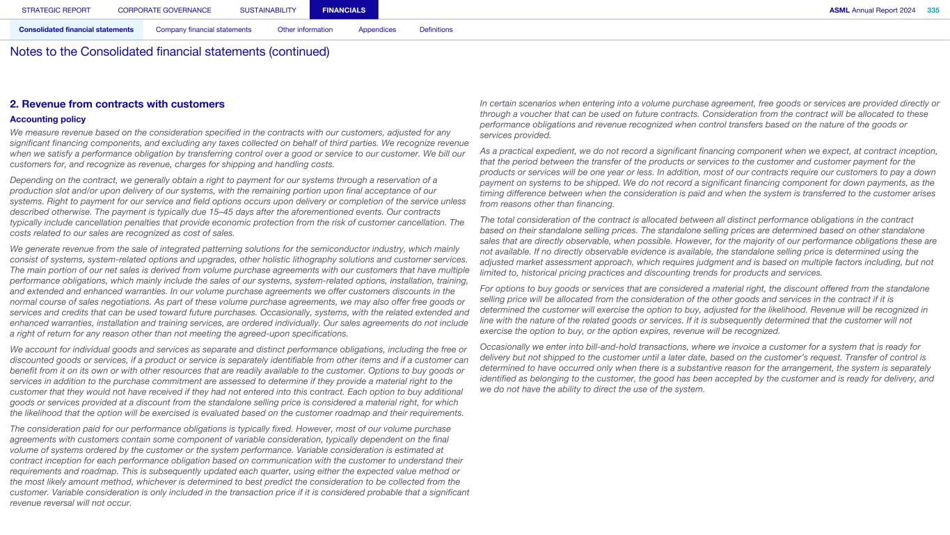 2. Revenue from contracts with customers Accounting policy We measure revenue based on the consideration specified in the contracts with our customers, adjusted for any significant financing components, and excluding any taxes collected on behalf of third parties. We recognize revenue when we satisfy a performance obligation by transferring control over a good or service to our customer. We bill our customers for, and recognize as revenue, charges for shipping and handling costs. Depending on the contract, we generally obtain a right to payment for our systems through a reservation of a production slot and/or upon delivery of our systems, with the remaining portion upon final acceptance of our systems. Right to payment for our service and field options occurs upon delivery or completion of the service unless described otherwise. The payment is typically due 15–45 days after the aforementioned events. Our contracts typically include cancellation penalties that provide economic protection from the risk of customer cancellation. The costs related to our sales are recognized as cost of sales. We generate revenue from the sale of integrated patterning solutions for the semiconductor industry, which mainly consist of systems, system-related options and upgrades, other holistic lithography solutions and customer services. The main portion of our net sales is derived from volume purchase agreements with our customers that have multiple performance obligations, which mainly include the sales of our systems, system-related options, installation, training, and extended and enhanced warranties. In our volume purchase agreements we offer customers discounts in the normal course of sales negotiations. As part of these volume purchase agreements, we may also offer free goods or services and credits that can be used toward future purchases. Occasionally, systems, with the related extended and enhanced warranties, installation and training services, are ordered individually. Our sales agreements do not include a right of return for any reason other than not meeting the agreed-upon specifications. We account for individual goods and services as separate and distinct performance obligations, including the free or discounted goods or services, if a product or service is separately identifiable from other items and if a customer can benefit from it on its own or with other resources that are readily available to the customer. Options to buy goods or services in addition to the purchase commitment are assessed to determine if they provide a material right to the customer that they would not have received if they had not entered into this contract. Each option to buy additional goods or services provided at a discount from the standalone selling price is considered a material right, for which the likelihood that the option will be exercised is evaluated based on the customer roadmap and their requirements. The consideration paid for our performance obligations is typically fixed. However, most of our volume purchase agreements with customers contain some component of variable consideration, typically dependent on the final volume of systems ordered by the customer or the system performance. Variable consideration is estimated at contract inception for each performance obligation based on communication with the customer to understand their requirements and roadmap. This is subsequently updated each quarter, using either the expected value method or the most likely amount method, whichever is determined to best predict the consideration to be collected from the customer. Variable consideration is only included in the transaction price if it is considered probable that a significant revenue reversal will not occur. In certain scenarios when entering into a volume purchase agreement, free goods or services are provided directly or through a voucher that can be used on future contracts. Consideration from the contract will be allocated to these performance obligations and revenue recognized when control transfers based on the nature of the goods or services provided. As a practical expedient, we do not record a significant financing component when we expect, at contract inception, that the period between the transfer of the products or services to the customer and customer payment for the products or services will be one year or less. In addition, most of our contracts require our customers to pay a down payment on systems to be shipped. We do not record a significant financing component for down payments, as the timing difference between when the consideration is paid and when the system is transferred to the customer arises from reasons other than financing. The total consideration of the contract is allocated between all distinct performance obligations in the contract based on their standalone selling prices. The standalone selling prices are determined based on other standalone sales that are directly observable, when possible. However, for the majority of our performance obligations these are not available. If no directly observable evidence is available, the standalone selling price is determined using the adjusted market assessment approach, which requires judgment and is based on multiple factors including, but not limited to, historical pricing practices and discounting trends for products and services. For options to buy goods or services that are considered a material right, the discount offered from the standalone selling price will be allocated from the consideration of the other goods and services in the contract if it is determined the customer will exercise the option to buy, adjusted for the likelihood. Revenue will be recognized in line with the nature of the related goods or services. If it is subsequently determined that the customer will not exercise the option to buy, or the option expires, revenue will be recognized. Occasionally we enter into bill-and-hold transactions, where we invoice a