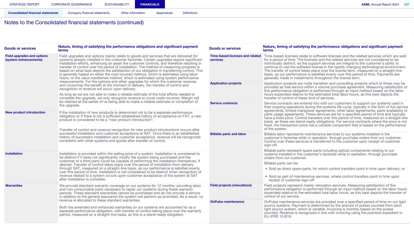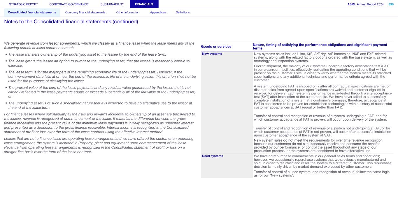 We generate revenue from lessor agreements, which we classify as a finance lease when the lease meets any of the following criteria at lease commencement: • The lease transfers ownership of the underlying asset to the lessee by the end of the lease term; • The lease grants the lessee an option to purchase the underlying asset, that the lessee is reasonably certain to exercise; • The lease term is for the major part of the remaining economic life of the underlying asset. However, if the commencement date falls at or near the end of the economic life of the underlying asset, this criterion shall not be used for the purposes of classifying the lease; • The present value of the sum of the lease payments and any residual value guaranteed by the lessee that is not already reflected in the lease payments equals or exceeds substantially all of the fair value of the underlying asset; or • The underlying asset is of such a specialized nature that it is expected to have no alternative use to the lessor at the end of the lease term. For finance leases where substantially all the risks and rewards incidental to ownership of an asset are transferred to the lessee, revenue is recognized at commencement of the lease. If material, the difference between the gross finance receivable and the present value of the minimum lease payments is initially recognized as unearned interest and presented as a deduction to the gross finance receivable. Interest income is recognized in the Consolidated statement of profit or loss over the term of the lease contract using the effective interest method. Leases that are not a finance lease are operating lease arrangements. If we have offered the customer an operating lease arrangement, the system is included in Property, plant and equipment upon commencement of the lease. Revenue from operating lease arrangements is recognized in the Consolidated statement of profit or loss on a straight-line basis over the term of the lease contract. New systems New systems sales include i-line, KrF, ArF dry, ArF immersion, NXE and EXE-related systems, along with the related factory options ordered with the base system, as well as metrology and inspection systems. Prior to shipment, the majority of our systems undergo a factory acceptance test (FAT) in our cleanroom facilities, effectively replicating the operating conditions that will be present on the customer’s site, in order to verify whether the system meets its standard specifications and any additional technical and performance criteria agreed with the customer. A system undergoing FAT is shipped only after all contractual specifications are met or discrepancies from agreed-upon specifications are waived and customer sign-off is received for delivery. Each system’s performance is re-tested through a site acceptance test (SAT) after installation at the customer site. We have never failed to successfully complete installation of a system at a customer’s premises; therefore, acceptance at FAT is considered to be proven for established technologies with a history of successful customer acceptances at SAT (equal or better than FAT). Transfer of control and recognition of revenue of a system undergoing a FAT, and for which customer acceptance at FAT is proven, will occur upon delivery of the system. Transfer of control and recognition of revenue of a system not undergoing a FAT, or for which customer acceptance at FAT is not proven, will occur after successful installation upon customer acceptance of the system at SAT. New system sales do not meet the requirements for over time revenue recognition because our customers do not simultaneously receive and consume the benefits provided by our performance, or control the asset throughout any stage of our production process, or the systems are considered to have alternative use. Used systems We have no repurchase commitments in our general sales terms and conditions; however, we occasionally repurchase systems that we previously manufactured and sold, in order to refurbish and resell the system to a different customer. This repurchase decision is mainly driven by market demand expressed by other customers. Transfer of control of a used system, and recognition of revenue, follow the same logic as for our ‘New systems’. Goods or services Nature, timing of satisfying the performance obligations and significant payment terms STRATEGIC REPORT CORPORATE GOVERNANCE SUSTAINABILITY FINANCIALS ASML Annual Report 2024 336 Consolidated financial statements Company financial statements Other information Appendices Definitions Notes to the Consolidated financial statements (continued)