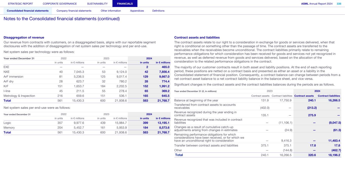 Disaggregation of revenue Our revenue from contracts with customers, on a disaggregated basis, aligns with our reportable segment disclosures with the addition of disaggregation of net system sales per technology and per end-use. Net system sales per technology were as follows: Year ended December 31 2022 2023 2024 in units in € millions in units in € millions in units in € millions EXE — — — — 2 465.0 NXE 40 7,045.3 53 9,124.0 42 7,856.4 ArF immersion 81 5,236.5 125 9,017.4 129 9,667.0 ArF dry 28 623.7 32 780.2 28 774.4 KrF 151 1,653.7 184 2,202.5 152 1,991.2 I-line 45 211.5 55 278.4 65 369.2 Metrology & Inspection 216 659.6 151 536.1 165 645.5 Total 561 15,430.3 600 21,938.6 583 21,768.7 Net system sales per end-use were as follows: Year ended December 31 2022 2023 2024 in units in € millions in units in € millions in units in € millions Logic 357 9,977.6 439 15,984.7 399 13,195.1 Memory 204 5,452.7 161 5,953.9 184 8,573.6 Total 561 15,430.3 600 21,938.6 583 21,768.7 Contract assets and liabilities The contract assets relate to our right to a consideration in exchange for goods or services delivered, when that right is conditional on something other than the passage of time. The contract assets are transferred to the receivables when the receivables become unconditional. The contract liabilities primarily relate to remaining performance obligations for which consideration has been received for goods and services not yet recognized in revenue, as well as deferred revenue from goods and services delivered, based on the allocation of the consideration to the related performance obligations in the contract. The majority of our customer contracts result in both asset and liability positions. At the end of each reporting period, these positions are netted on a contract basis and presented as either an asset or a liability in the Consolidated statement of financial position. Consequently, a contract balance can change between periods from a net contract asset balance to a net contract liability balance in the balance sheet, and vice versa. Significant changes in the contract assets and the contract liabilities balances during the periods are as follows. Year ended December 31 (€, in millions) 2023 2024 Contract assets Contract liabilities Contract assets Contract liabilities Balance at beginning of the year 131.9 17,750.9 240.1 16,266.5 Transferred from contract assets to accounts receivables (402.0) — (213.2) — Revenue recognized during the year ending in contract assets 135.1 — 275.9 — Revenue recognized that was included in contract liabilities — (11,106.1) — (9,047.5) Changes as a result of cumulative catch-up adjustments arising from changes in estimates — (24.9) — (61.3) Remaining performance obligations for which considerations have been received, or for which we have an unconditional right to consideration — 9,416.3 — 11,483.4 Transfer between contract assets and liabilities 375.1 375.1 17.8 17.8 Other — (144.8) — (462.7) Total 240.1 16,266.5 320.6 18,196.2 STRATEGIC REPORT CORPORATE GOVERNANCE SUSTAINABILITY FINANCIALS ASML Annual Report 2024 338 Consolidated financial statements Company financial statements Other information Appendices Definitions Notes to the Consolidated financial statements (continued)